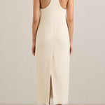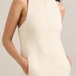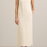 A Emery Avril Dress in Natural. Structured yet airy, the Avril Dress is crafted from heavyweight Italian cotton. Its flowing silhouette, adjustable invisible-zip neckline and raw hem bring texture and versatility. Perfect for layering or warmer days.