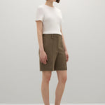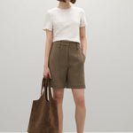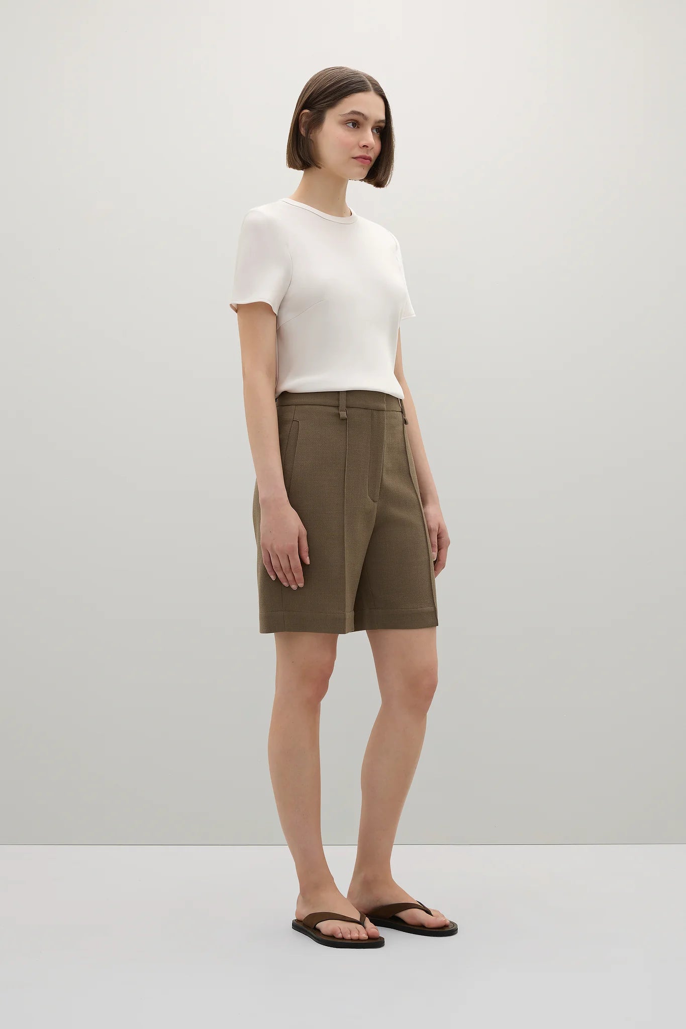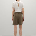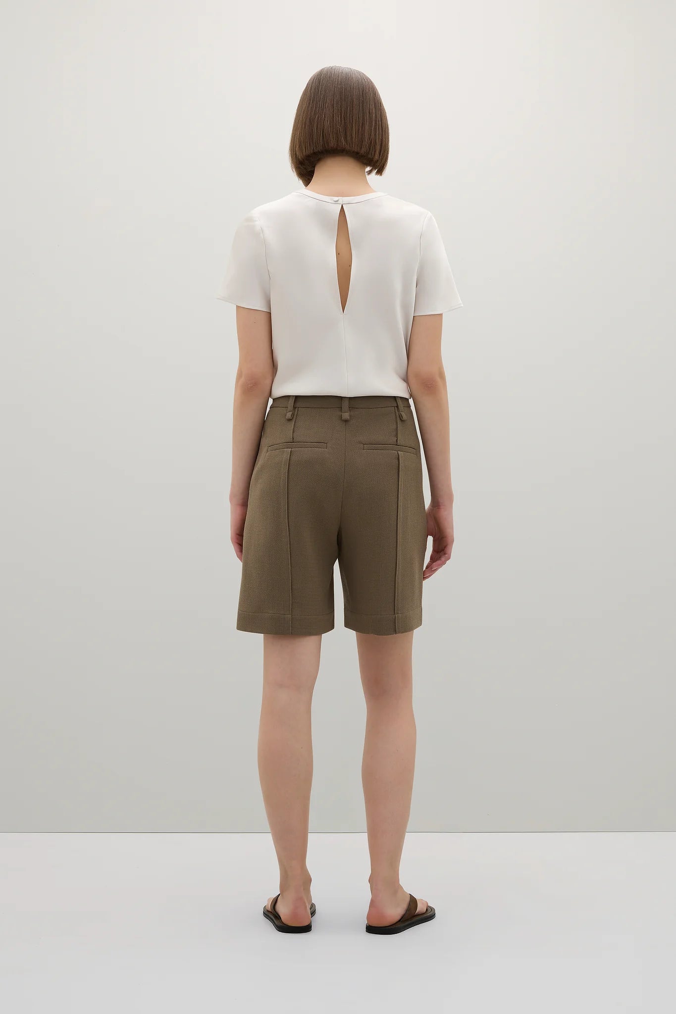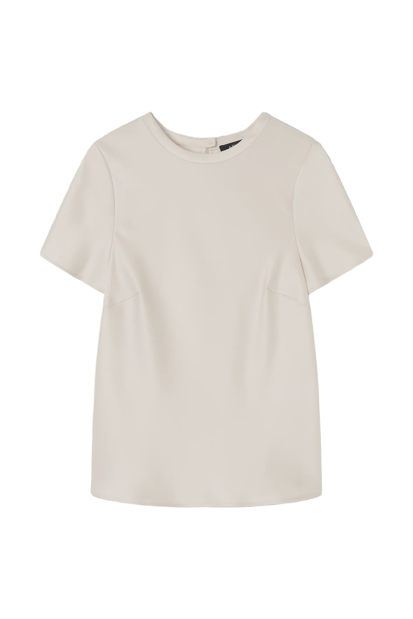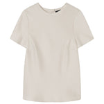 A Emery Arca Top in Oyster. Crafted from premium Japanese triacetate, the Arca top is an elevated T-shirt style with a short sleeve, button closure at the back of the neck, and cut on the bias for a universally flattering fit.