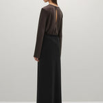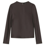 A Emery Arden Top in Umber. The Arden Top is a long sleeve top crafted from Japanese triacetate and cut on the bias to drape effortlessly on the body. A back slit detail elevates this style with a single button closure at the nape of the neck.