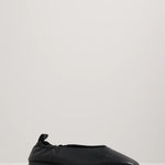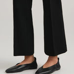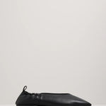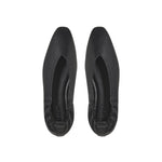 A Emery Brie Flat in Black. The Brie Flat is a minimal flat elevated by an elongated silhouette with a squared almond toe, this style sits atop a comfortable padded insole footbed with a gathered elasticated back.