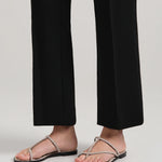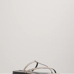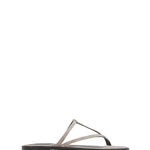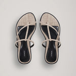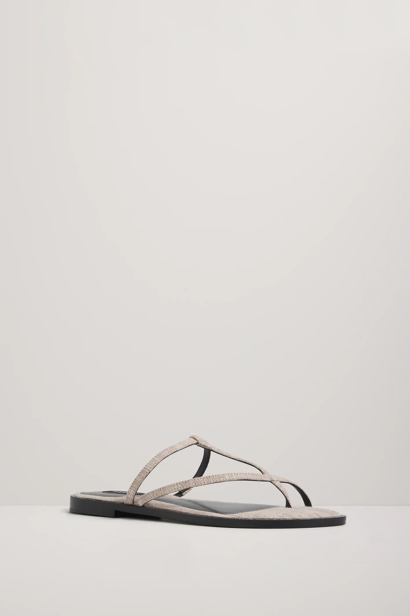 A Emery Cyrus Sandal in Buff. The Cyrus Sandal sits atop an elegant, tapered footbed with slim straps diagonally and horizontally securing the top of the foot.