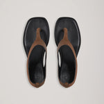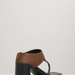 A Emery Fairlie Heeled Sandal in Pecan. The Fairlie Heeled Sandal is a slip-on heel sitting atop a leather footbed with an elegant, squared-off toe.