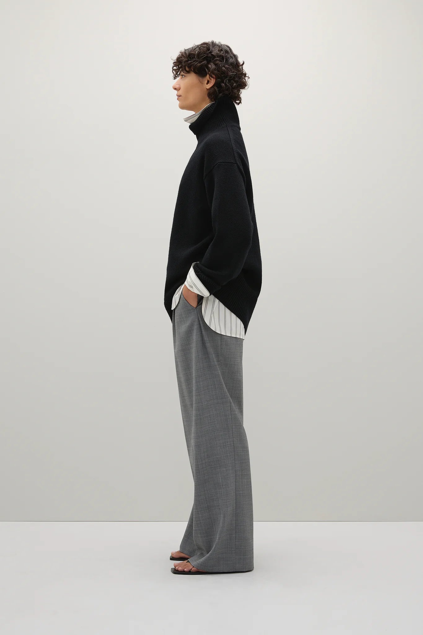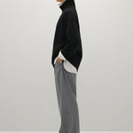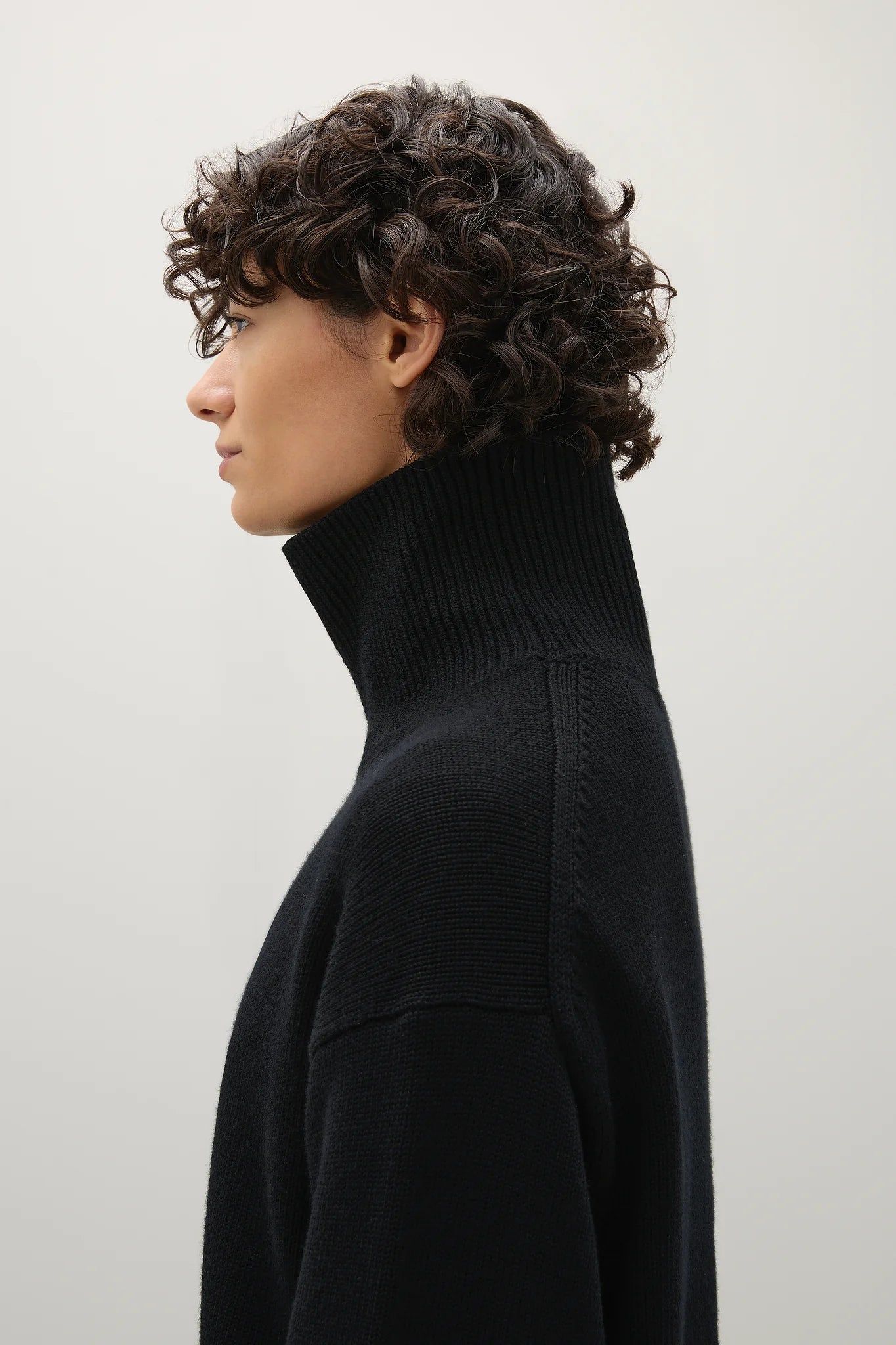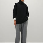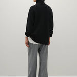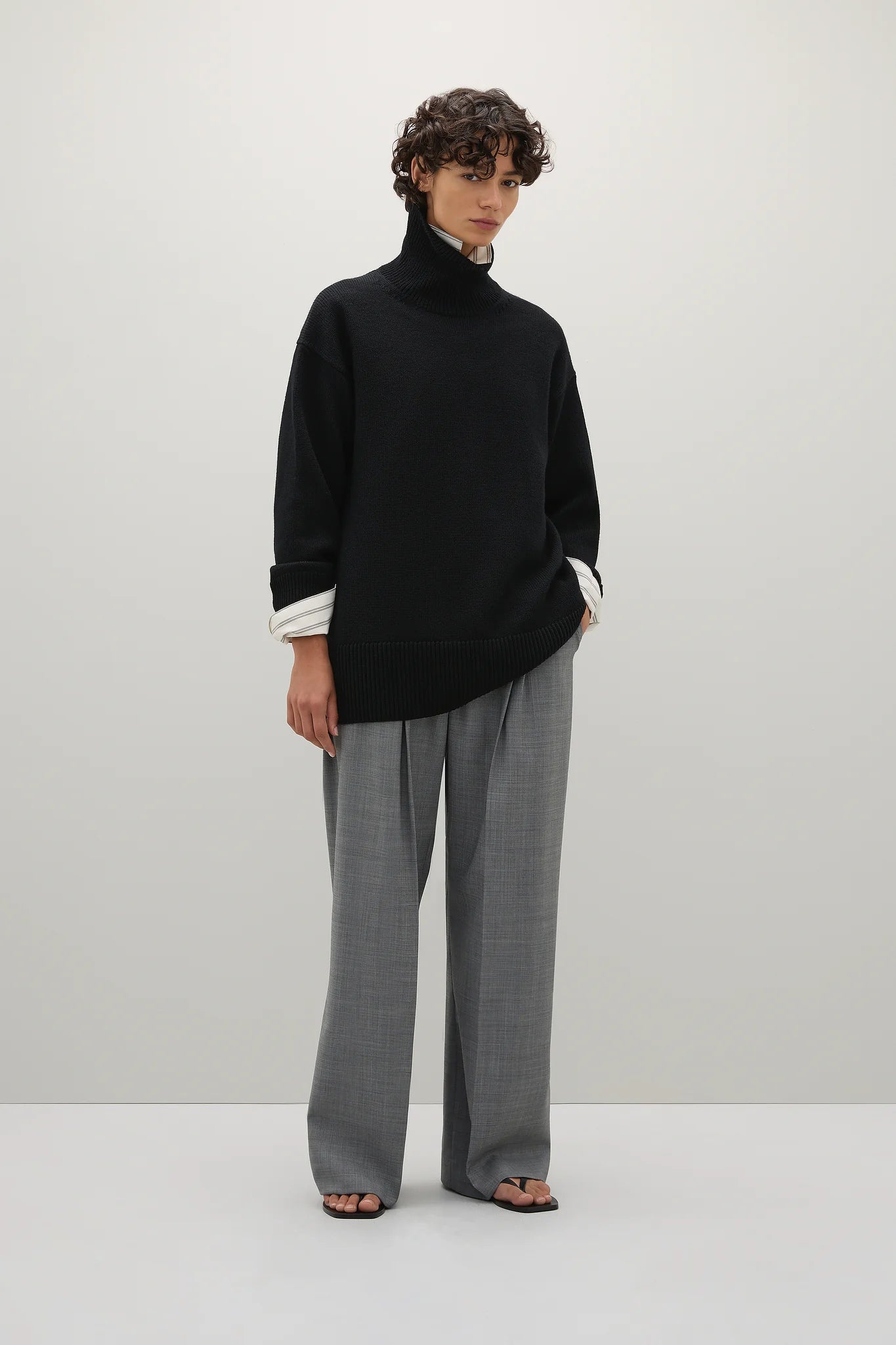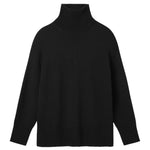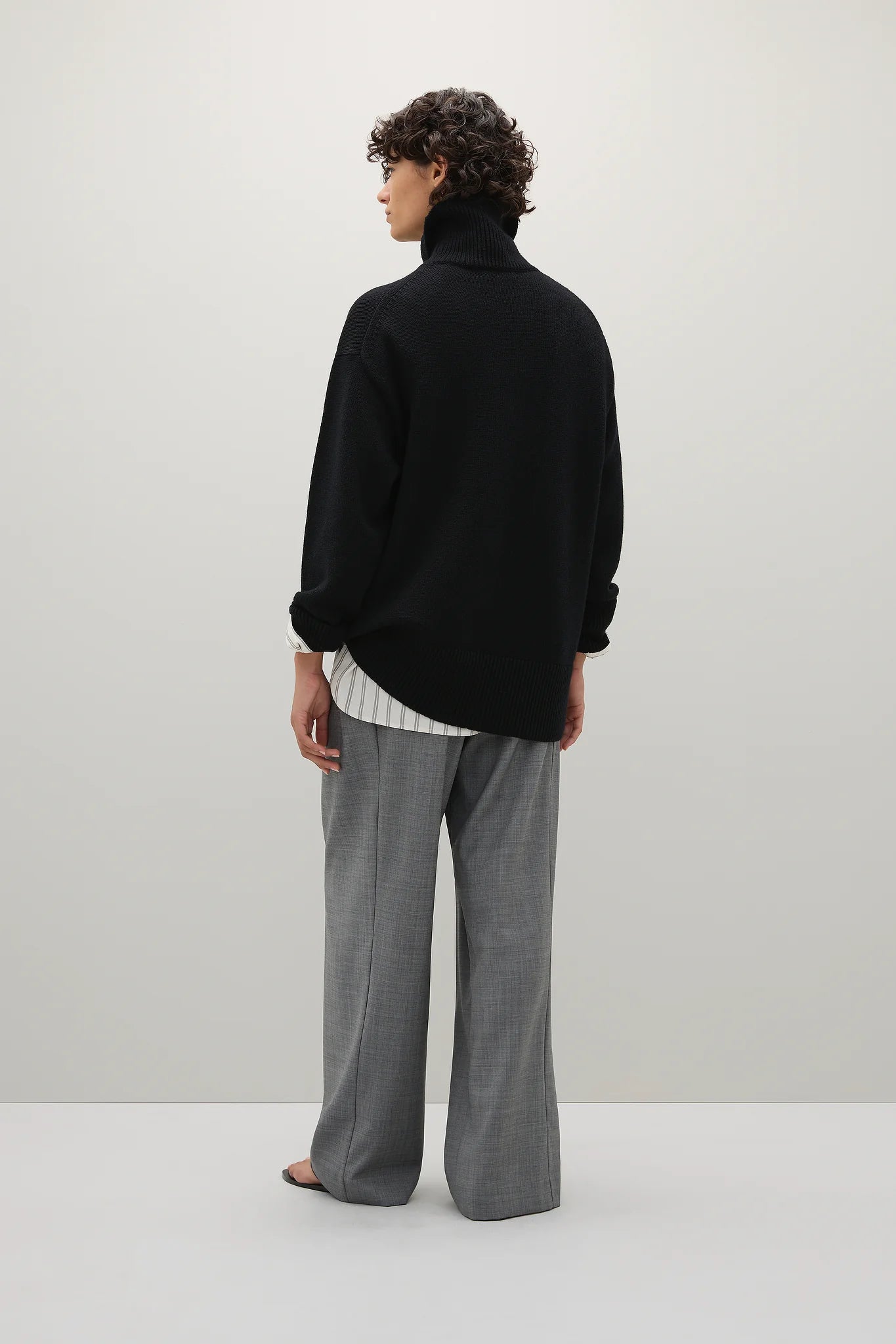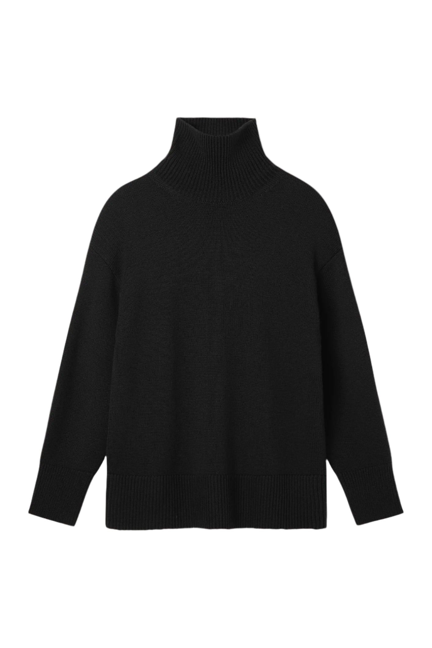 A Emery Gibson Funnel Knit in Black. The Gibson Funnel Knit is crafted from a luxurious merino wool blend. This timeless style features a ribbed turtleneck, cuffs and hem and is generously cut for an oversized, effortless look.