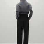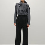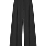 A wide leg silhouette crafted from a lightweight tropical wool, with double pleats falling from the waistband. The side seams are moved towards the back, elegantly cutting off the jet pocket.