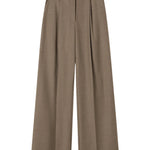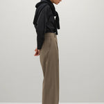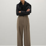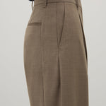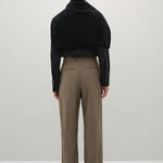 A wide leg silhouette crafted from a lightweight tropical wool, with double pleats falling from the waistband. The side seams are moved towards the back, elegantly cutting off the jet pocket.