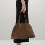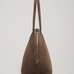 A Emery Harnick Bag in Cedar Suede. The Harnick Bag is crafted from premium suede, defined by a sculptural tapered silhouette. Designed with functionality in mind, it features a two-way double zip closure, structured handles and four protective feet at the base. The interior is lined in a premium cotton twill and finished with a single internal zip pocket offering secure space for essentials.