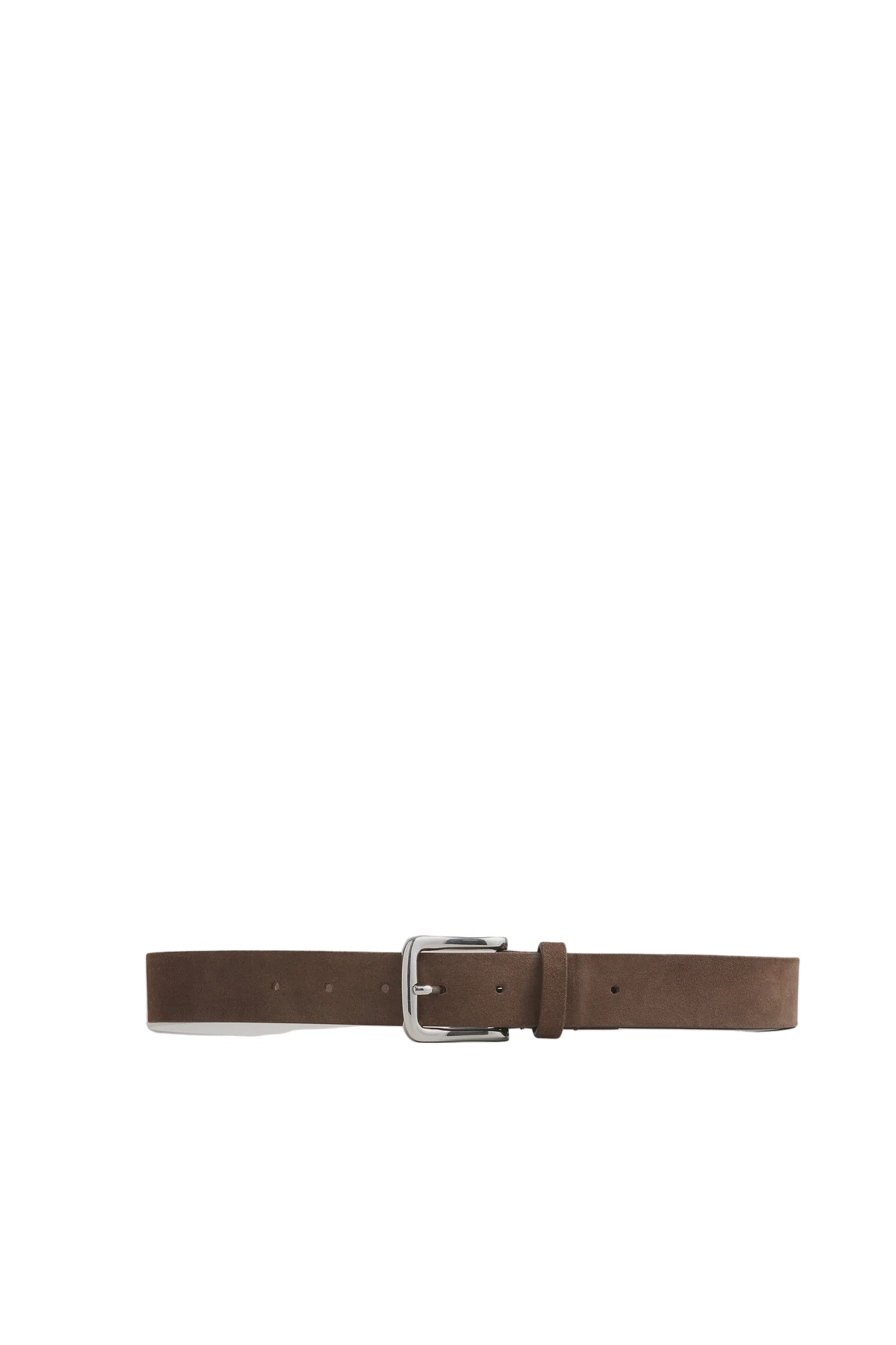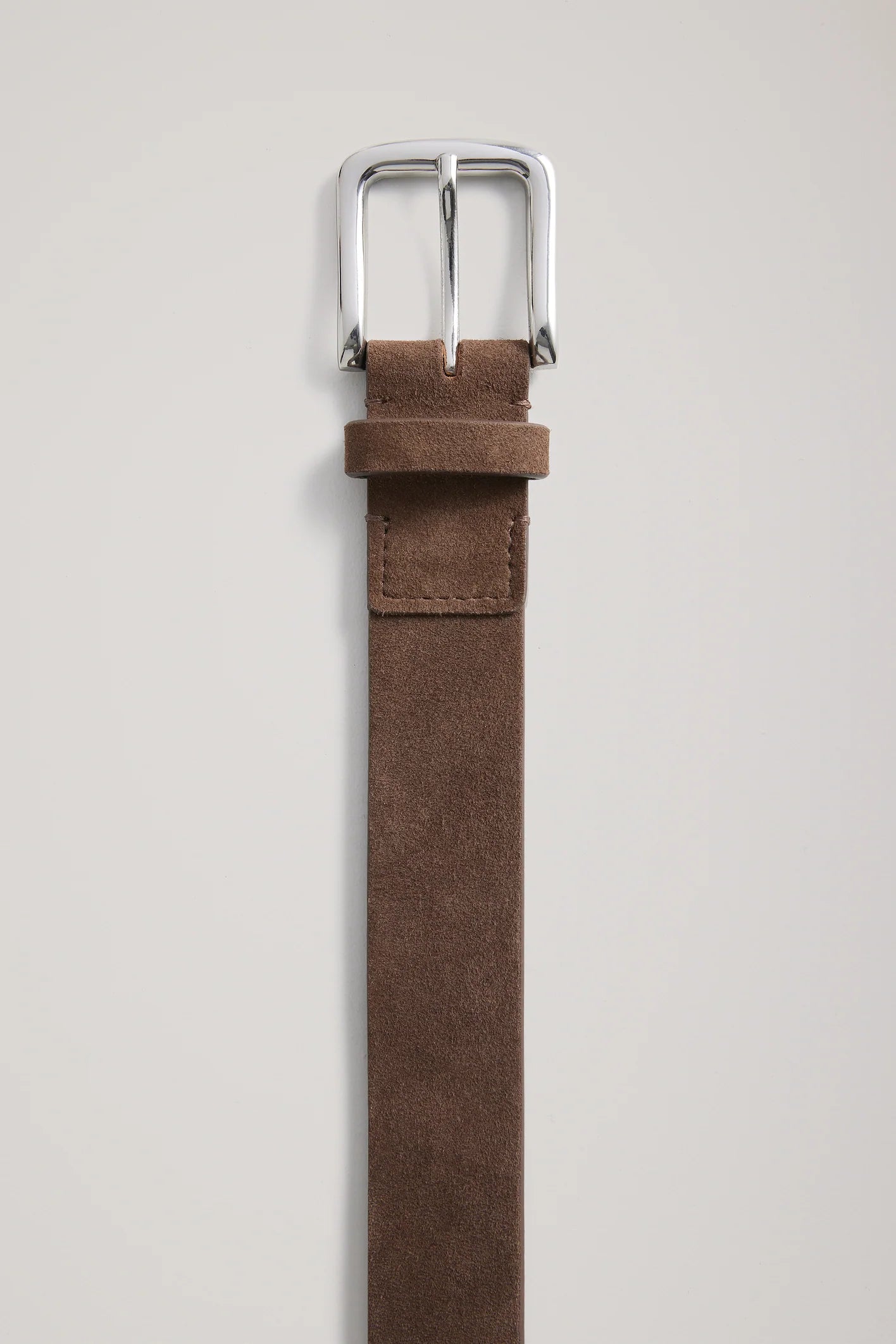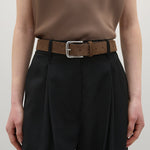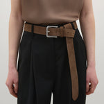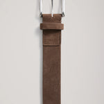 A Emery Leroy Belt in Cedar Suede. The Leroy Belt is an effortless, everyday wardrobe staple crafted from suede leather with a silver buckle closure.