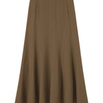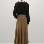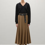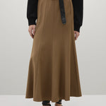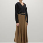 A Emery Lilian Skirt in Camel. The Lillian Skirt is a ten-gore panelled skirt with belt loops and a flared hemline. Finished with concealed in-seam front pockets, two welt pockets at the back, and a concealed side zip for a streamlined silhouette.