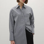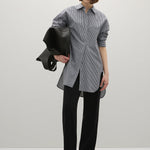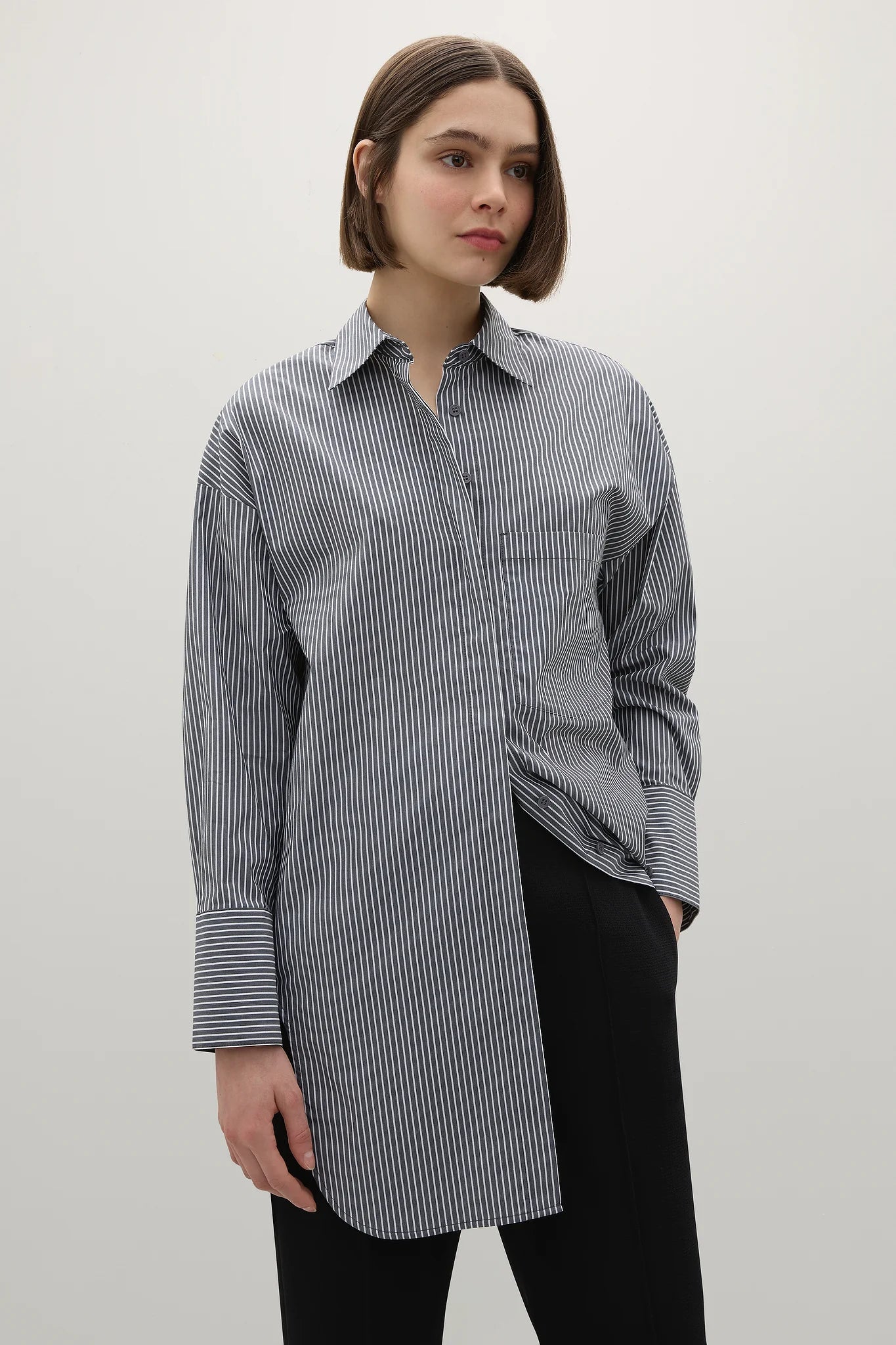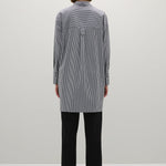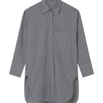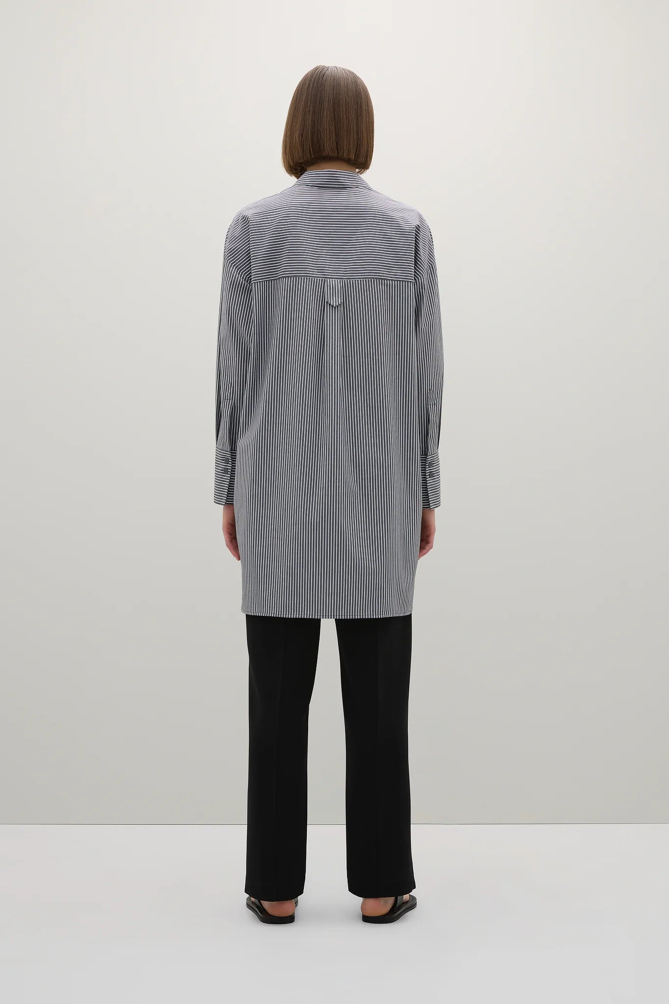 A Emery Logan Shirt in Navy Stripe. Crafted from a premium cotton blend, the Logan Shirt is a long-line tunic style shirt featuring a hidden button placket, single breast pocket and an elevated hem shape at the side seam.
