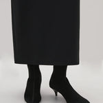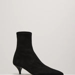 A Emery Ophelia Boot in Black Suede. The Ophelia Boot is crafted from stretch suede for a smooth, sculpted fit. Its pointed toe and delicate kitten heel exude timeless elegance, while the 6cm stacked leather fluted heel provides refined height. Designed for effortless wear, the boot slips on with ease and is finished with a leather sole.