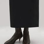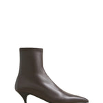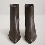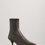 A Emery Ophelia Boot in Walnut. The Ophelia Boot is crafted from stretch leather for a smooth, sculpted fit. Its pointed toe and delicate kitten heel exude timeless elegance, while the 6cm stacked leather fluted heel provides refined height. Designed for effortless wear, the boot slips on with ease and is finished with a leather sole.