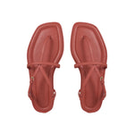 A Emery Remly Sandal in Cherry. The Remly sandal sits atop our slim padded footbed with a narrow leather strap that extends from toe to ankle, intersected by a sleek strap across the top of the foot. Finished with a delicate gold buckle.