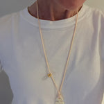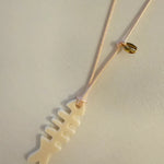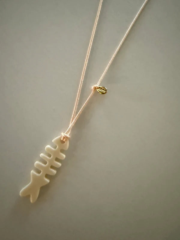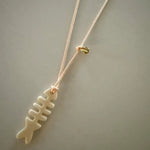 This super light weight necklace features one bone coloured fish with a tiny gold coloured cowrie shell bead.