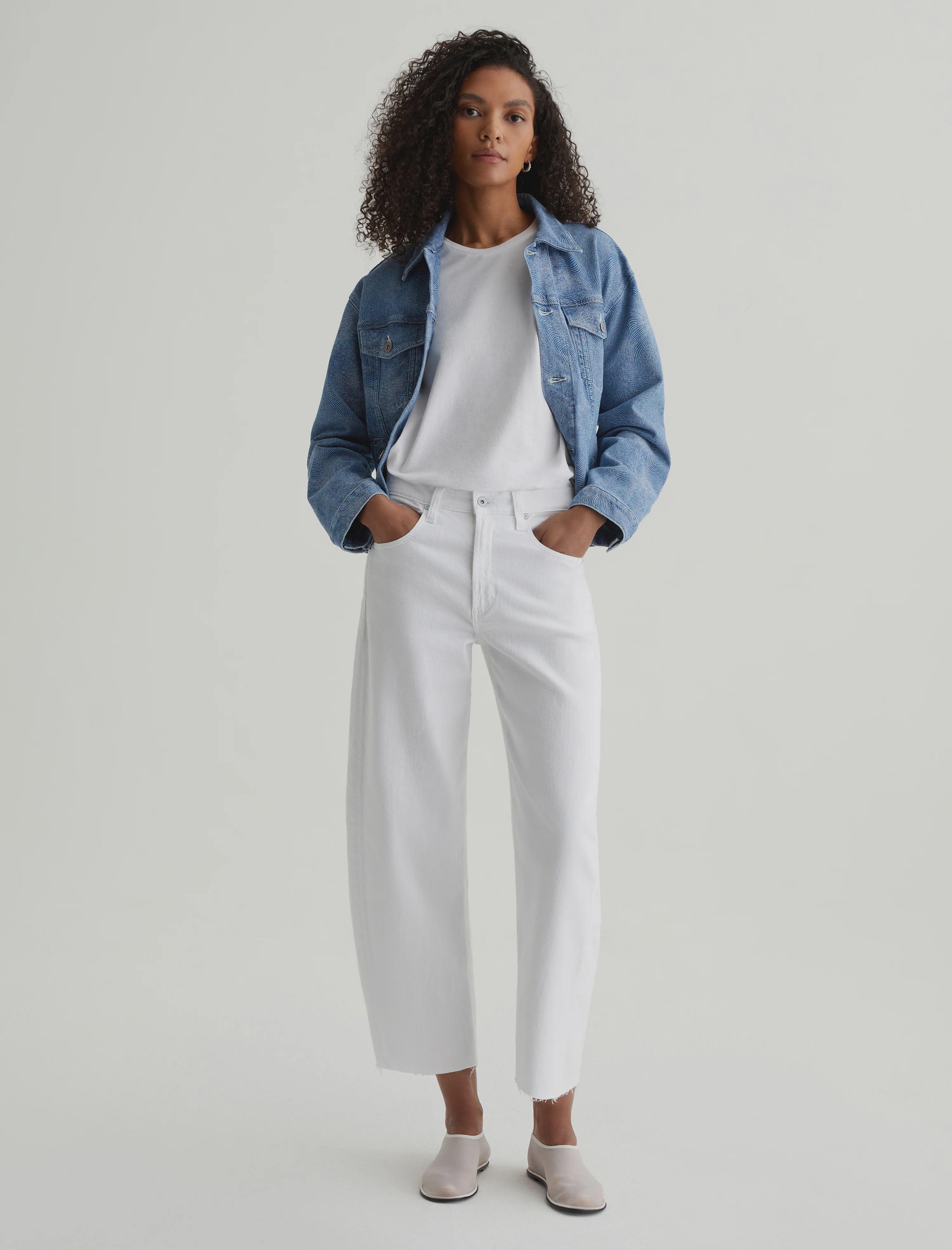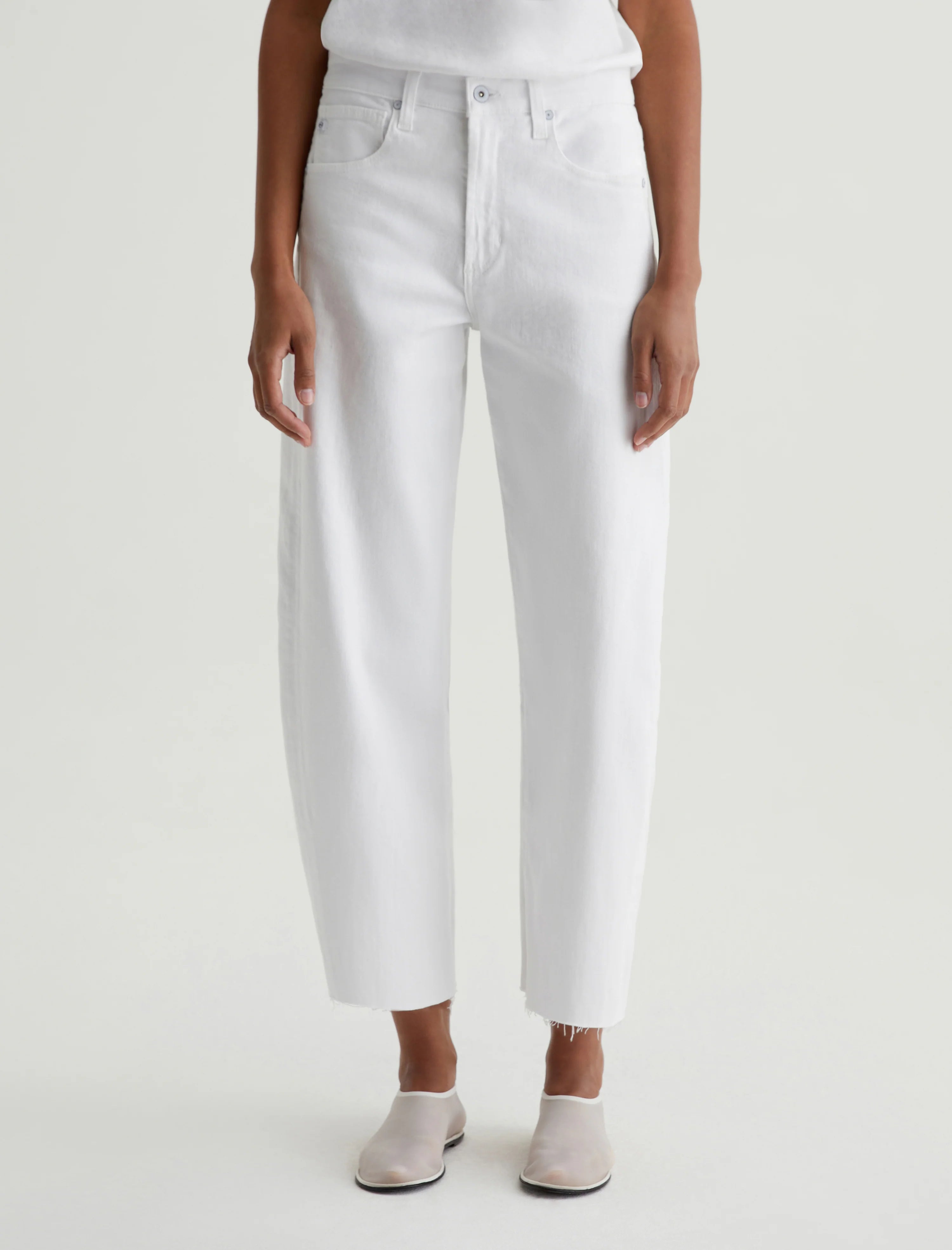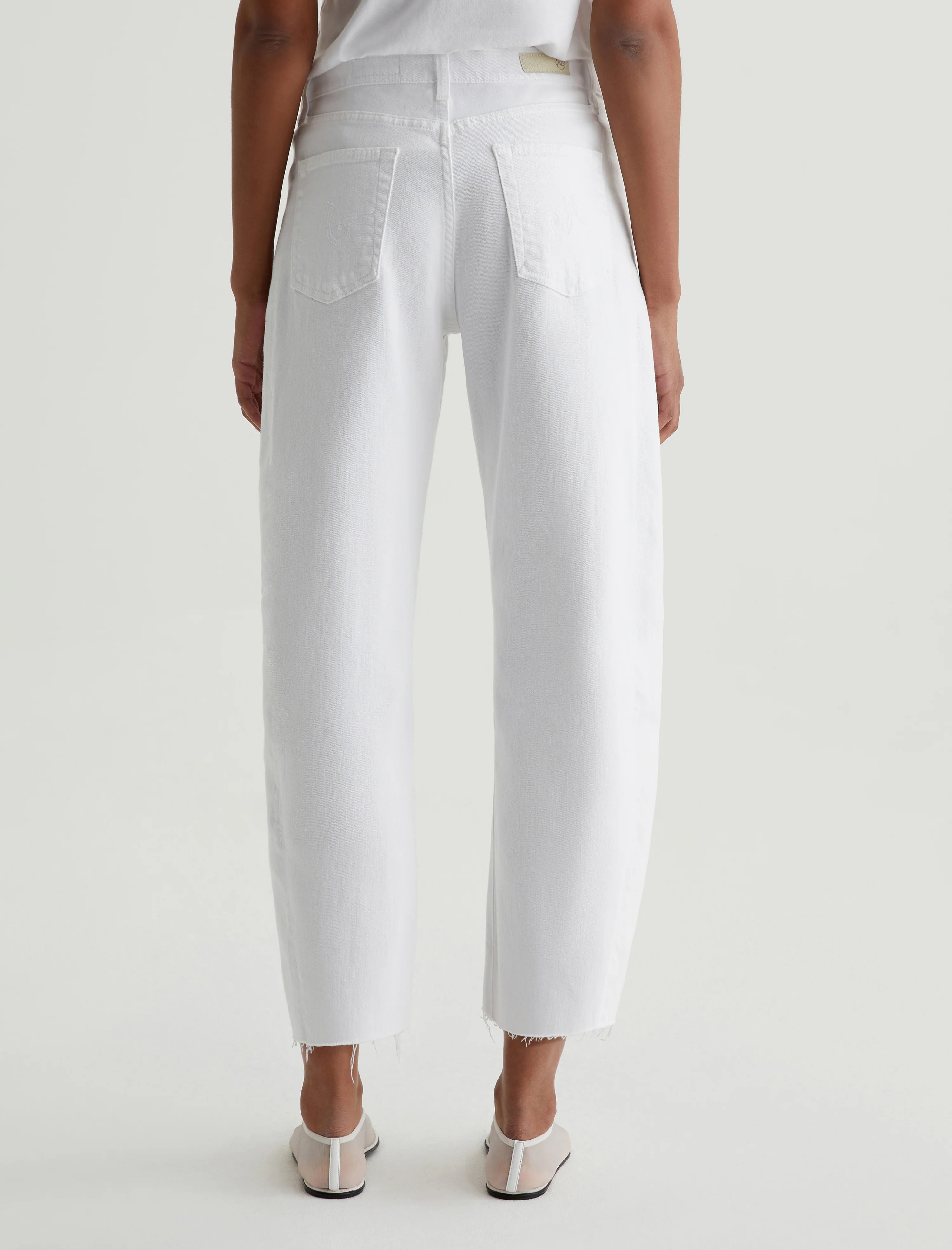 AG Jeans Hattie Crop in Gallery White. A cropped version of our Hattie barrel jeans in white. The Hattie Crop has an ultra-high waist and a curved shape at the legs, complete with side-seam paneling and raw hems that land above the ankle. Designed in 10 oz. Daytripper Stretch Raw Denim, this five-pocket pair features a comfortable cotton blend with lyocell added for a soft feel.