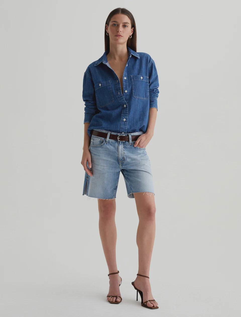 AG Jeans Leny in Coves. The Leny relaxed-fit shirt has a cool, effortless look in lightweight cotton denim with broken twill construction. Washed to a classic blue shade, this long-sleeve style has button-through patch pockets and pleat detailing at the back.