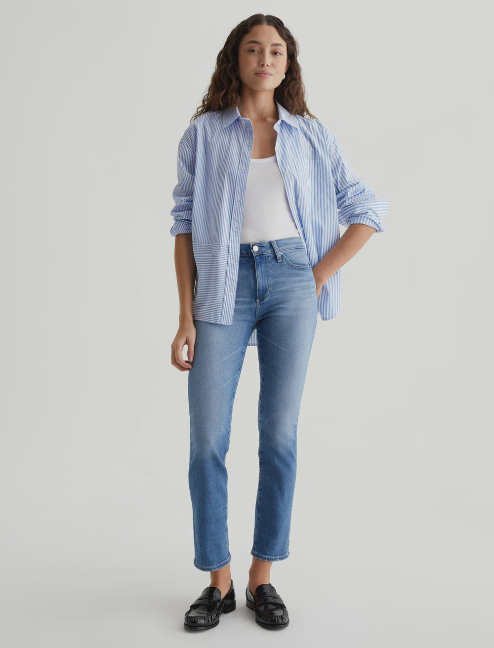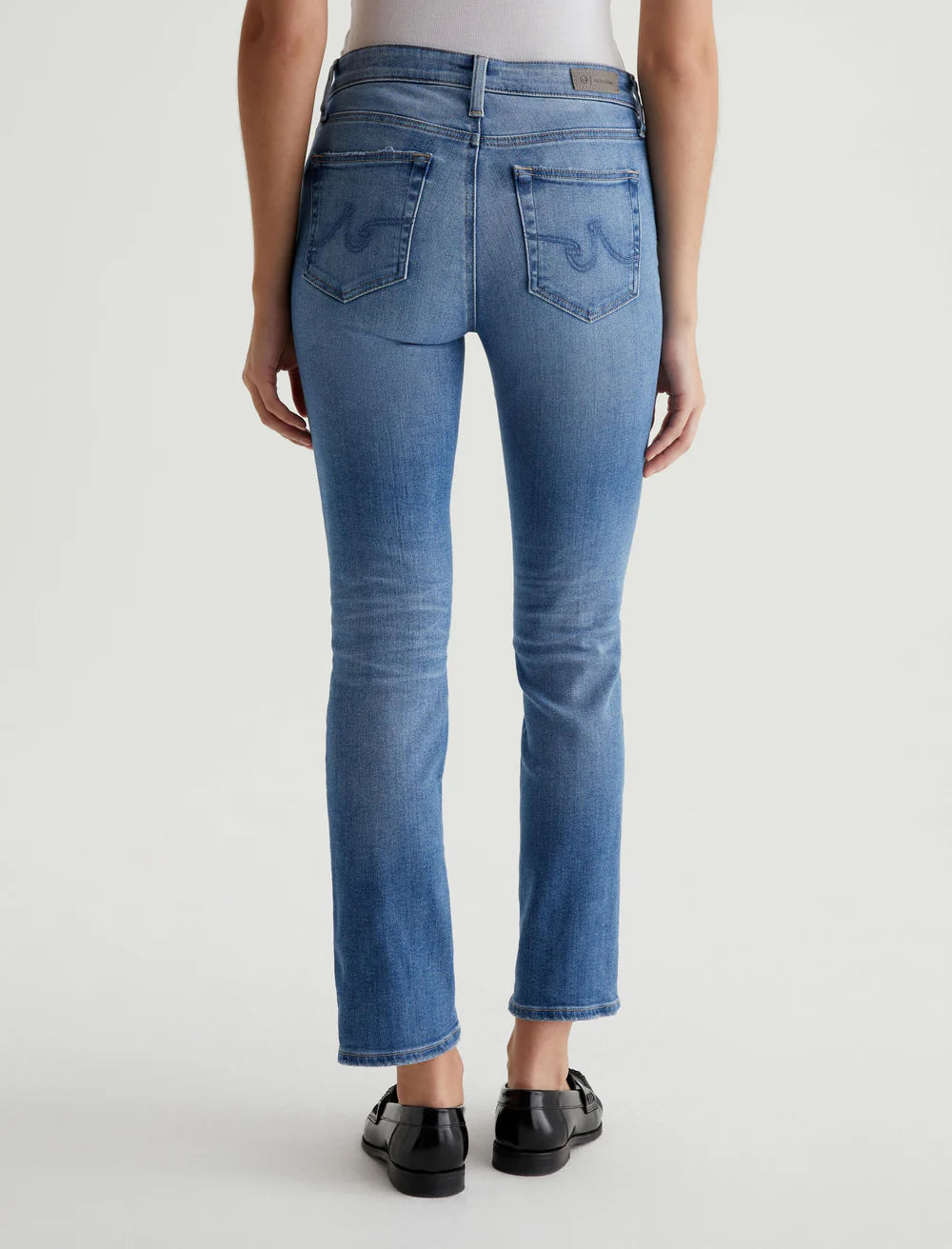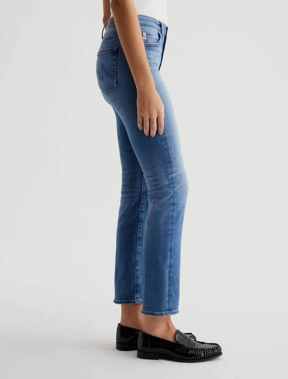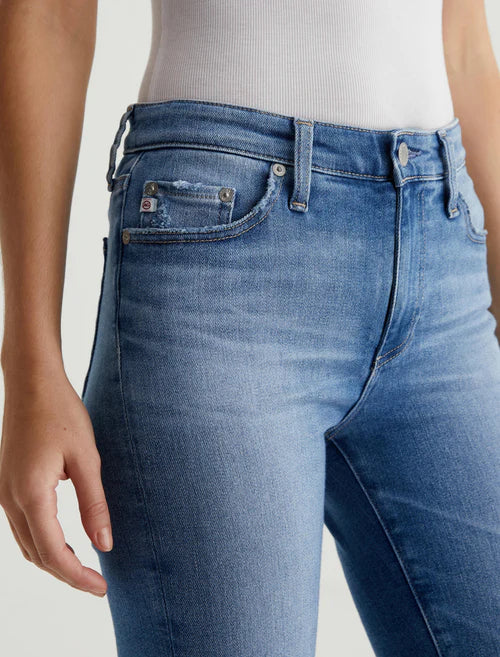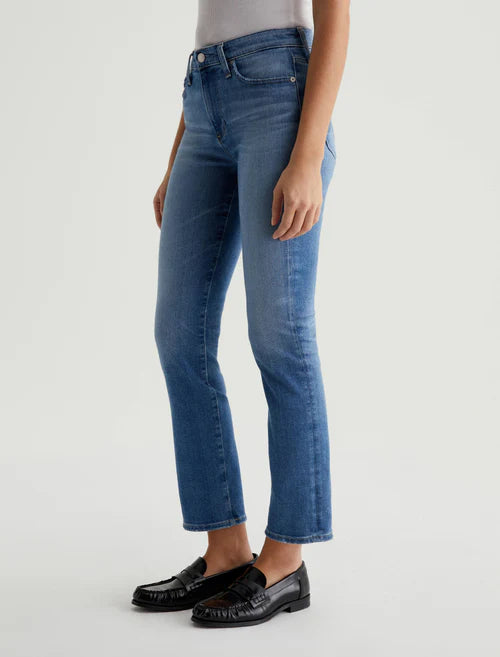 AG Mari Jean in 13Yr Promenade. Mari is a mid-rise slim-straight jean featuring a medium blue AG-ed™ wash with subtle fading and worn pocket edges. Crafted from 12.5 oz. Vintage Indigo Stretch Denim, these five-pocket women's jeans fit easy around the hips and have straight silhouette that slims down at the leg openings.