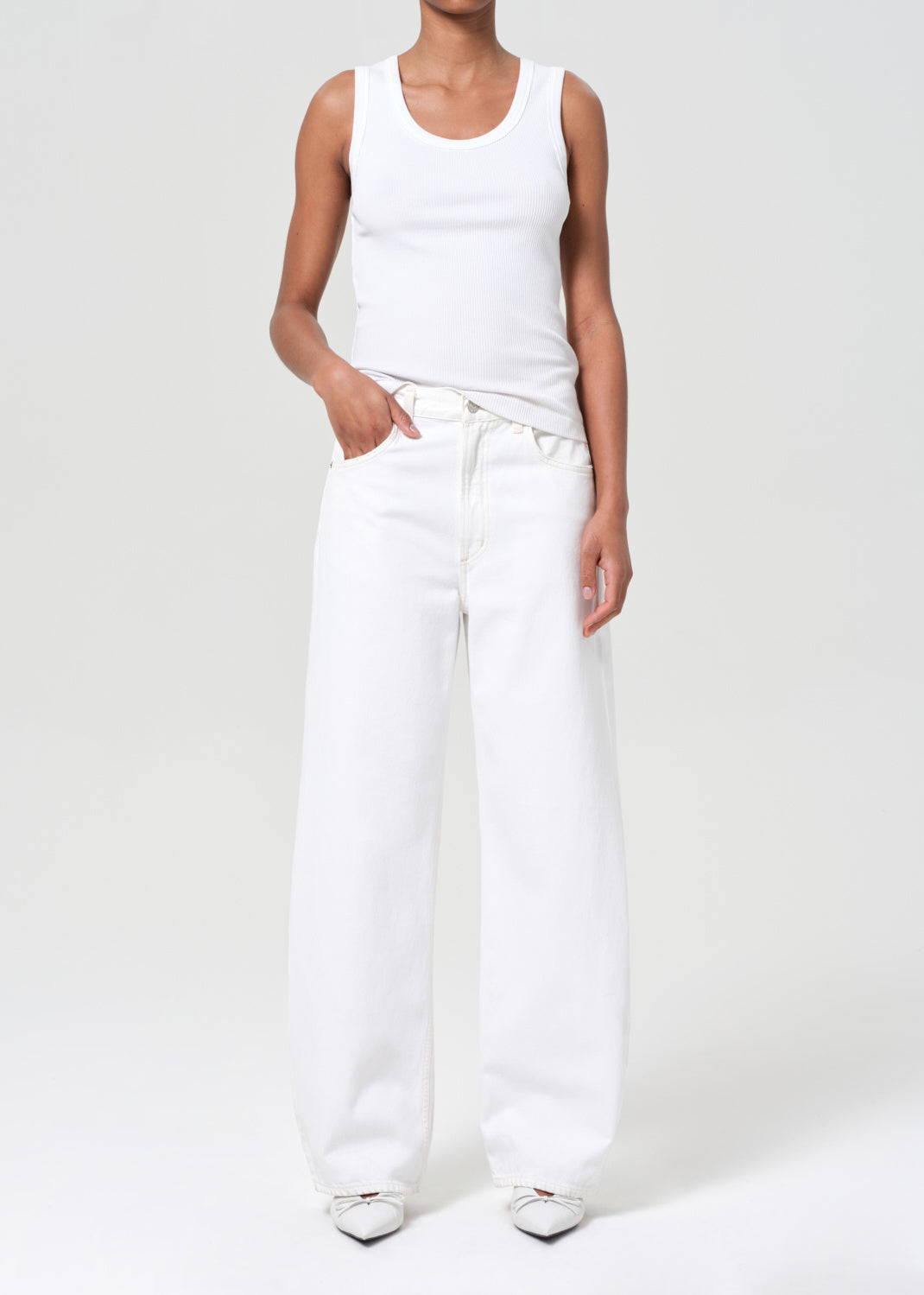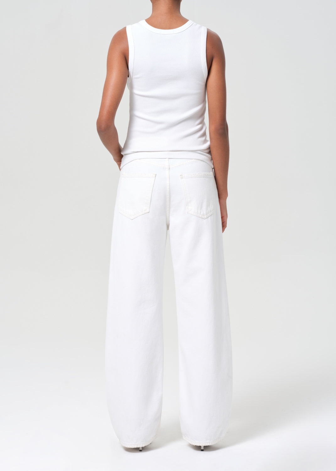 Agolde Low Curve Jean in Milkshake. An updated twist on the barrel leg trend. This fit offers a comfortable and easy top block with a mid-rise waist. The sleek, low curved out seam gently tapers down to the ankle for a subtle yet sophisticated look.