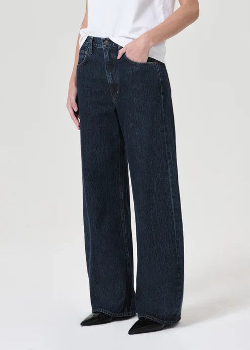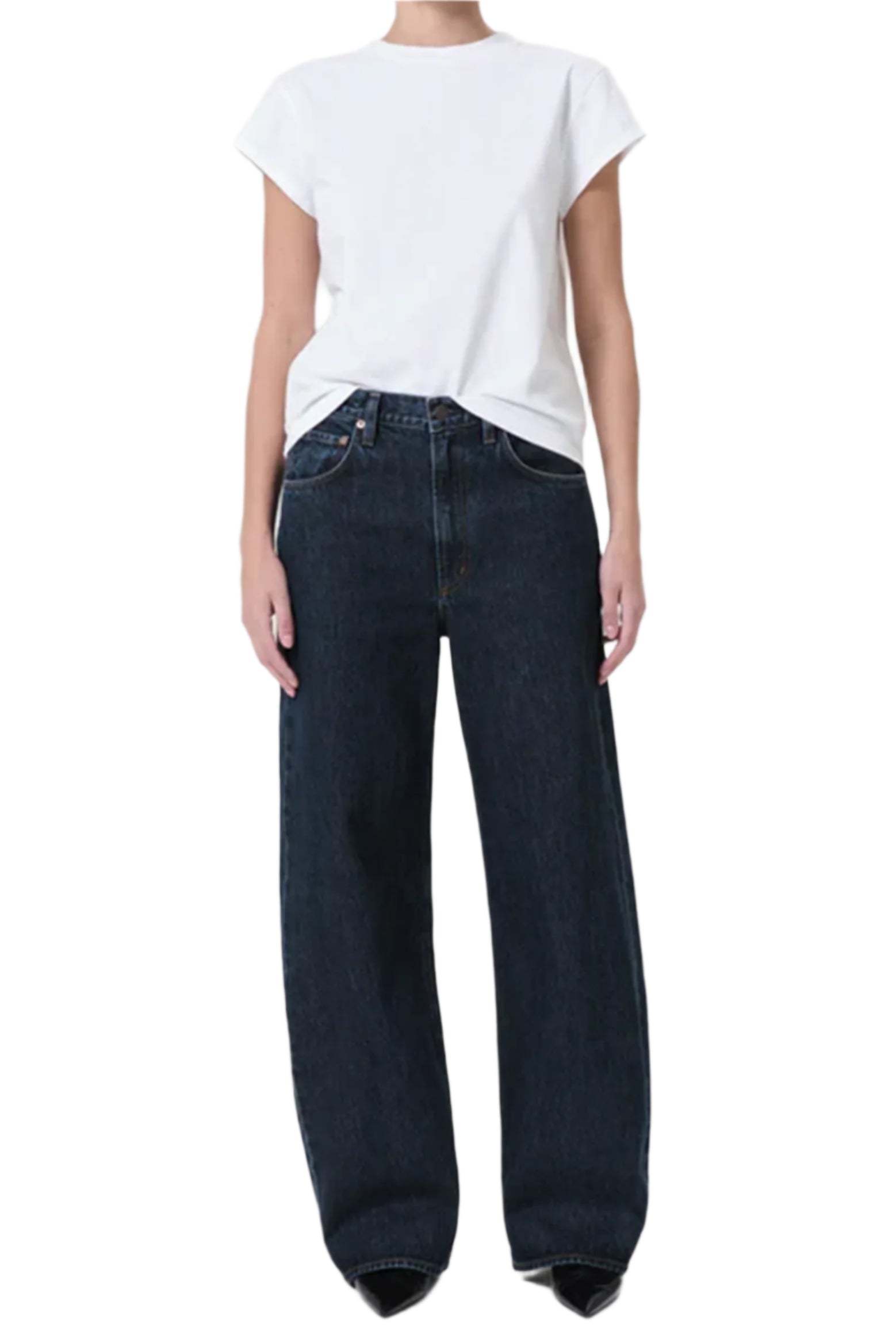 Agolde Low Curve Jean in Pendulum. The Low Curve Jean is designed with a mid-rise waist, relaxed fit, and a subtle curved outseam that tapers for a refined yet effortless silhouette. Crafted from clean deep indigo, non-stretch denim in regenerative cotton, it offers a structured feel with a modern edge. Style with a crisp shirt and sleek boots for an understated yet elevated look.