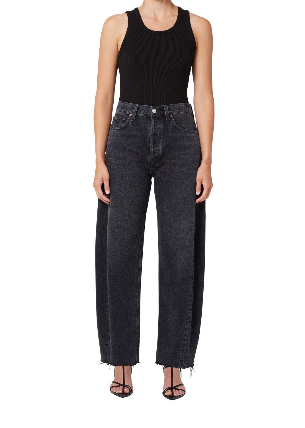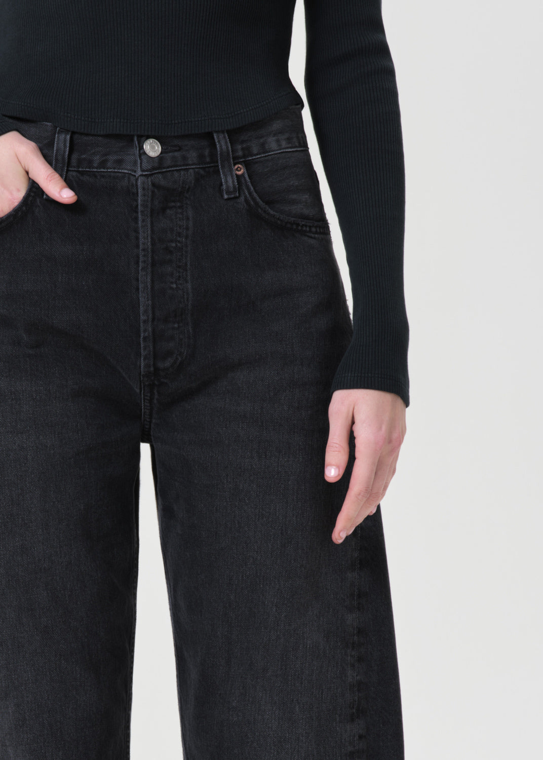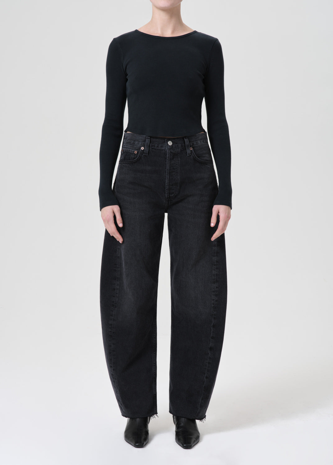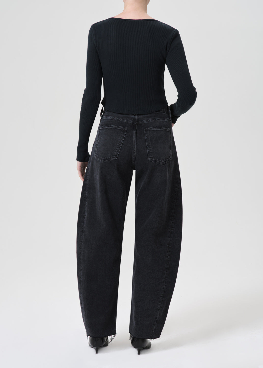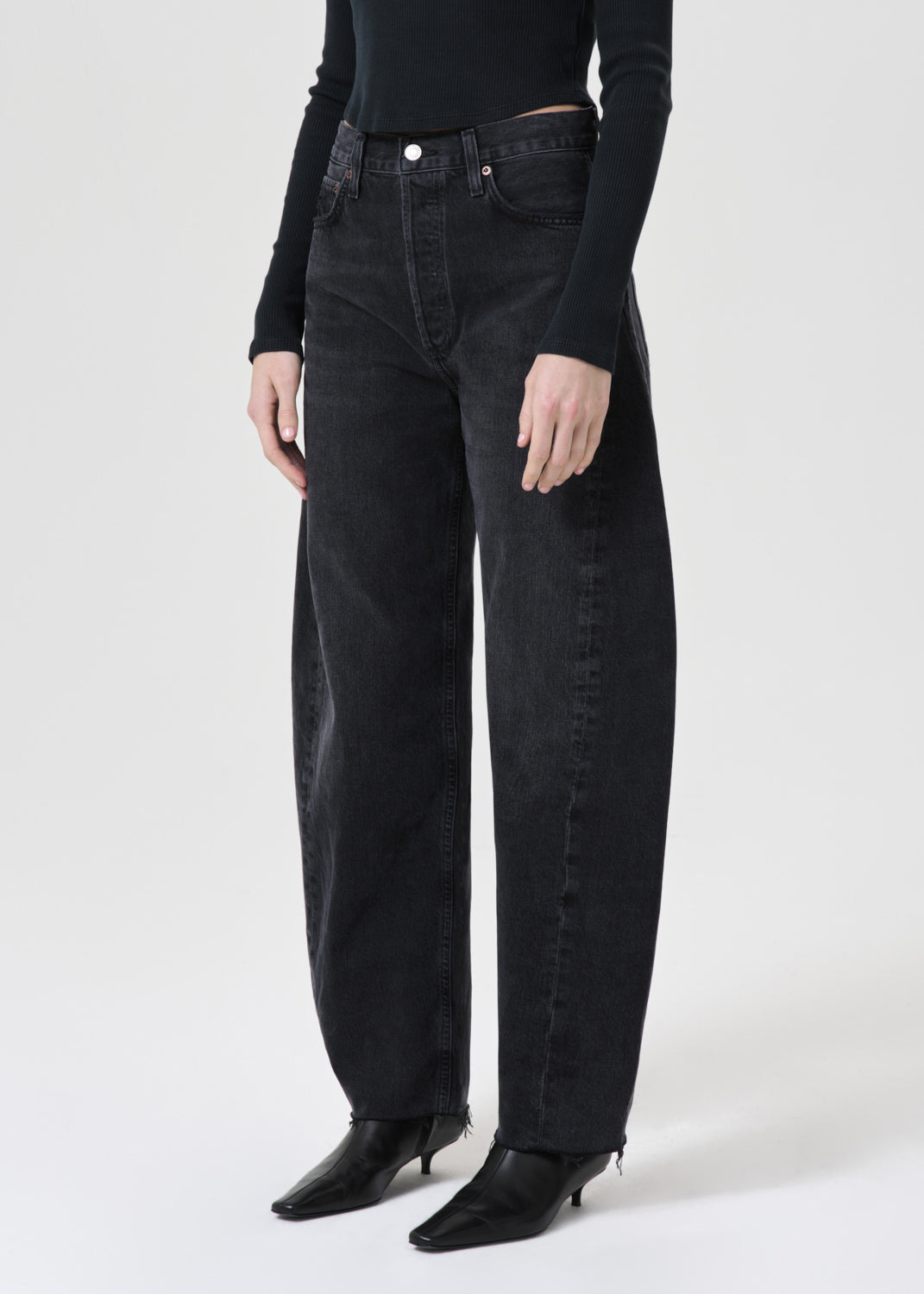 Agolde Luna Pieced Jean in Possess. Structured to perfection. The Luna is designed with a waist-accentuating high-rise and a full-length relaxed leg. The pieced insert detailing at the outseam creates a bowed leg silhouette, ideal for taking your everyday denim to the next level.