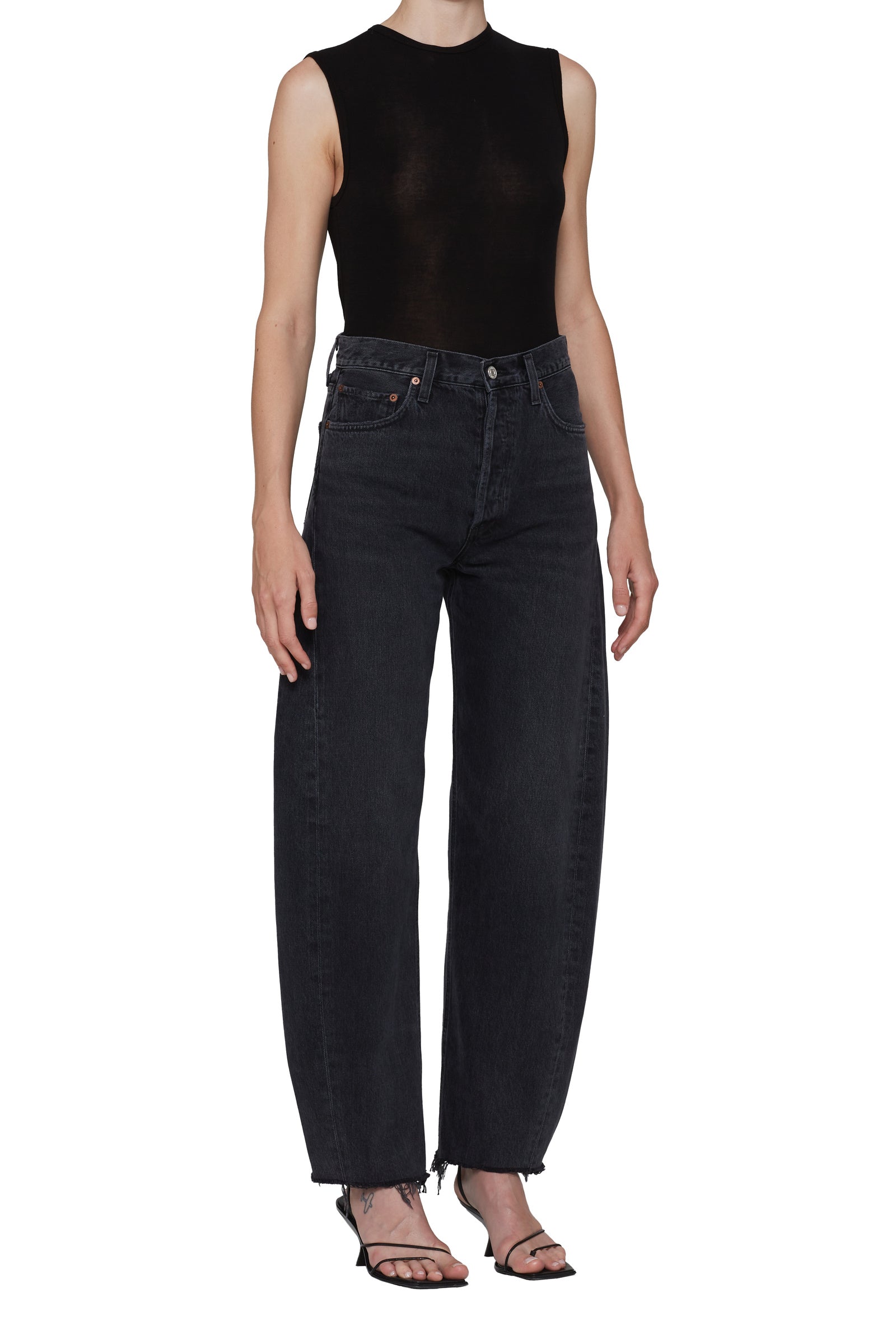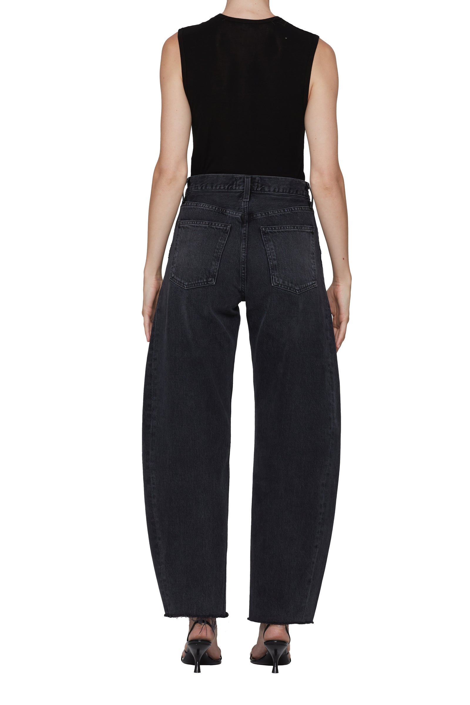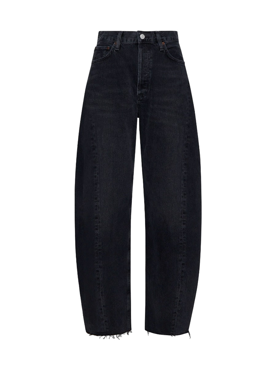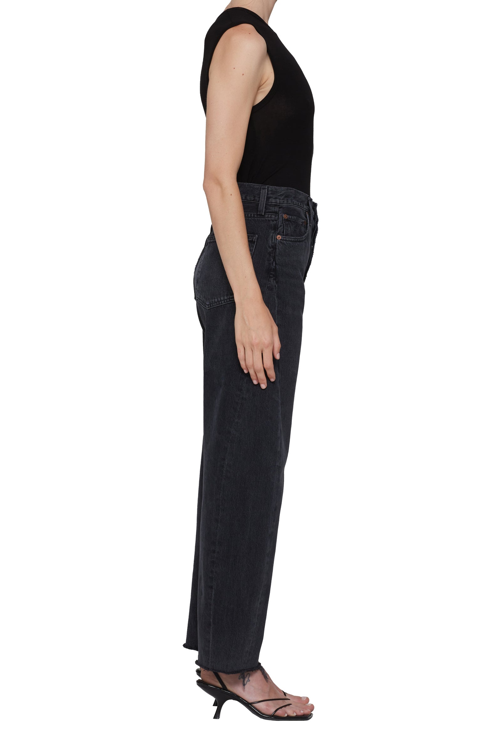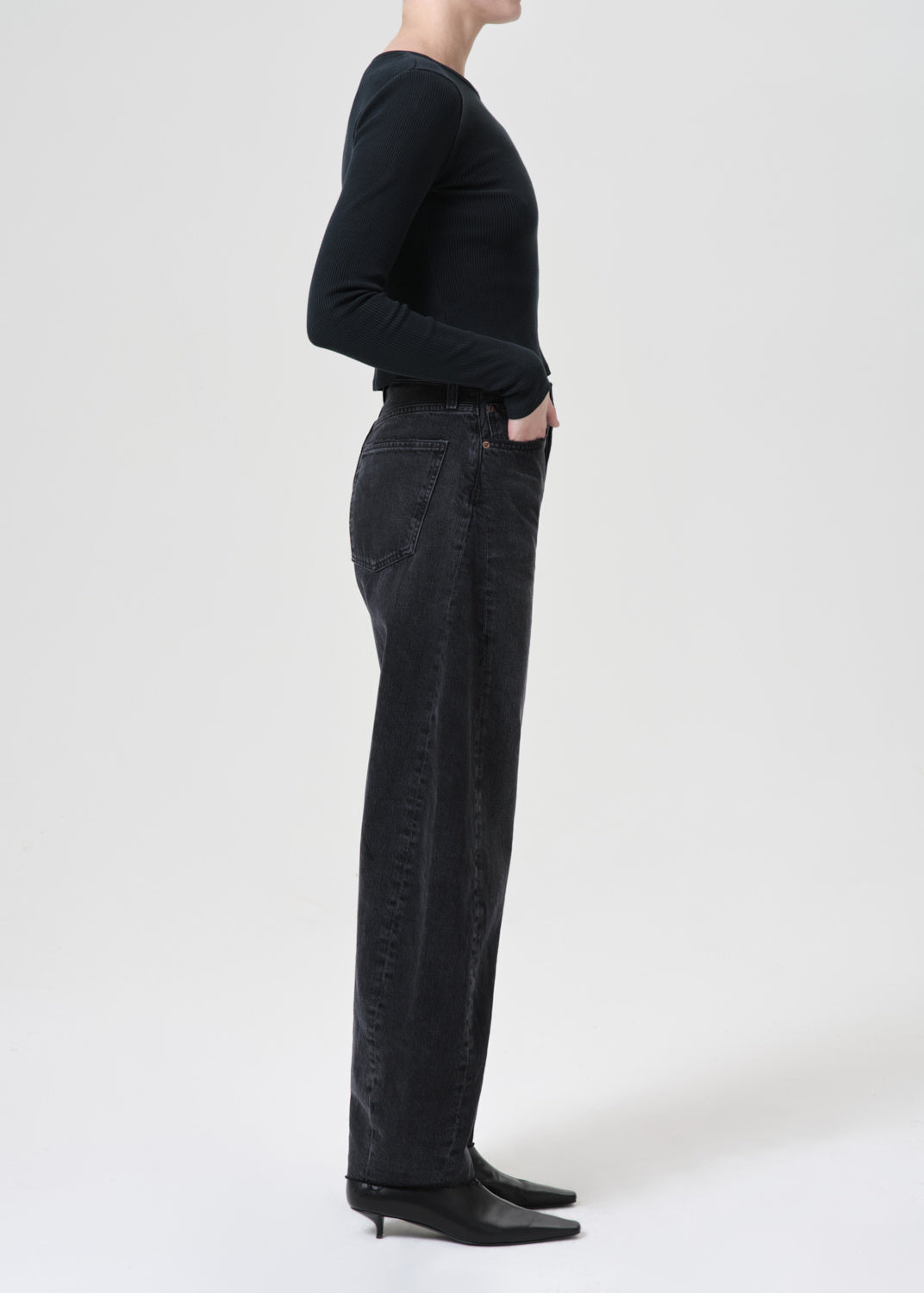 Agolde Luna Pieced Jean in Possess. Structured to perfection. The Luna is designed with a waist-accentuating high-rise and a full-length relaxed leg. The pieced insert detailing at the outseam creates a bowed leg silhouette, ideal for taking your everyday denim to the next level.