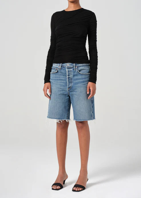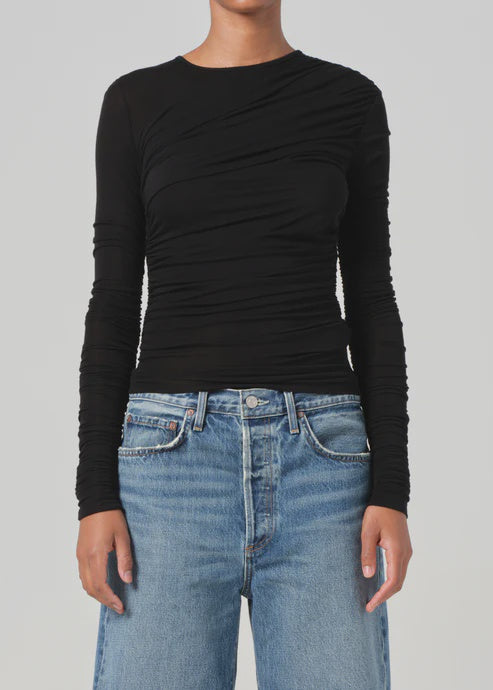 Agolde Tania Twist Tee in Black. The Tania features beautifully layered diagonal rouching, highlighting texture and form. Crafted from an ultra-fine, soft-stretch fabric. this slightly-sheer top is designed with a slim fit.
