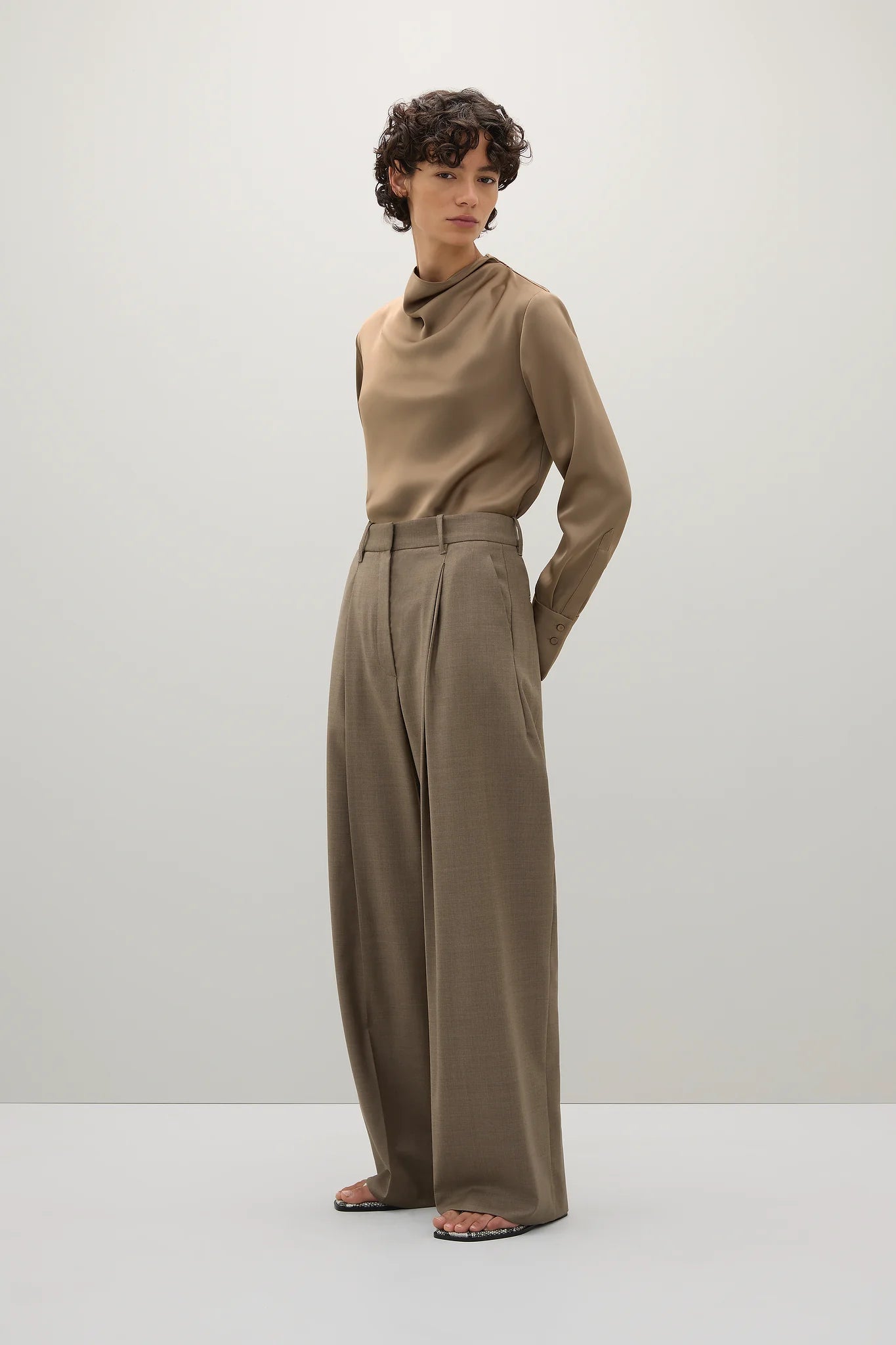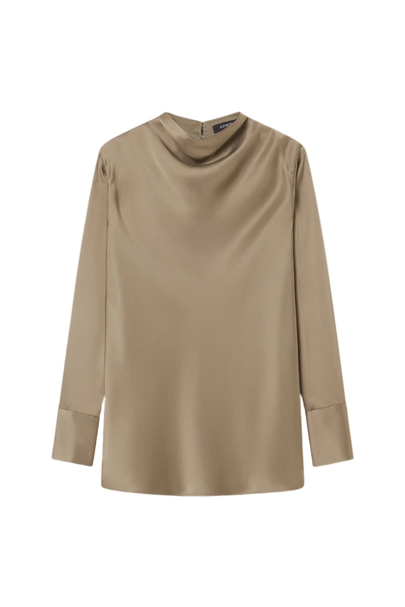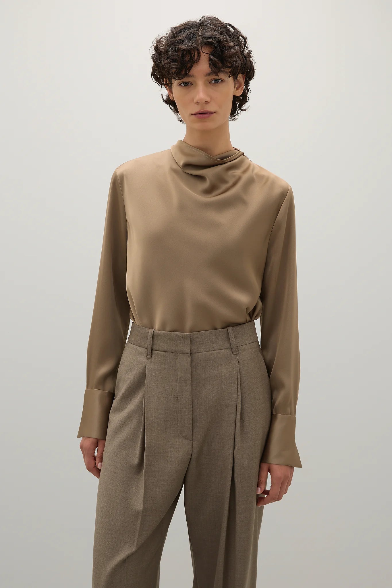 A Emery Aitken Shirt in Moss. Cut on the bias, The Aitken Shirt is an elegant shirt crafted from Japanese triacetate offering a fluid fit and drape. Features include a cowl neck, wide cuffs and a centre back double button closure.