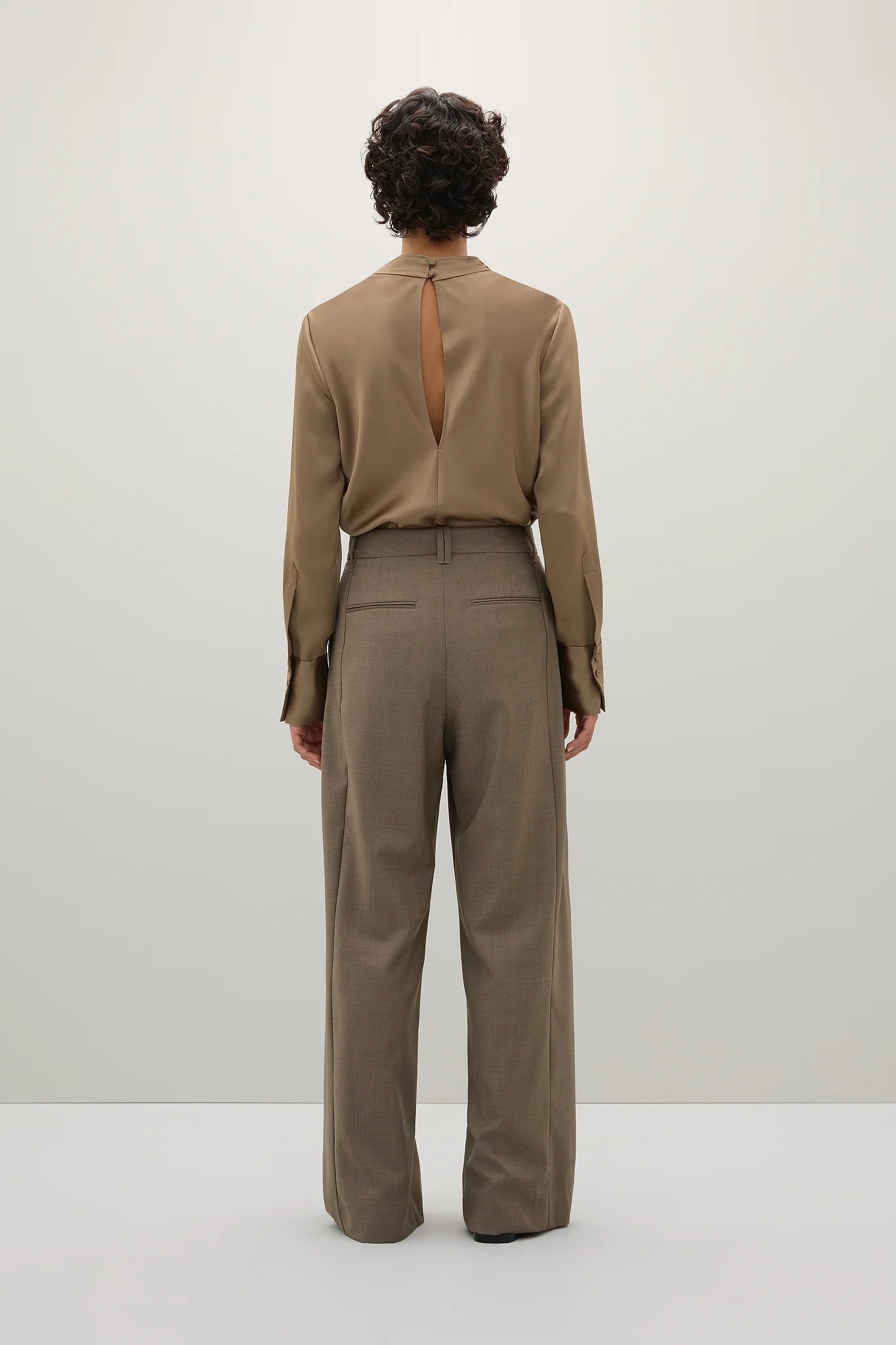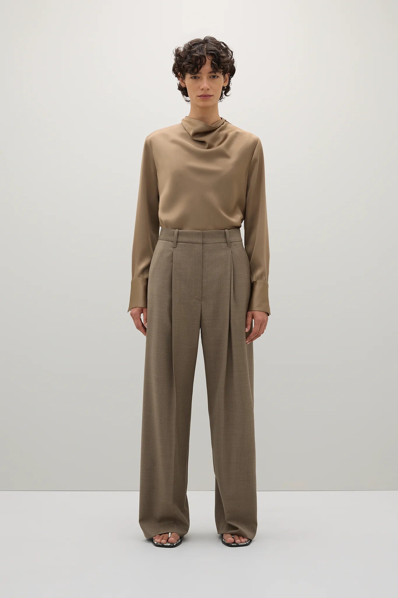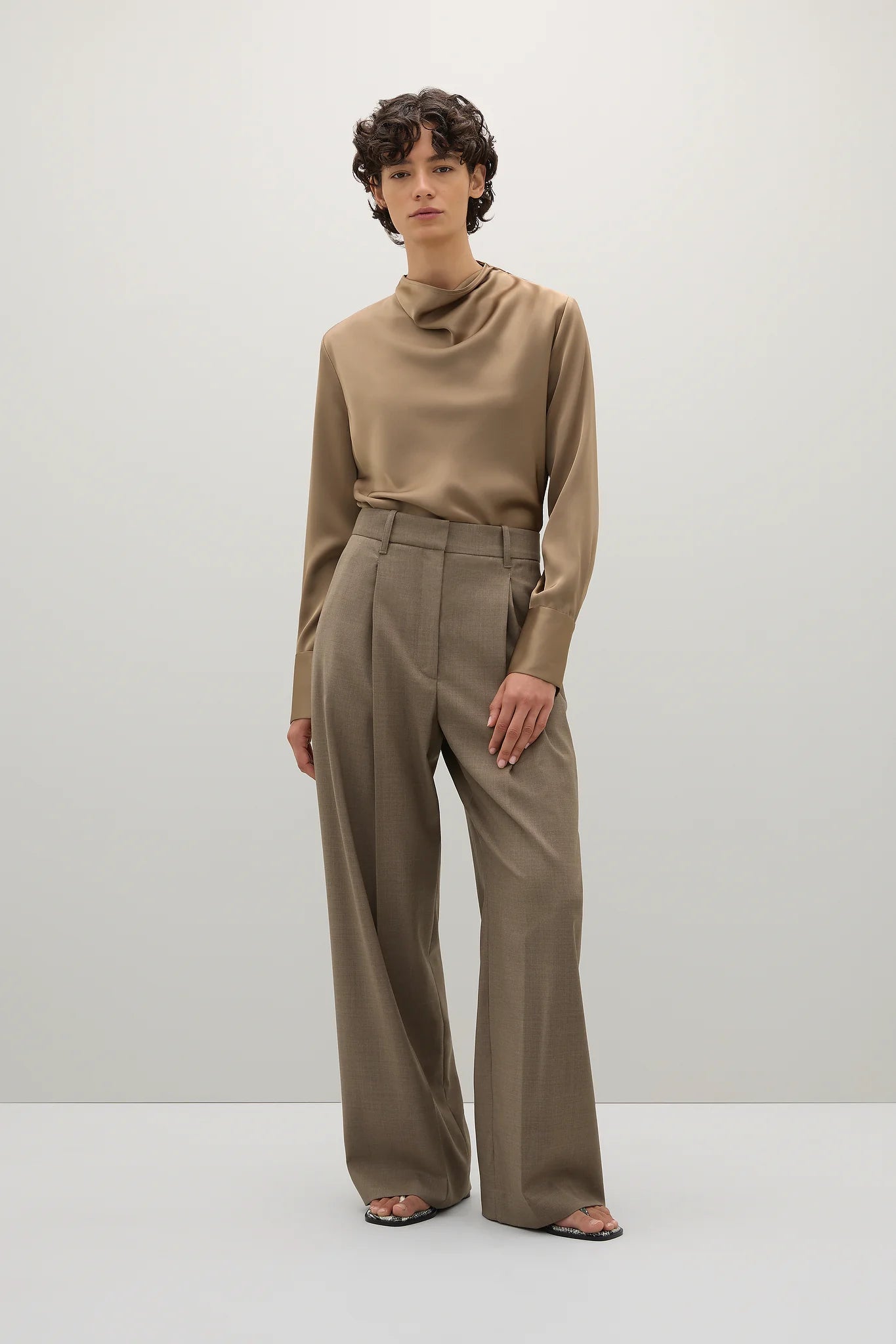 A Emery Aitken Shirt in Moss. Cut on the bias, The Aitken Shirt is an elegant shirt crafted from Japanese triacetate offering a fluid fit and drape. Features include a cowl neck, wide cuffs and a centre back double button closure.