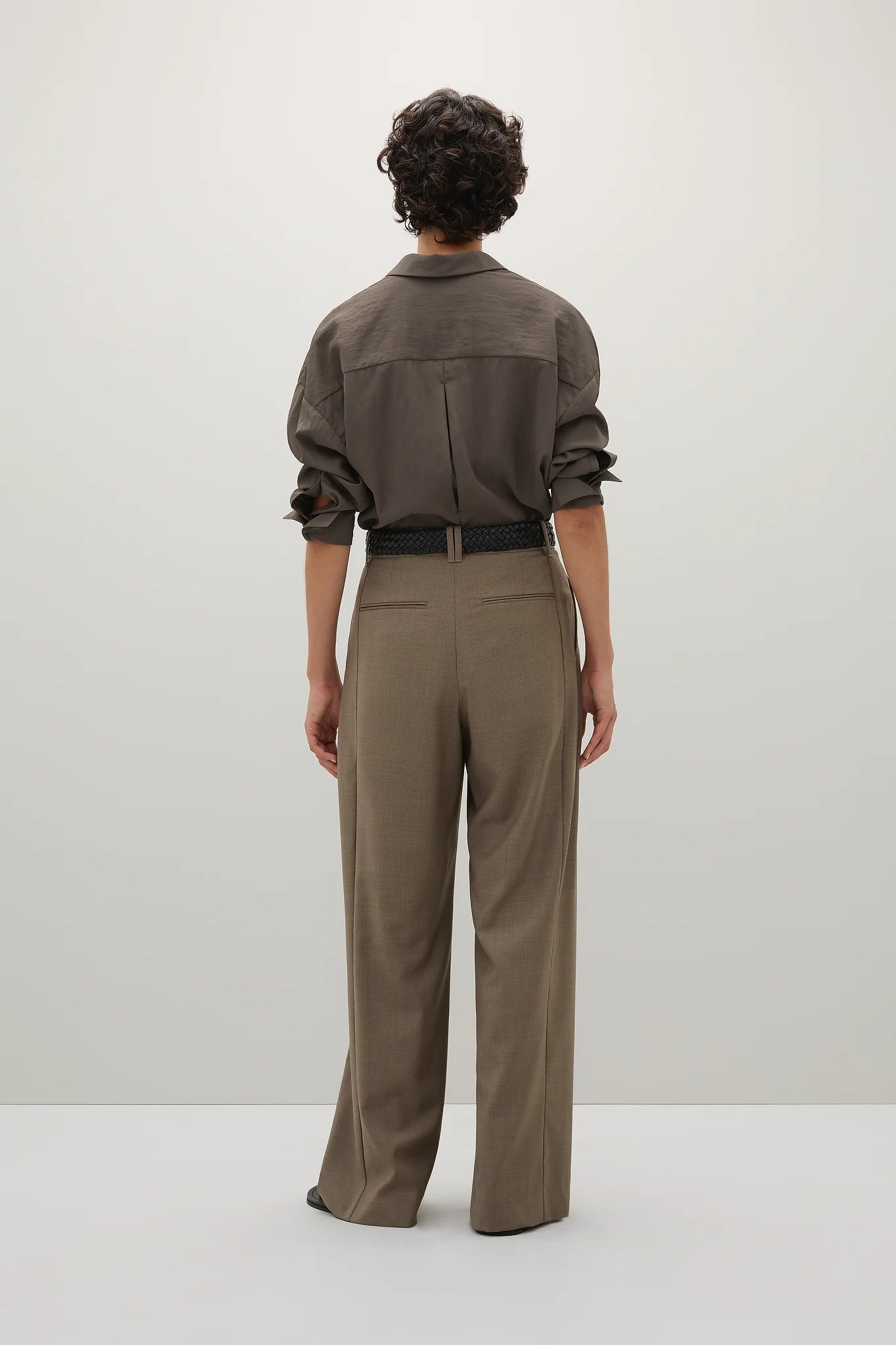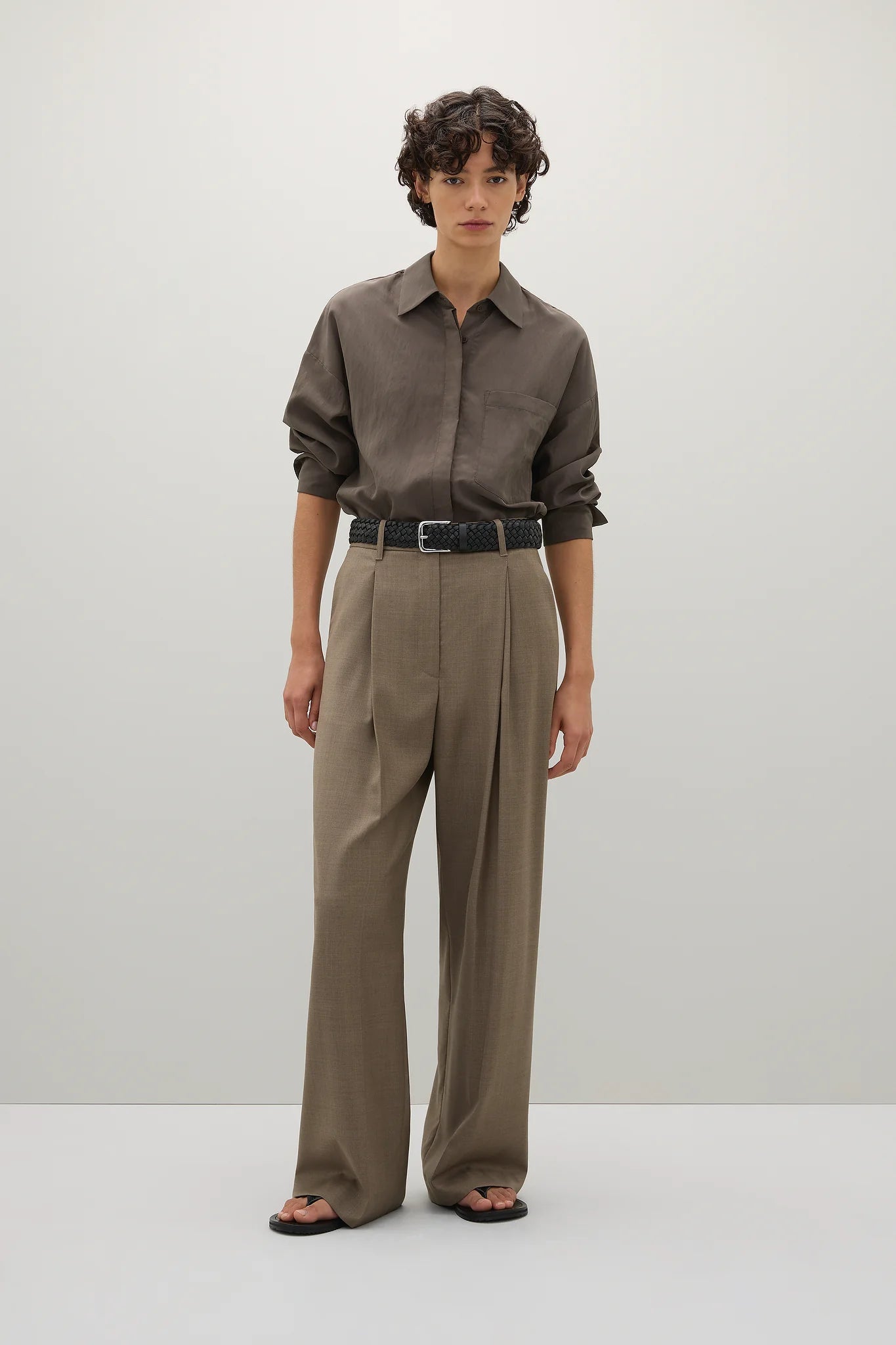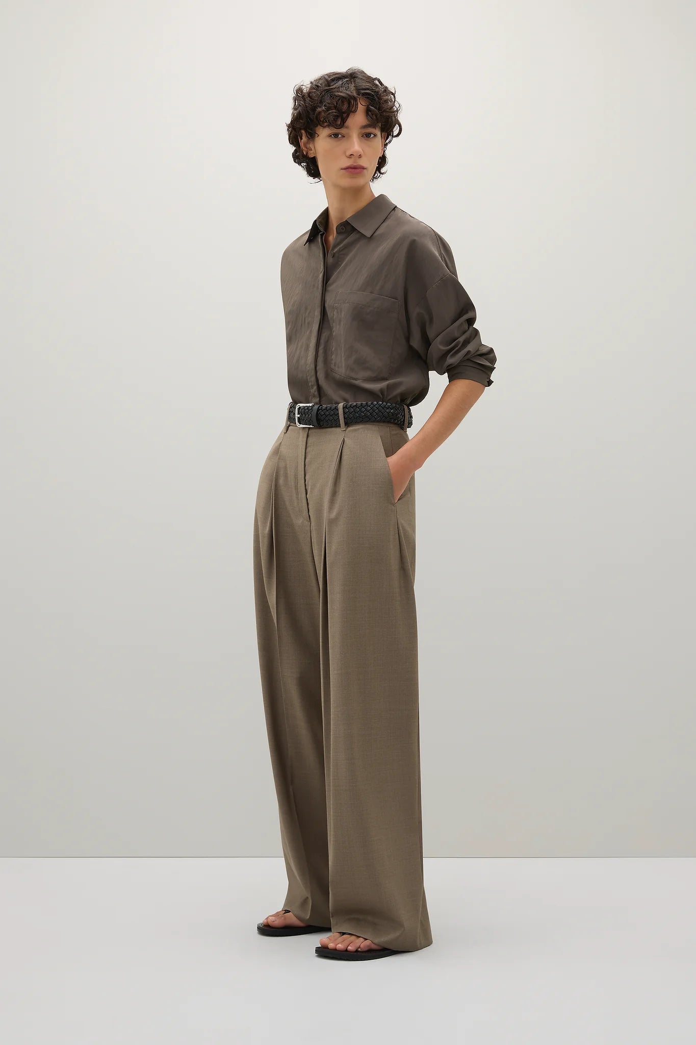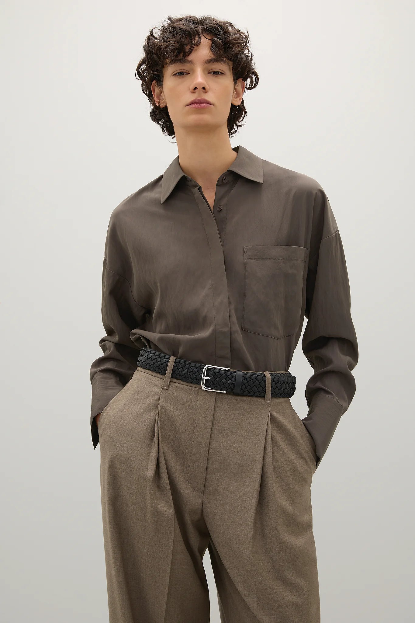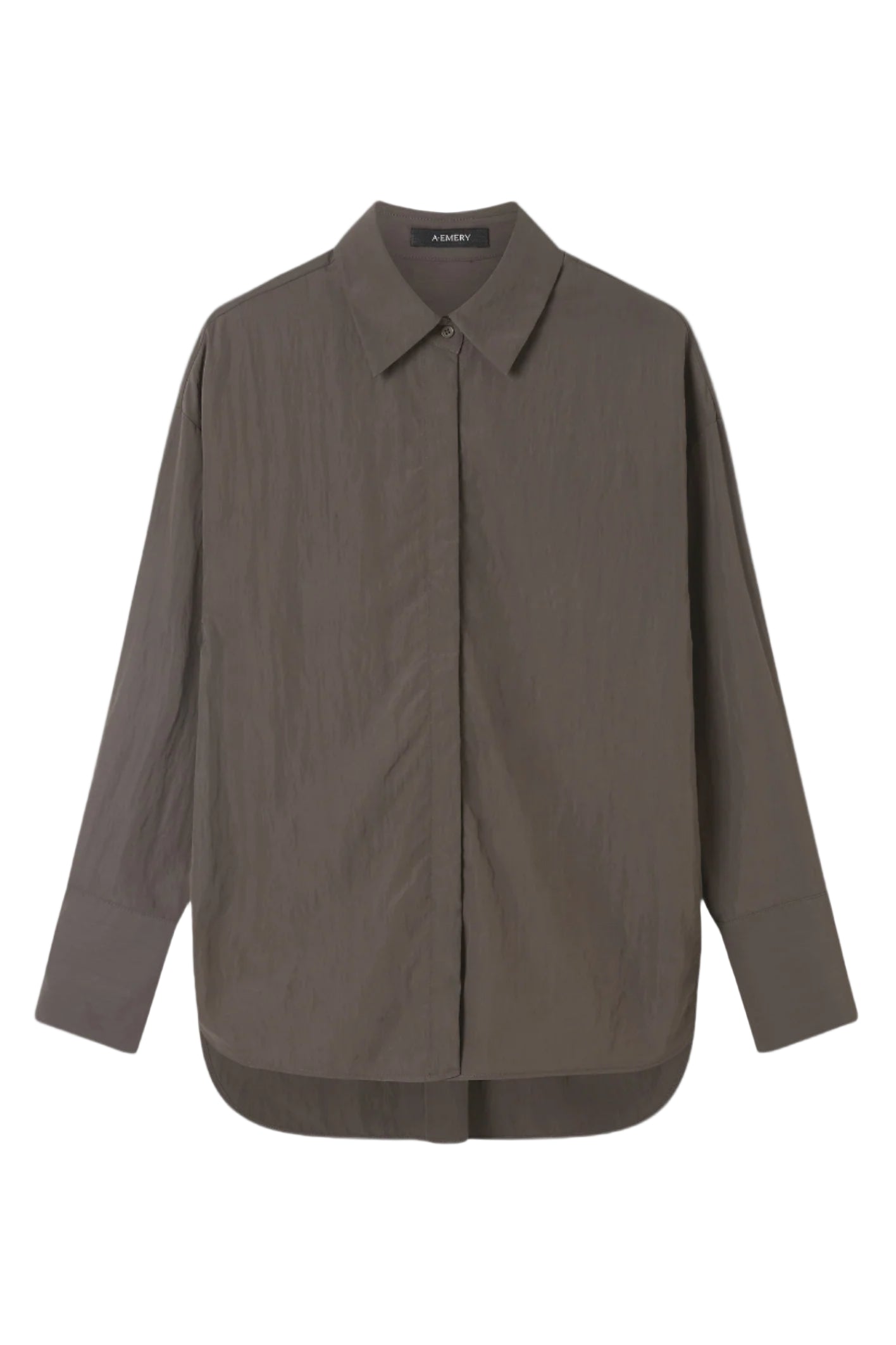 A Emery Boyd Shirt in Ash. The Boyd Shirt is a modern take on relaxed shirting. Crafted from a lightweight parachute textile, this generously cut shirt features wide cuffs, a curved hem and an enclosed centre front button placket.