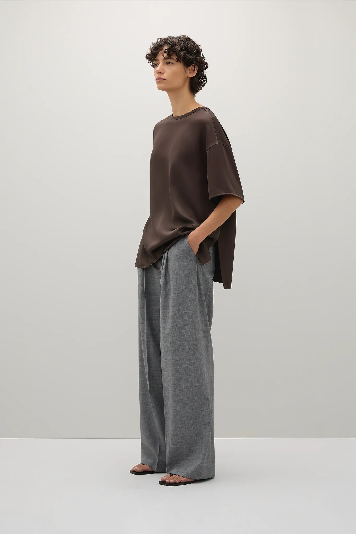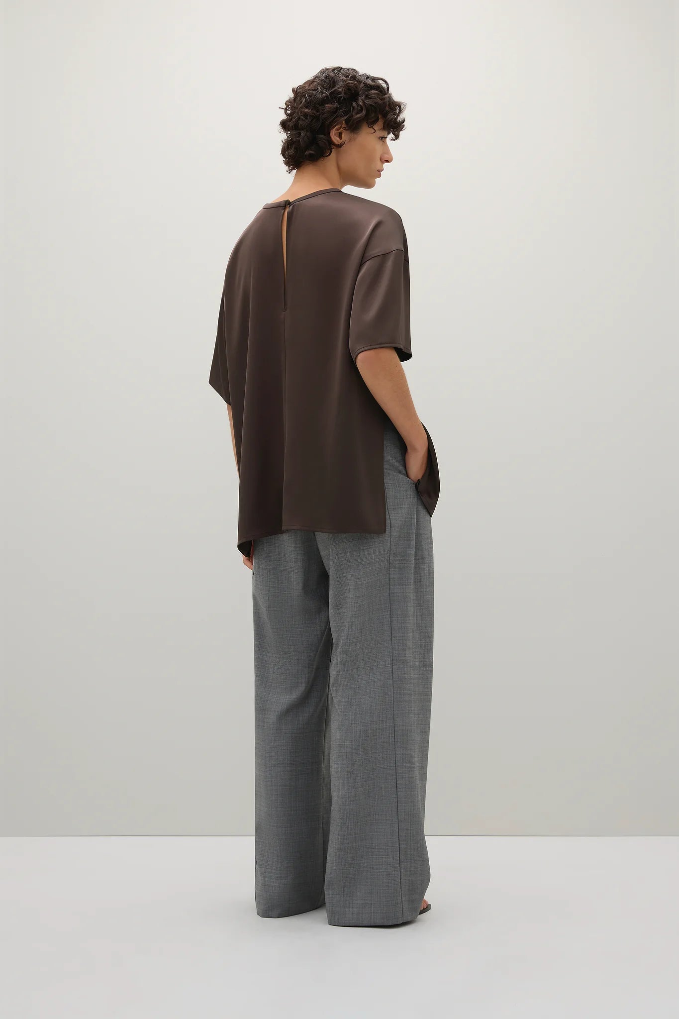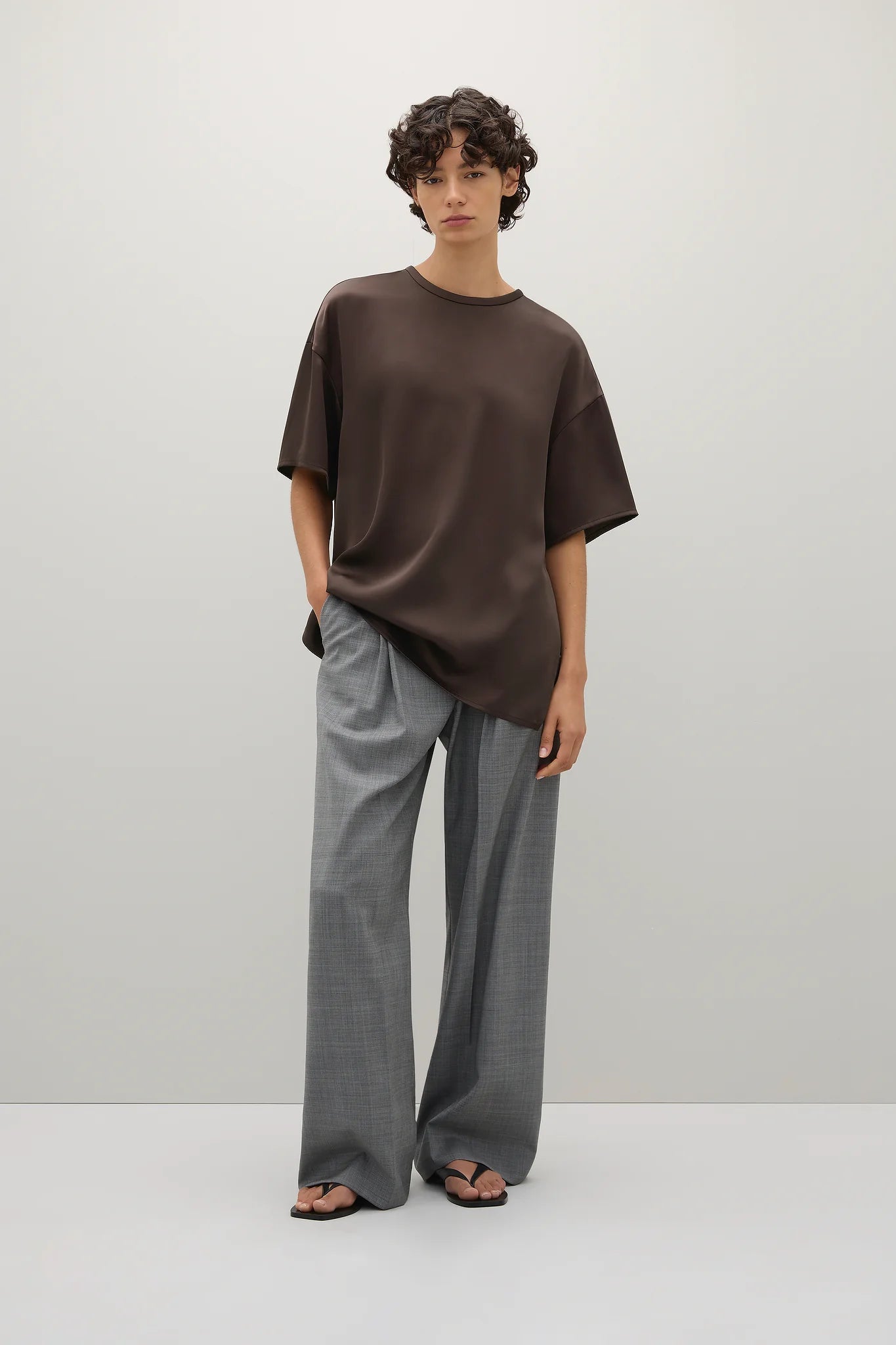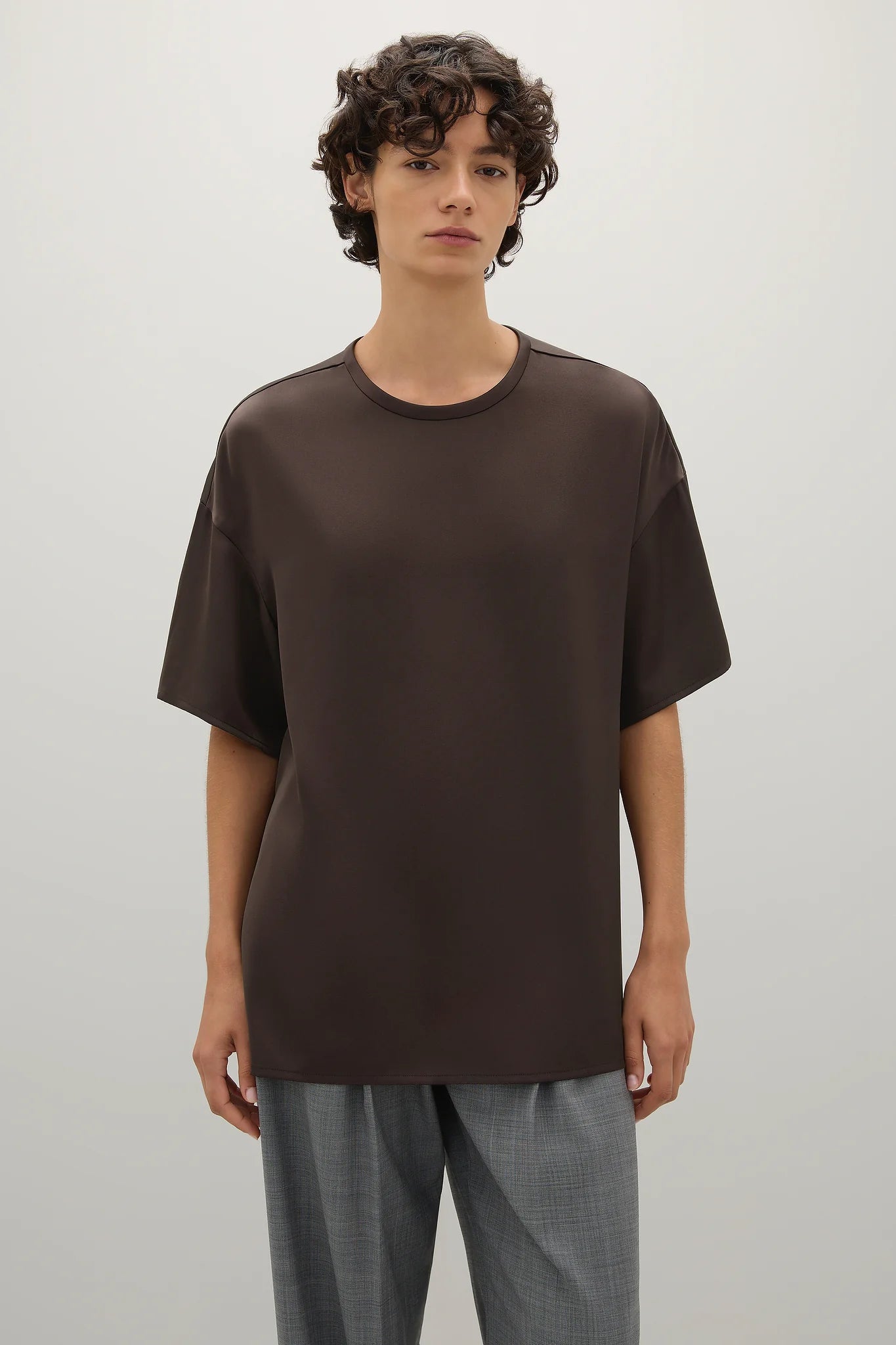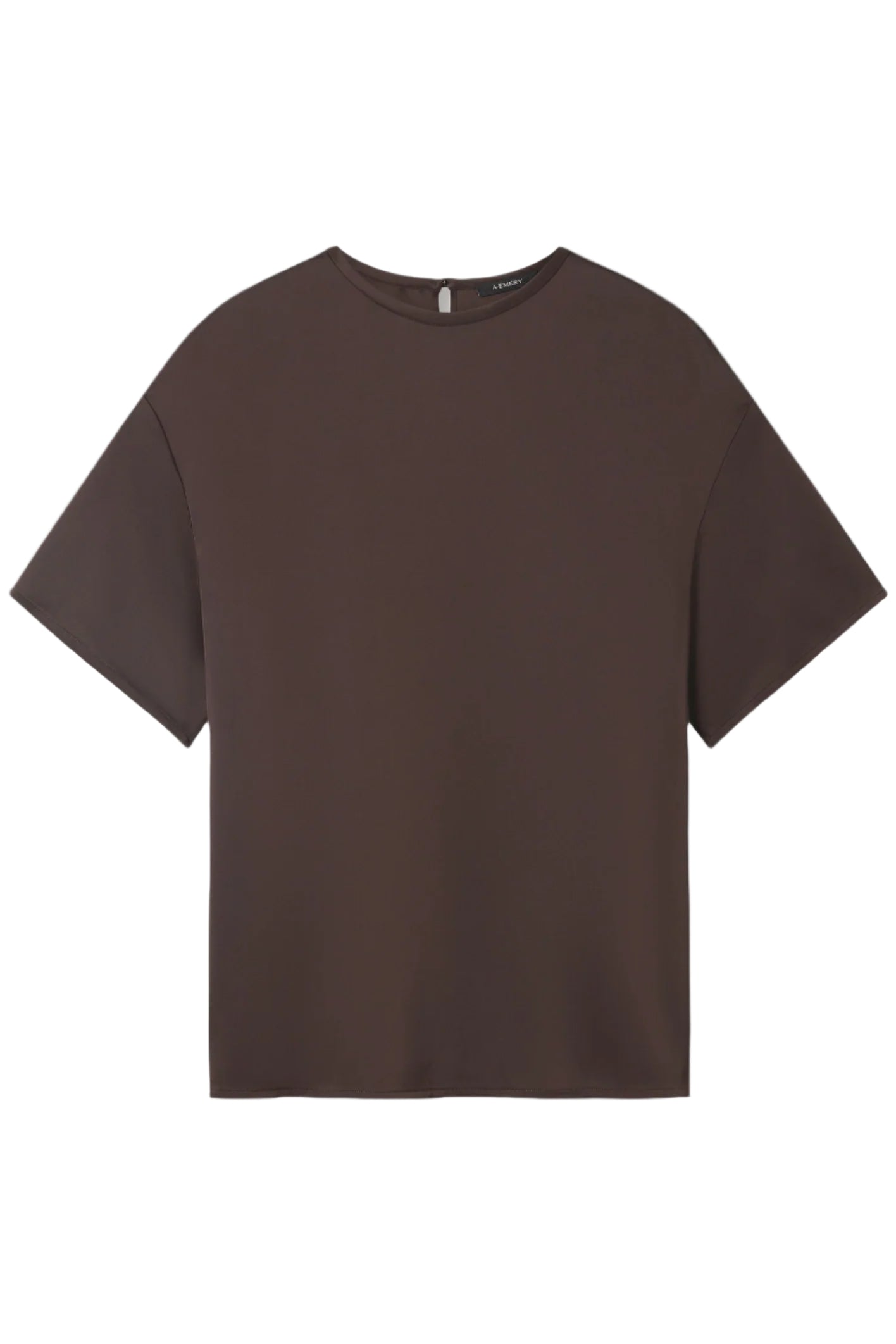 A Emery Bristowe T-Shirt in Umber. An elevated take on the classic tee, the Bristowe T-Shirt features a crew neck, split side seams, and an elegant centre back neckline closure. Crafted from Japanese triacetate for a refined finish.
