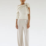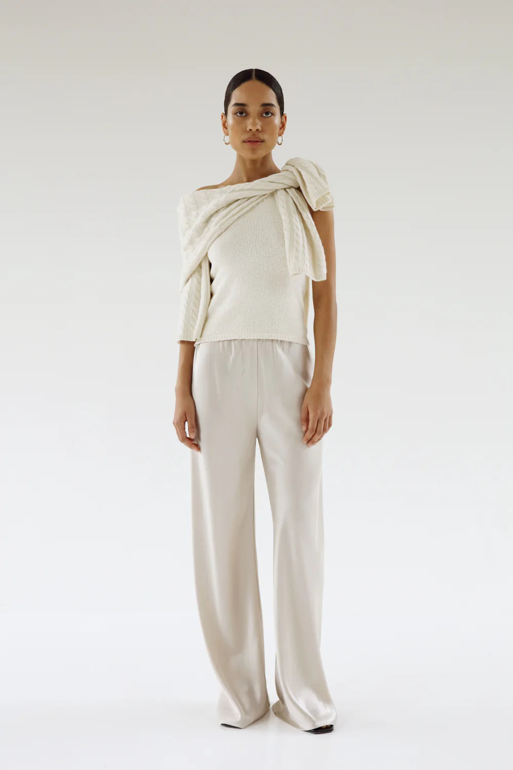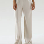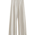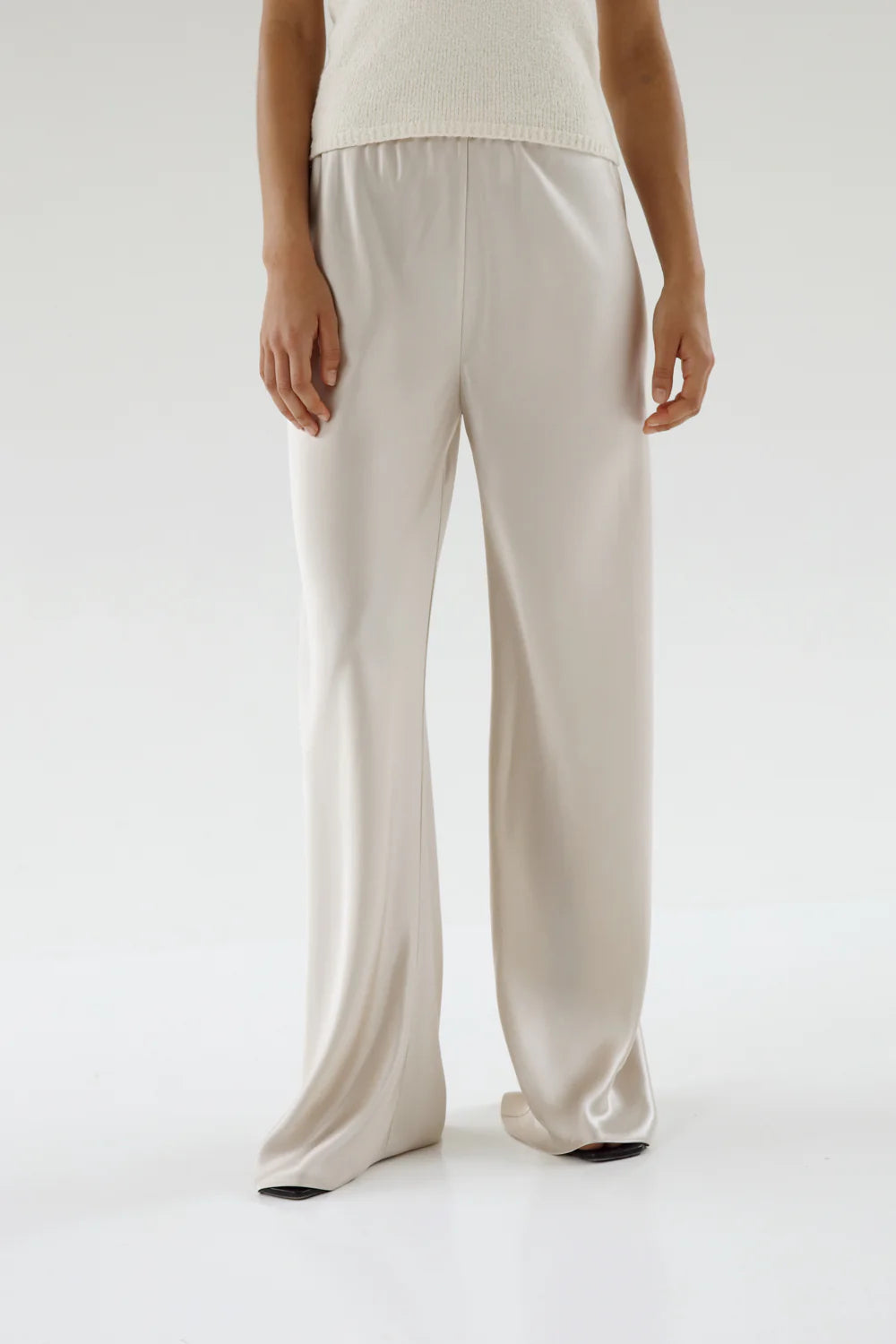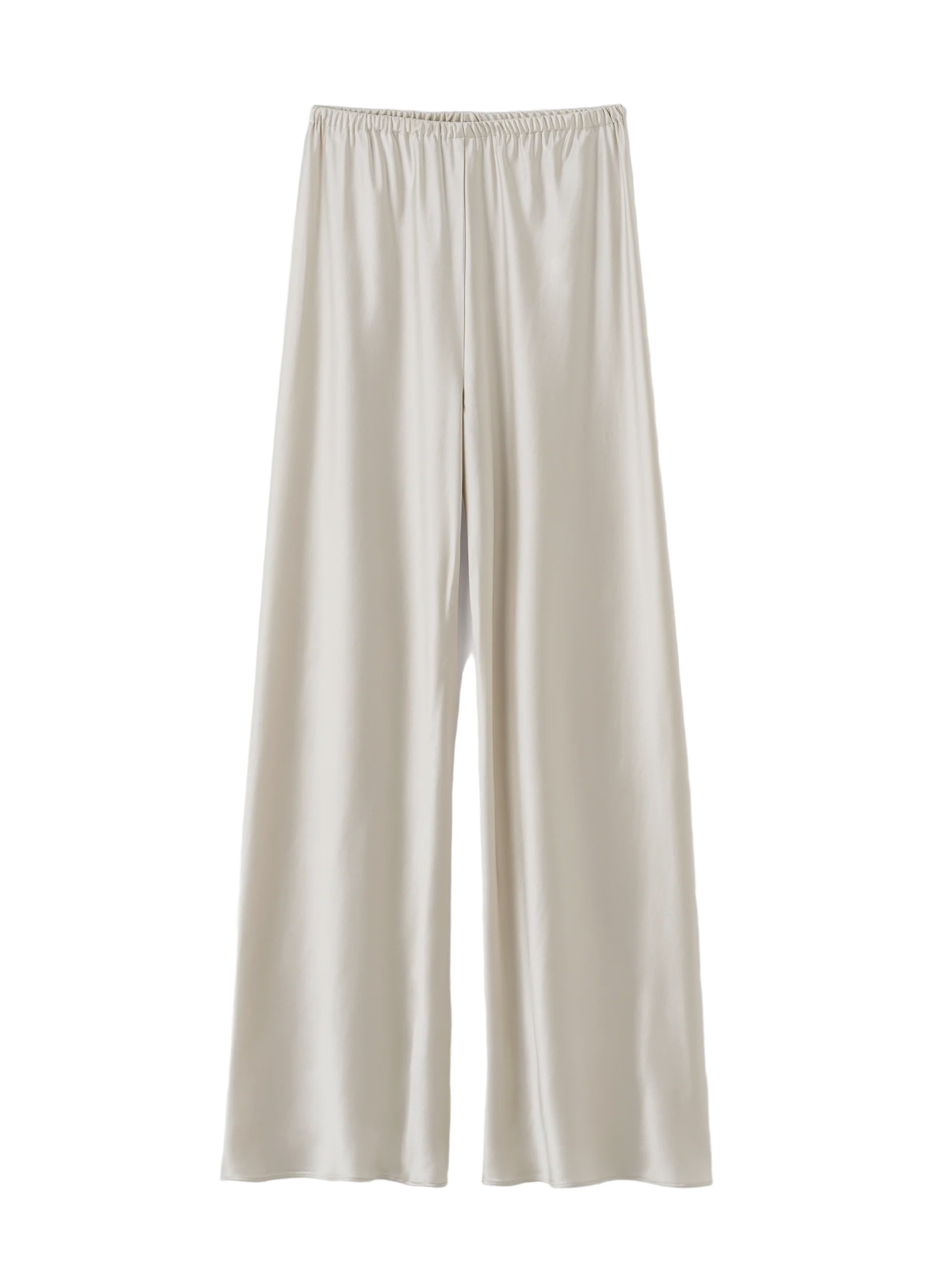Bias Satin Pants are made from a luxurious and responsible fabric comprising 75% Naia™ acetate and 25% polyester. This blend offers a sumptuous and environmentally conscious option compared to regular silk. The material has a naturally silky feel that is comfortable to wear and easy to care. Wrinkles less than silk, and can be washed in a washing machine without losing its shine and texture. The pants are designed with a high-rise and wide-leg fit, complemented by an elasticated waistband for added comfort. The elasticity of the waistband also provides flexibility in choosing how high or low you want to wear the pants. The bias cut enhances the pants' beautiful fall and overall appearance.
