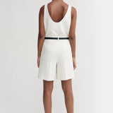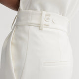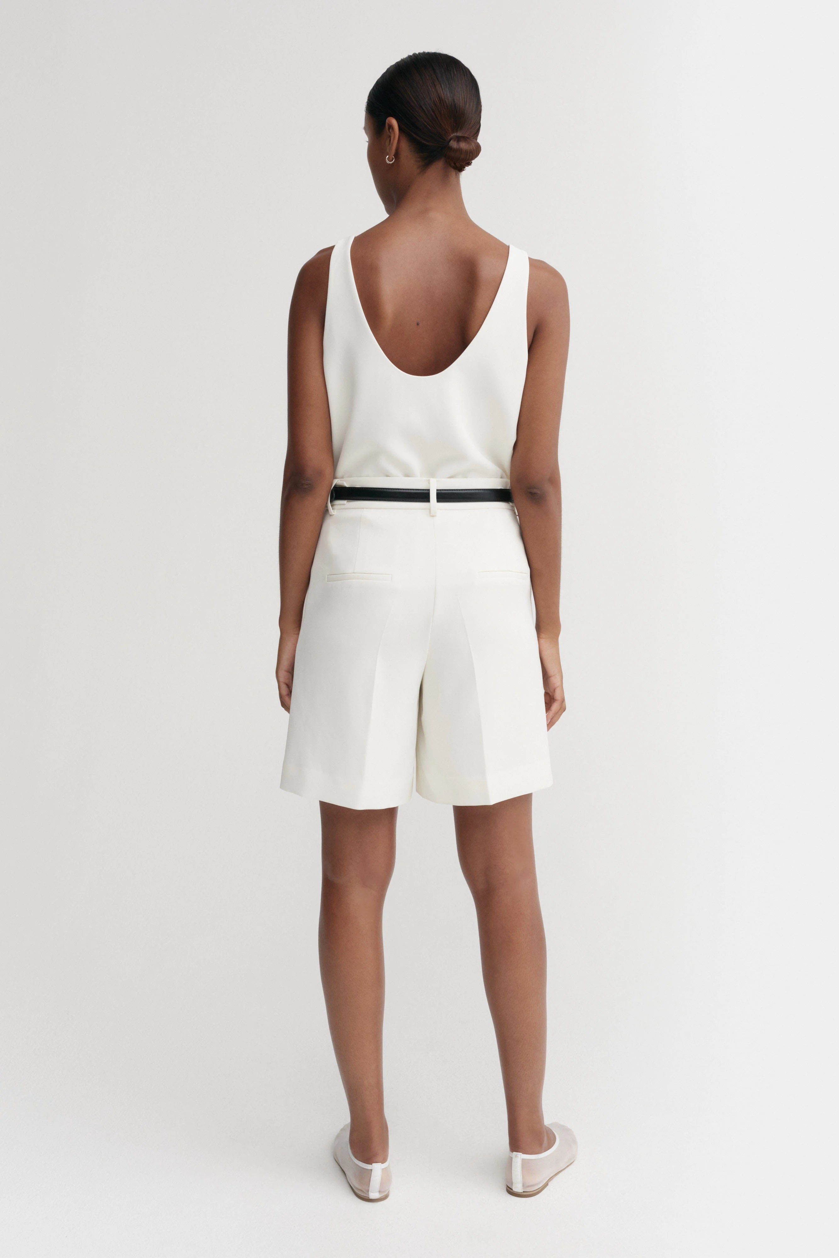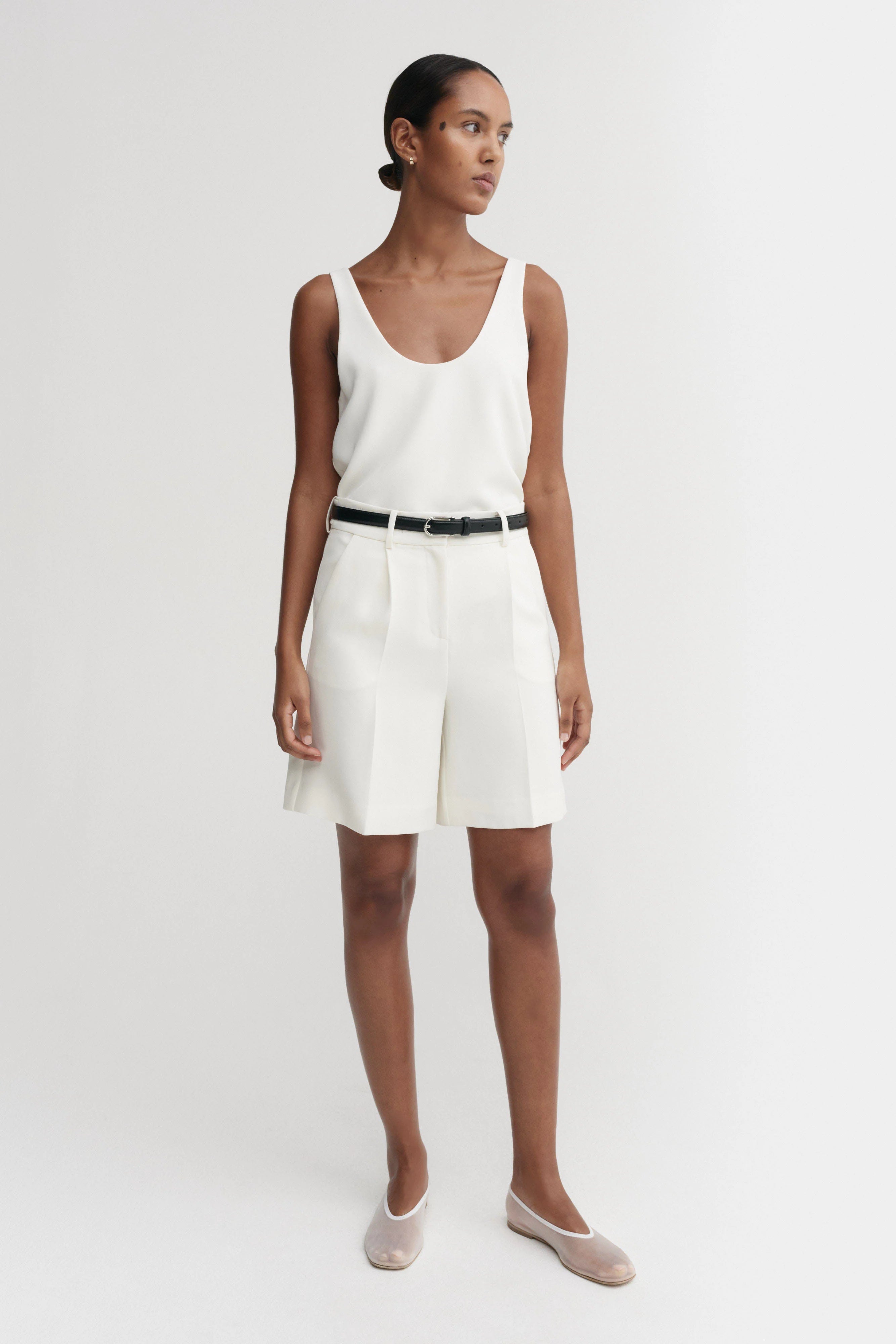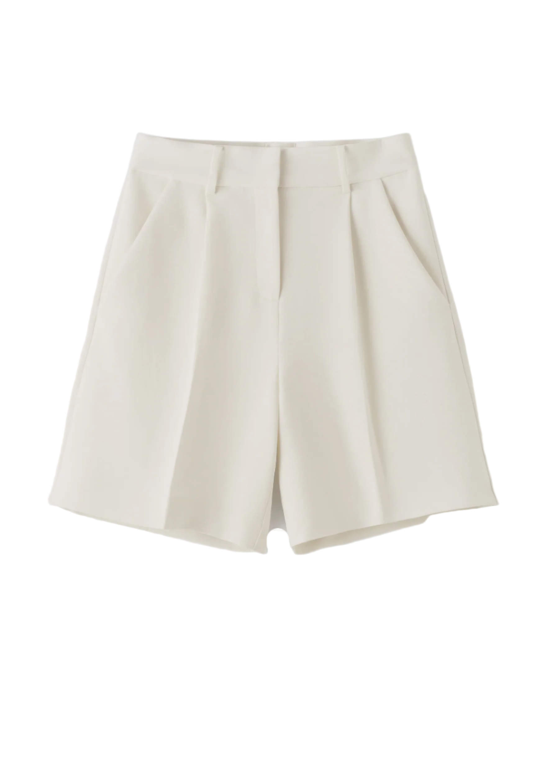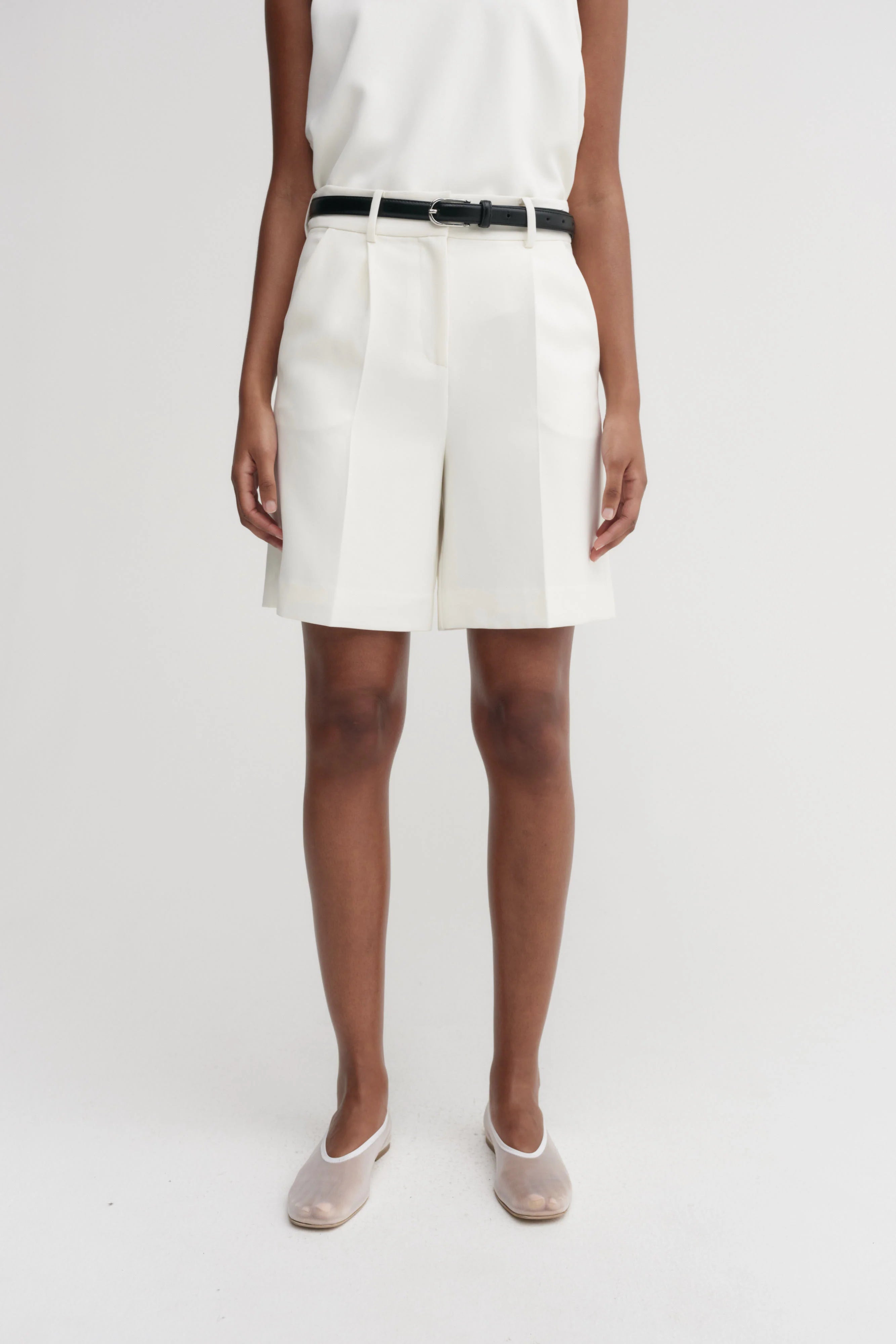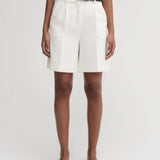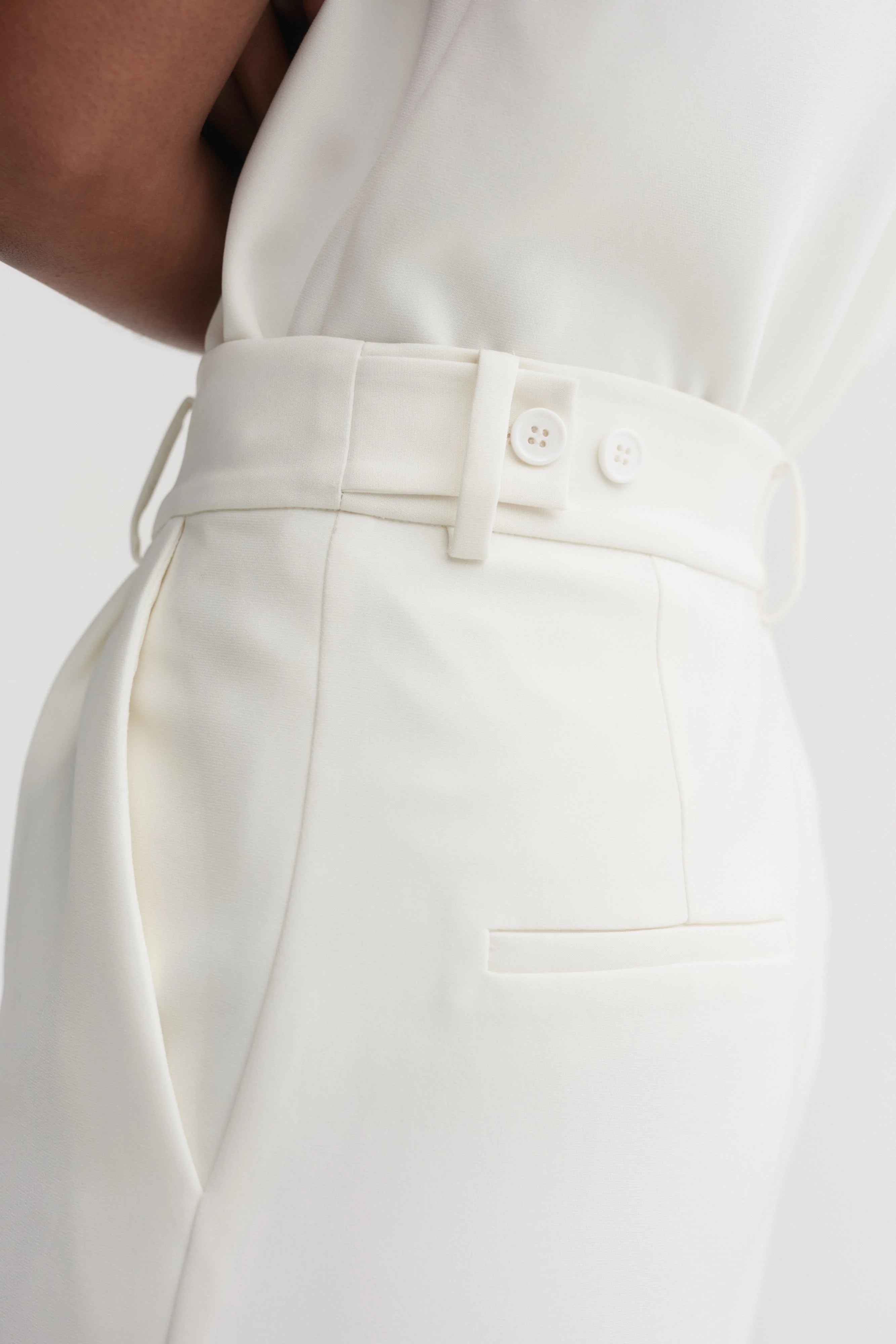 Almada Blair Crepe Shorts in Cream. Blair Crepe Shorts are made from a luxurious and responsible crepe fabric comprising 71% Naia™ acetate and 29% polyester. The shorts are tailored for a high-rise fit with pleats through the front to emphasize the slightly loose straight silhouette. Finished with belt loops and adjustable tabs at the waist for a comfortable fit.