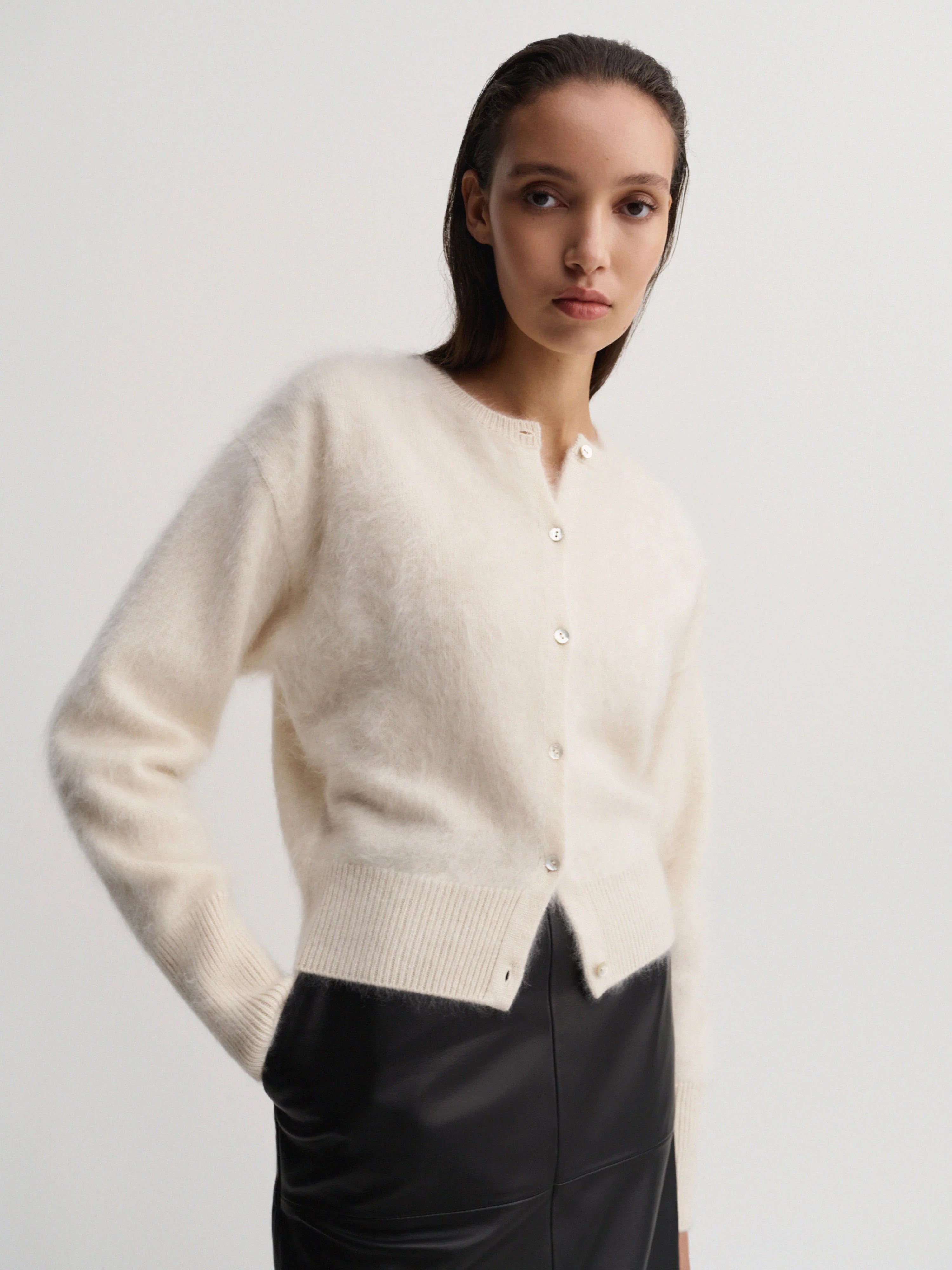 Almada Coco Brushed Cardigan in Vanilla. Coco Brushed Cardigan is knitted from super soft brushed cashmere with a hairy finish. The cardigan is designed for a slightly loose fit with a silhouette that sits tighter on the waist and end of the sleeves for easy roll up. It is featured with a classic crew neckline, dropped shoulders and fastens with tonal cashmere buttons through the front. Rib-knitted detailing in cuffs and hem.