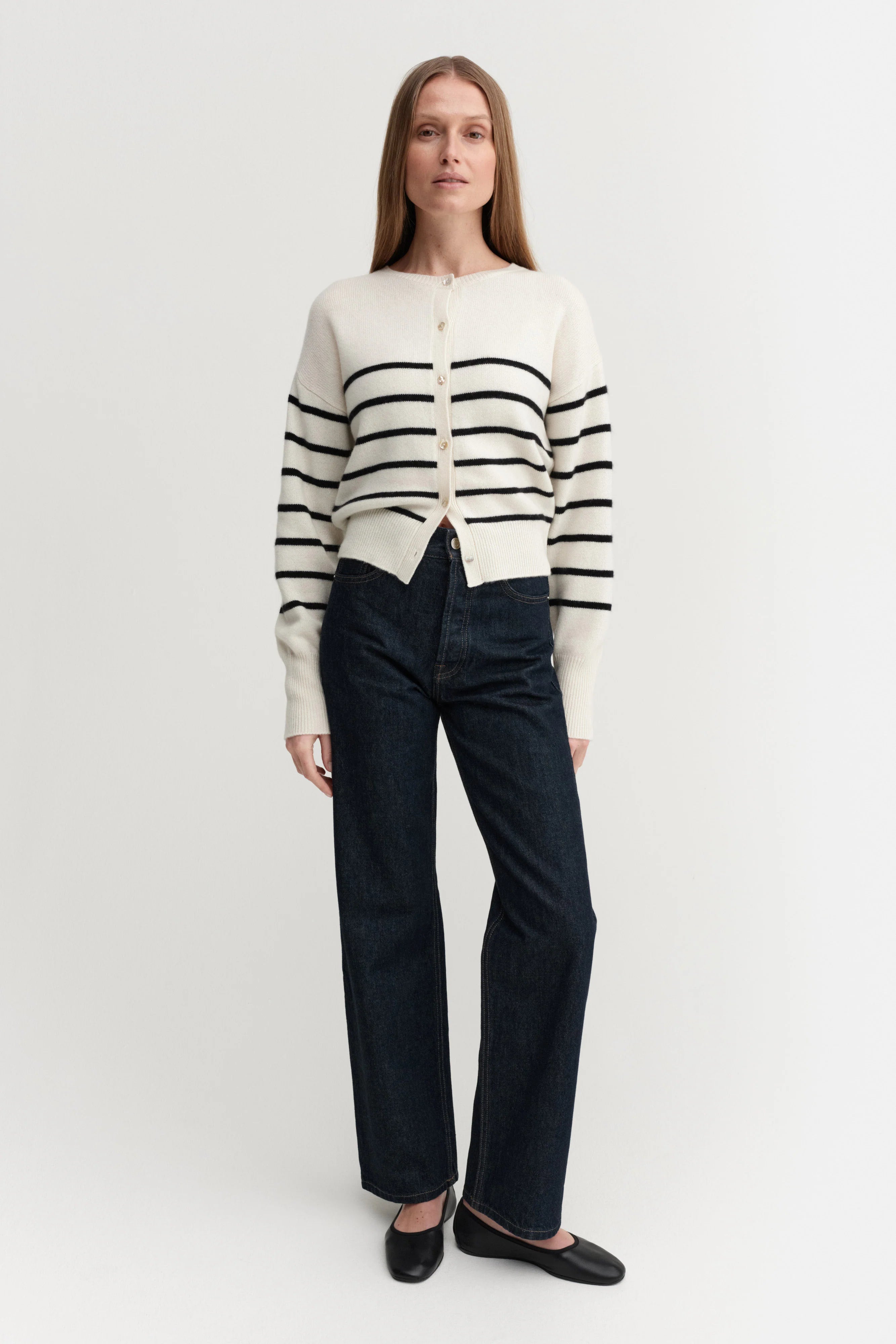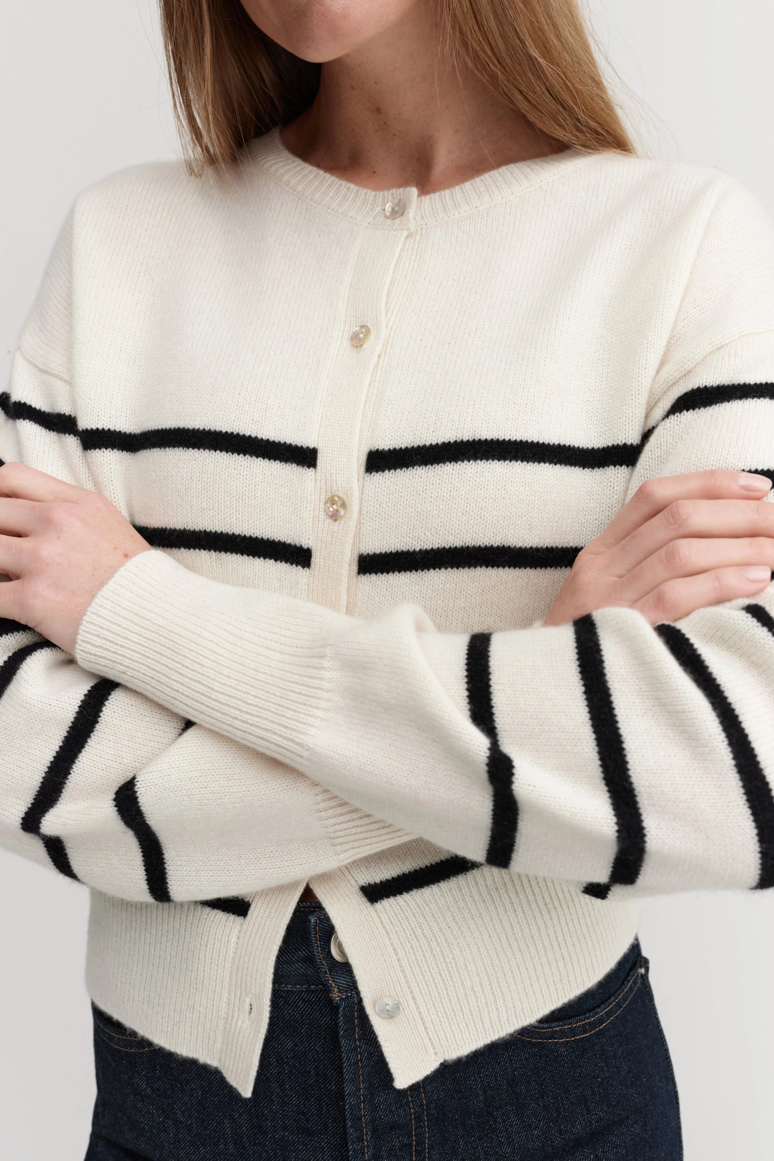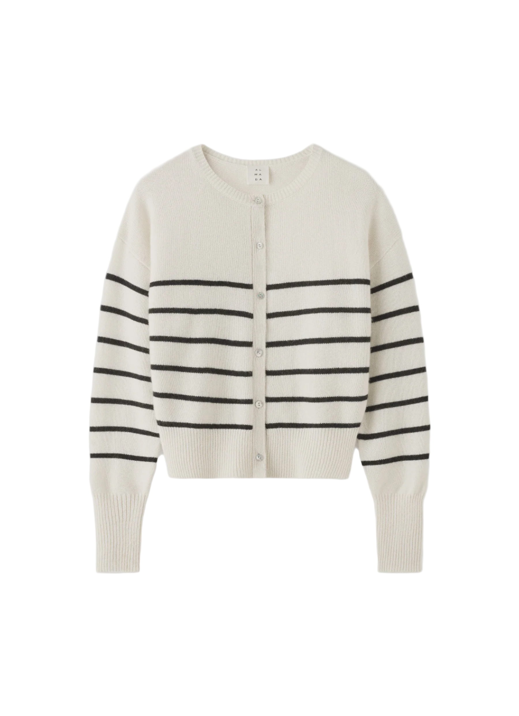 Almada Coco Cardigan in Stripe. Coco Cardigan is knitted from super soft Mongolian cashmere that feels silky smooth against the skin and doesn't itch. The cardigan is designed for a slightly loose fit with a silhouette that sits tighter on the waist and end of the sleeves for easy roll up. It is featured with a classic crew neckline, dropped shoulders and fastens with shell buttons through the front. Rib-knitted detailing in collar, cuffs and hem.