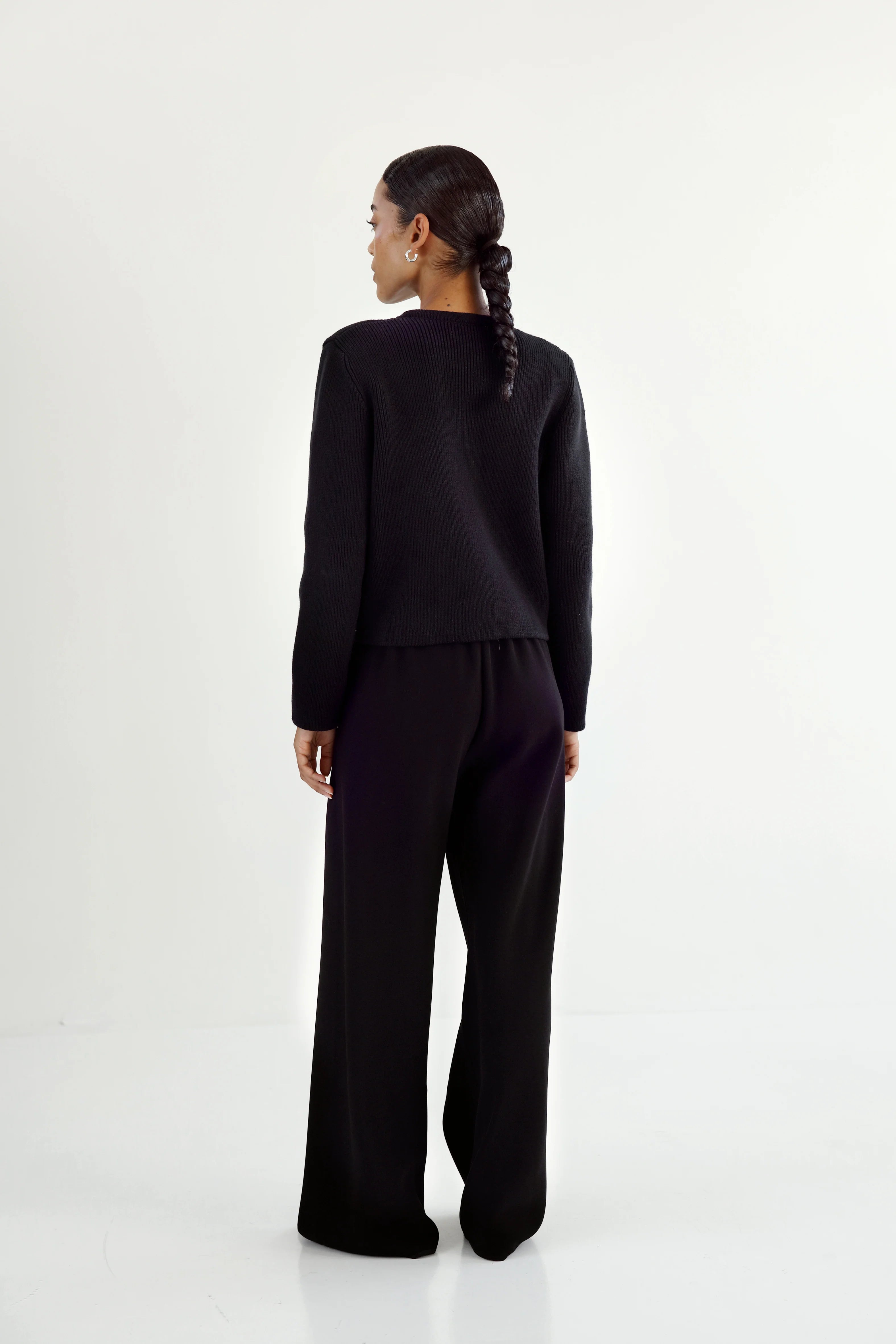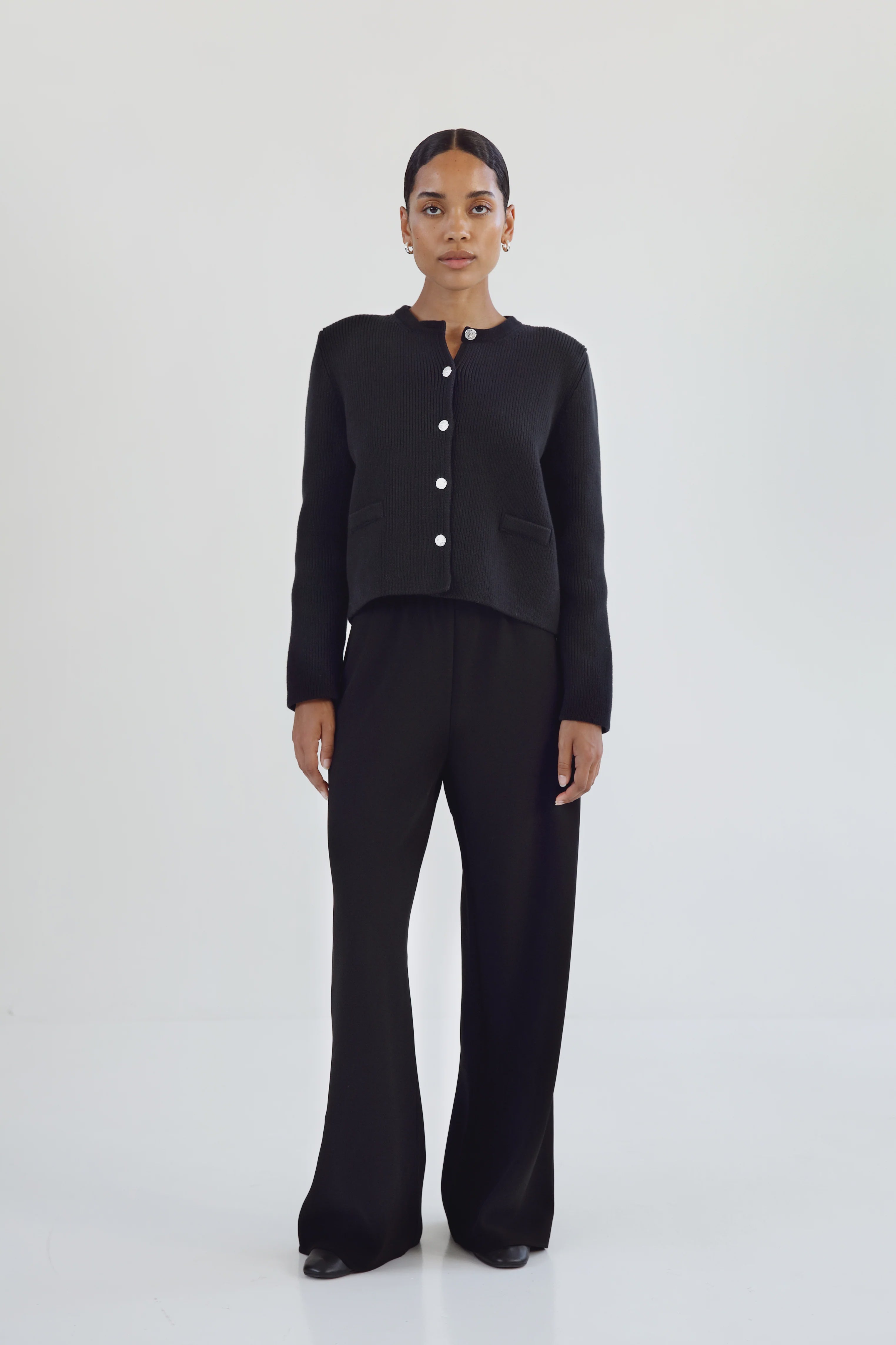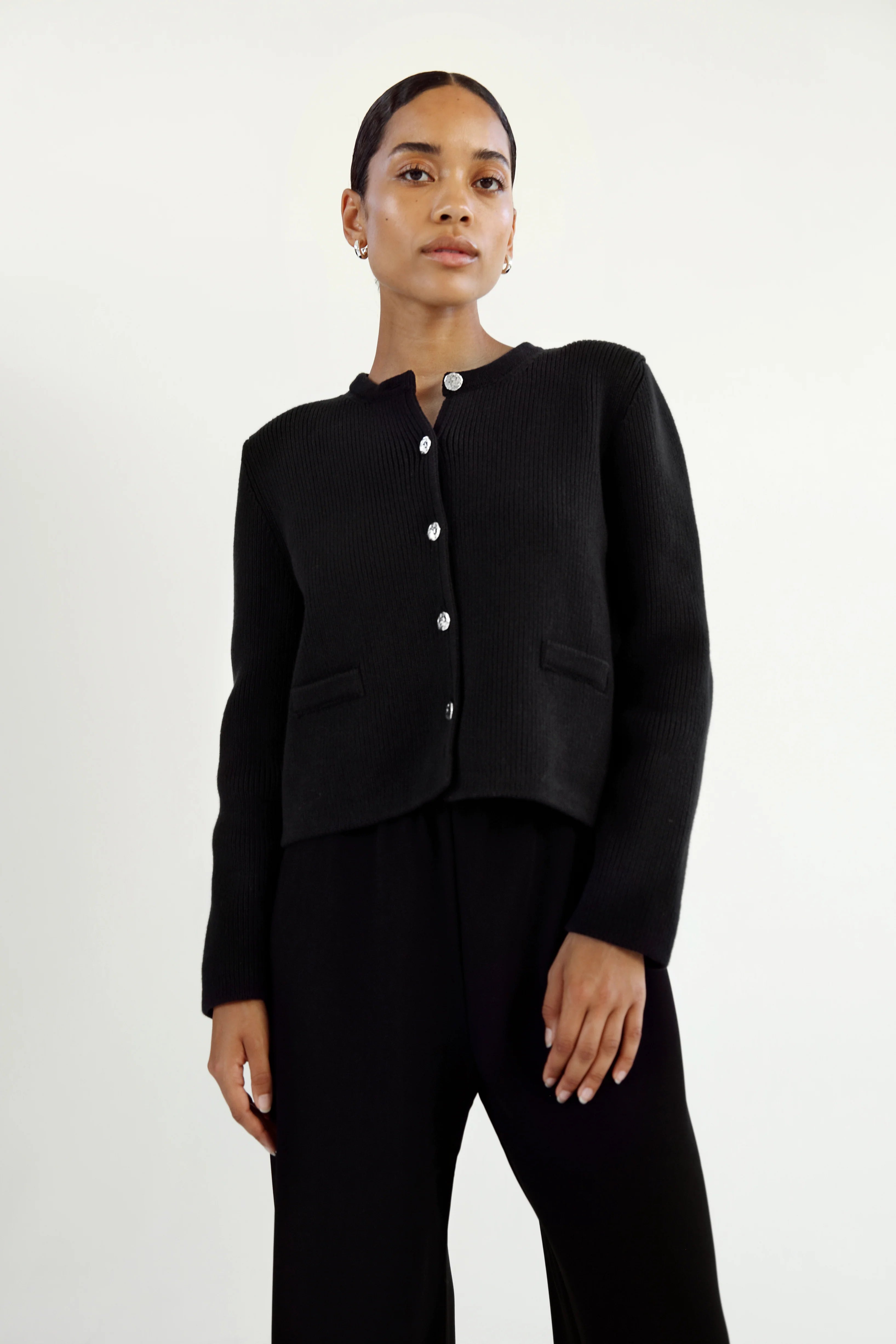 Almada Nova Cardigan in Black. Nova Cardigan is knitted from organic cotton. The cardigan is cut for a feminine slim fitted silhouette and has small removable shoulder pads for extra posture. Detailed with silver-toned buttons and welt pockets.