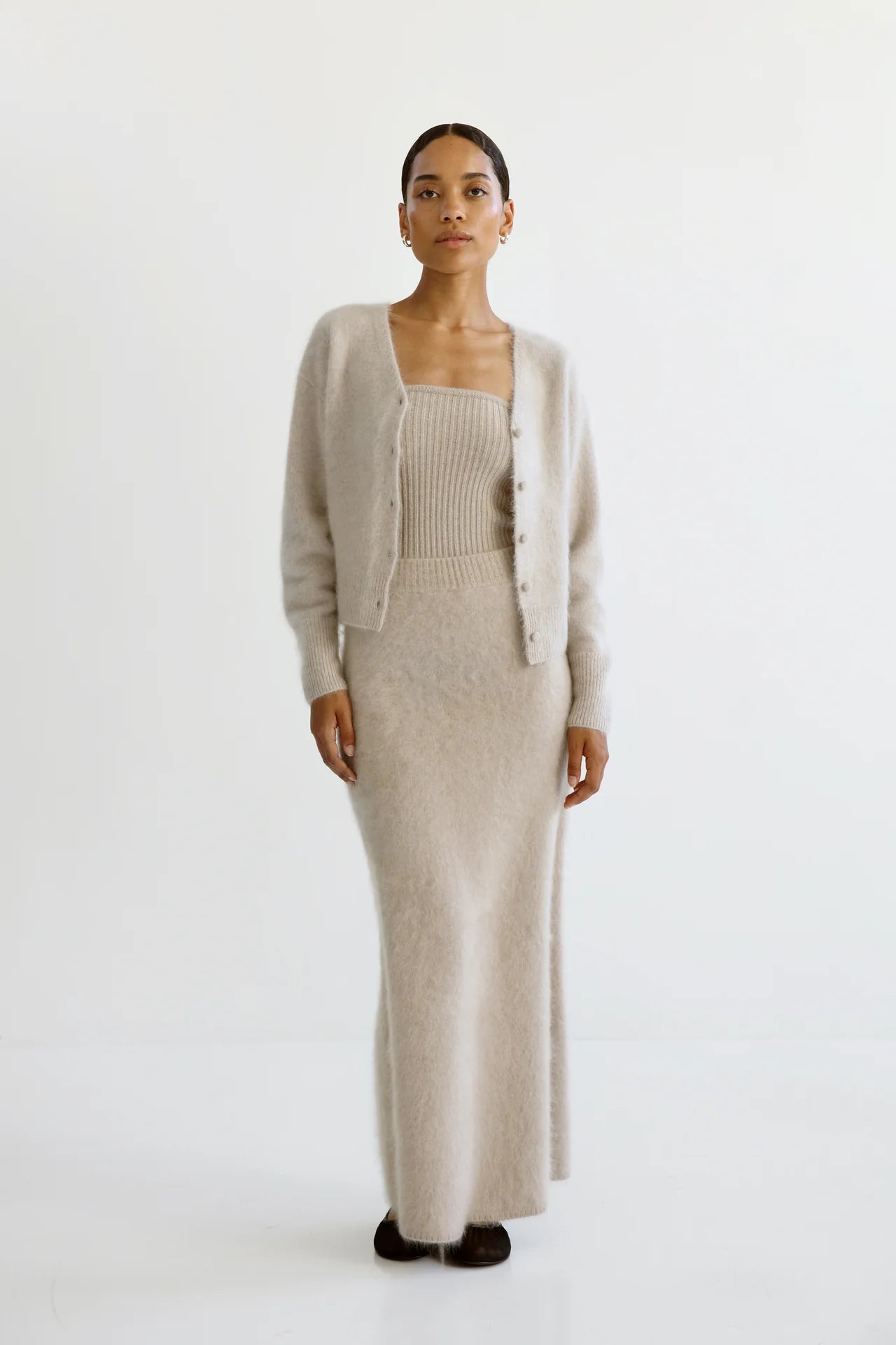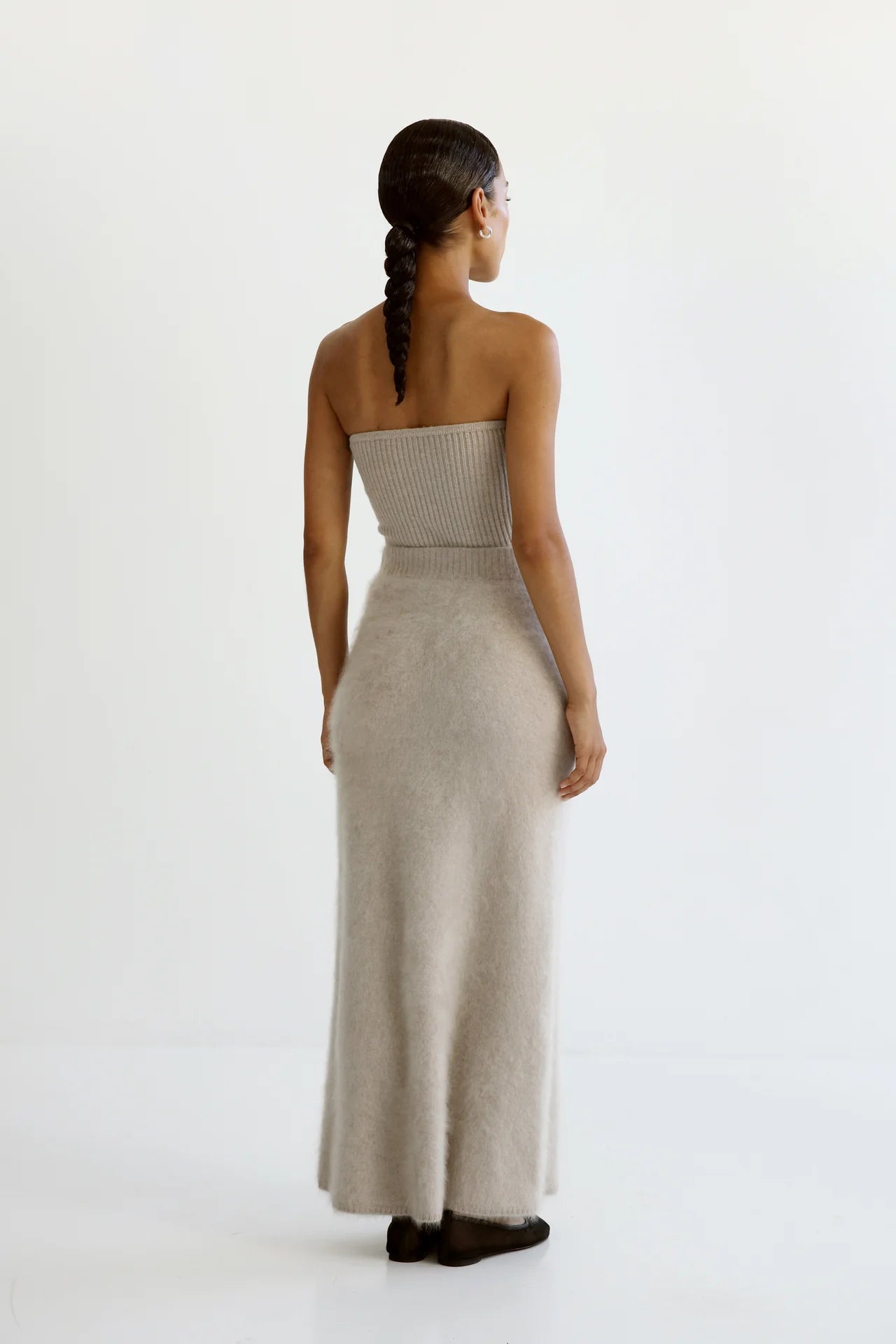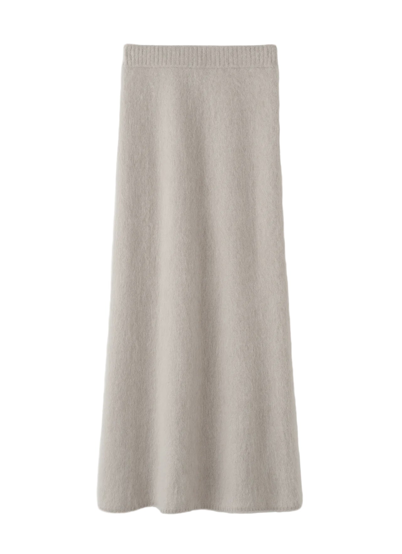 Almada Umi Brushed Cashmere Skirt in Taupe. Umi Skirt is knitted from super soft brushed cashmere with a hairy yet smooth finish. It is cut for a subtle A-line silhouette and is featured with a ribbed elasticated waistband and wide ribbed hem. The voluminous maxi-length skirt is designed to be worn at the waist.