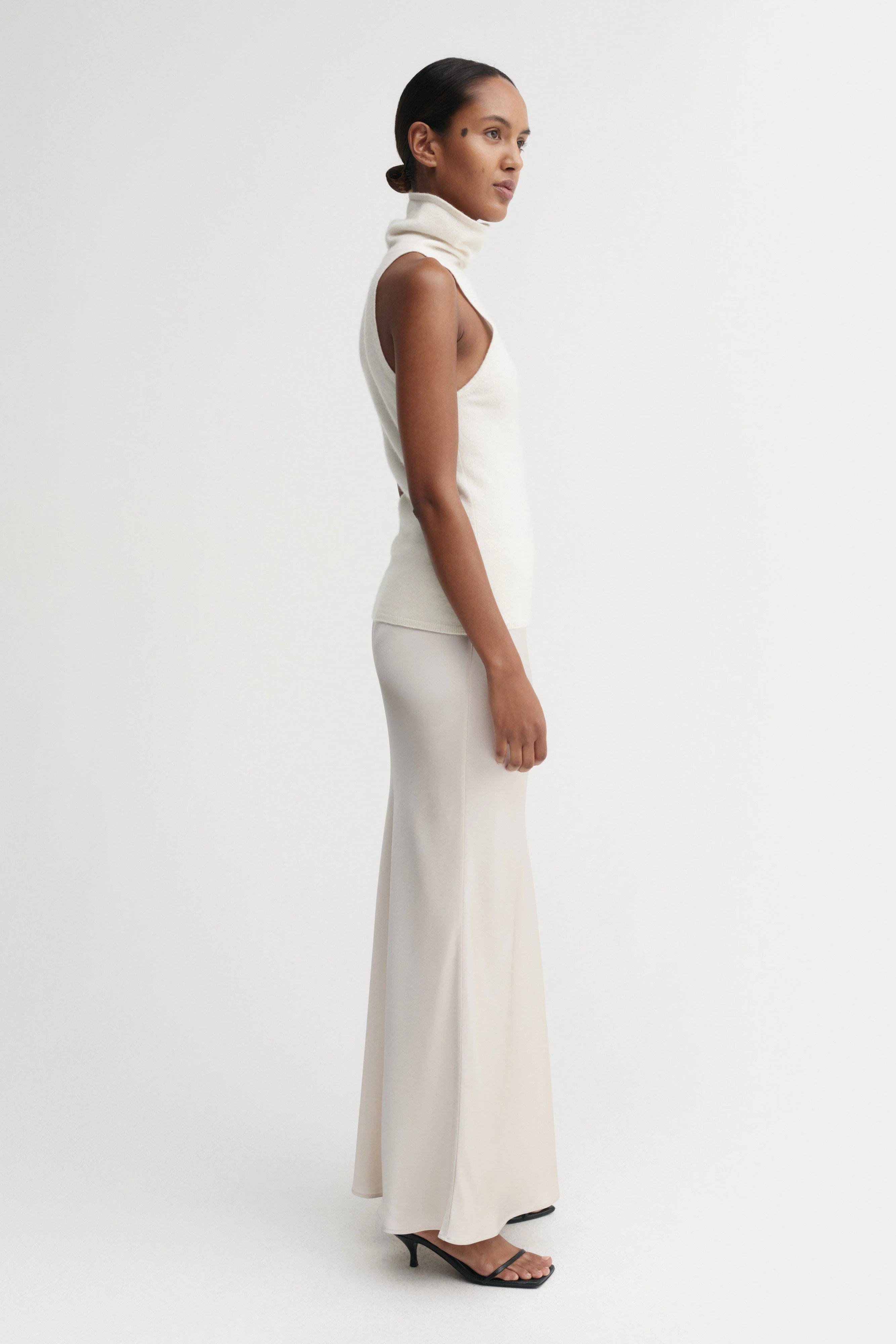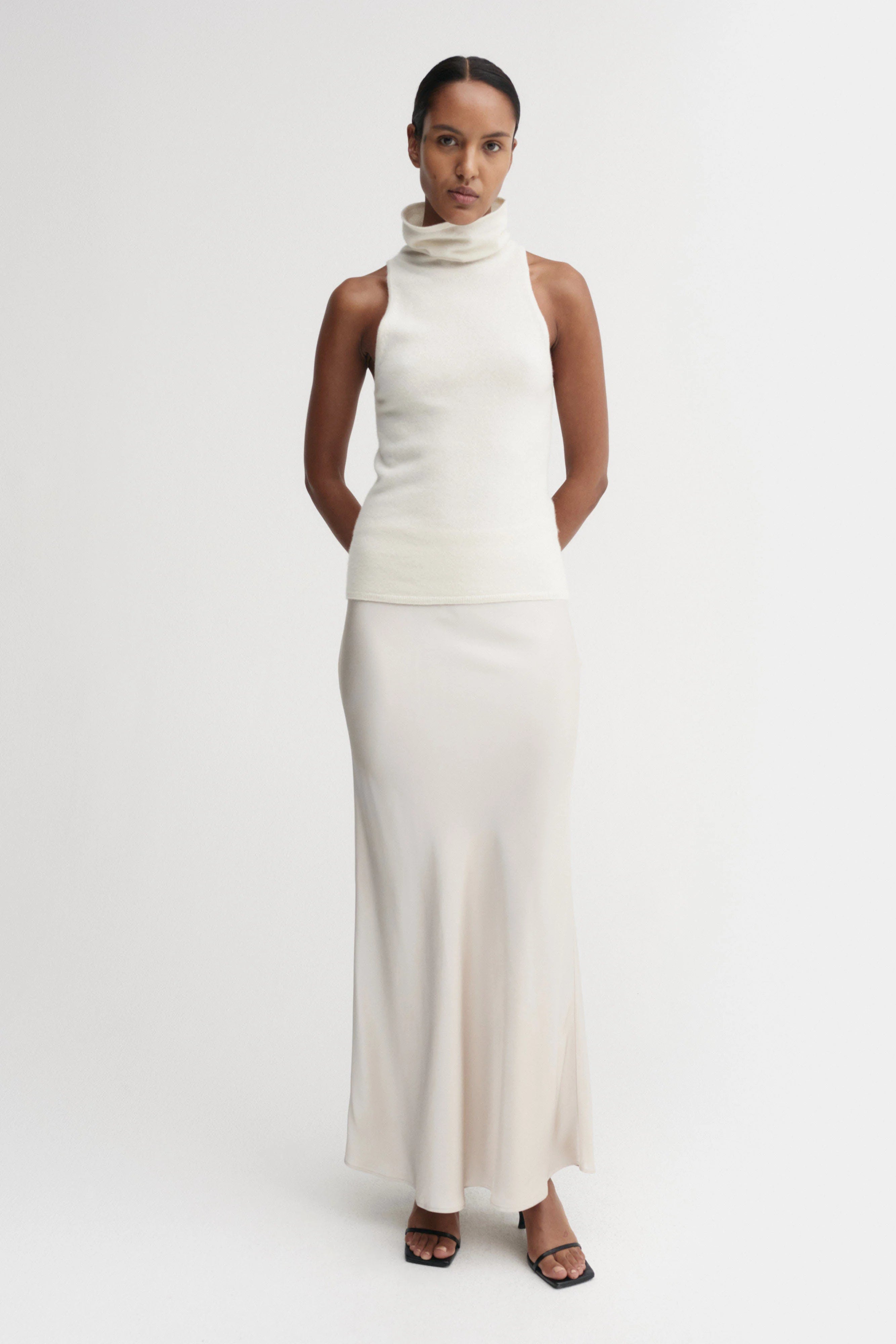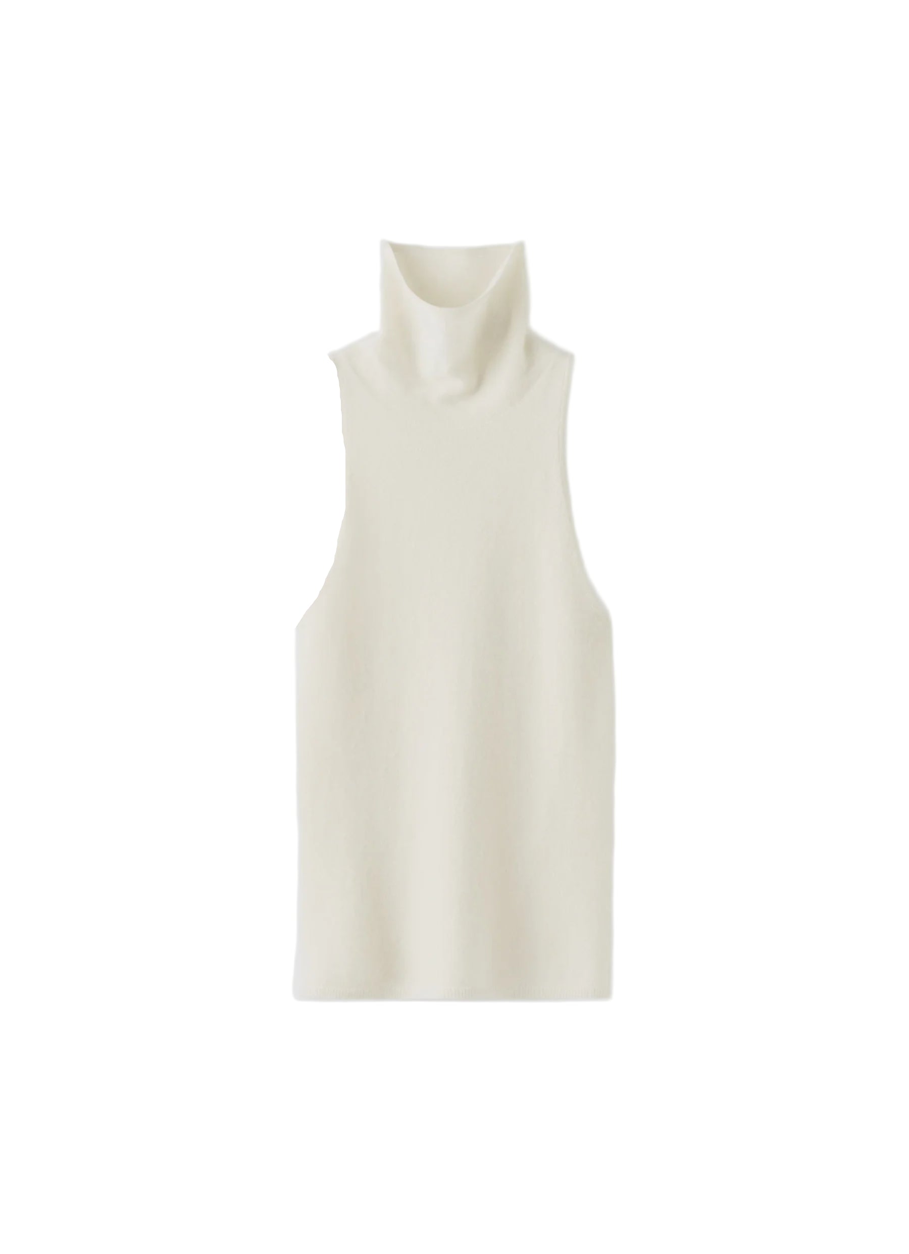 Almada Vida Top in Cream. Vida Top is knitted from finely knitted from super soft cashmere. It is cut for a feminine slim fit and has a racer-back silhouette. Effortless to layer and easy to tuck in.
