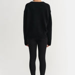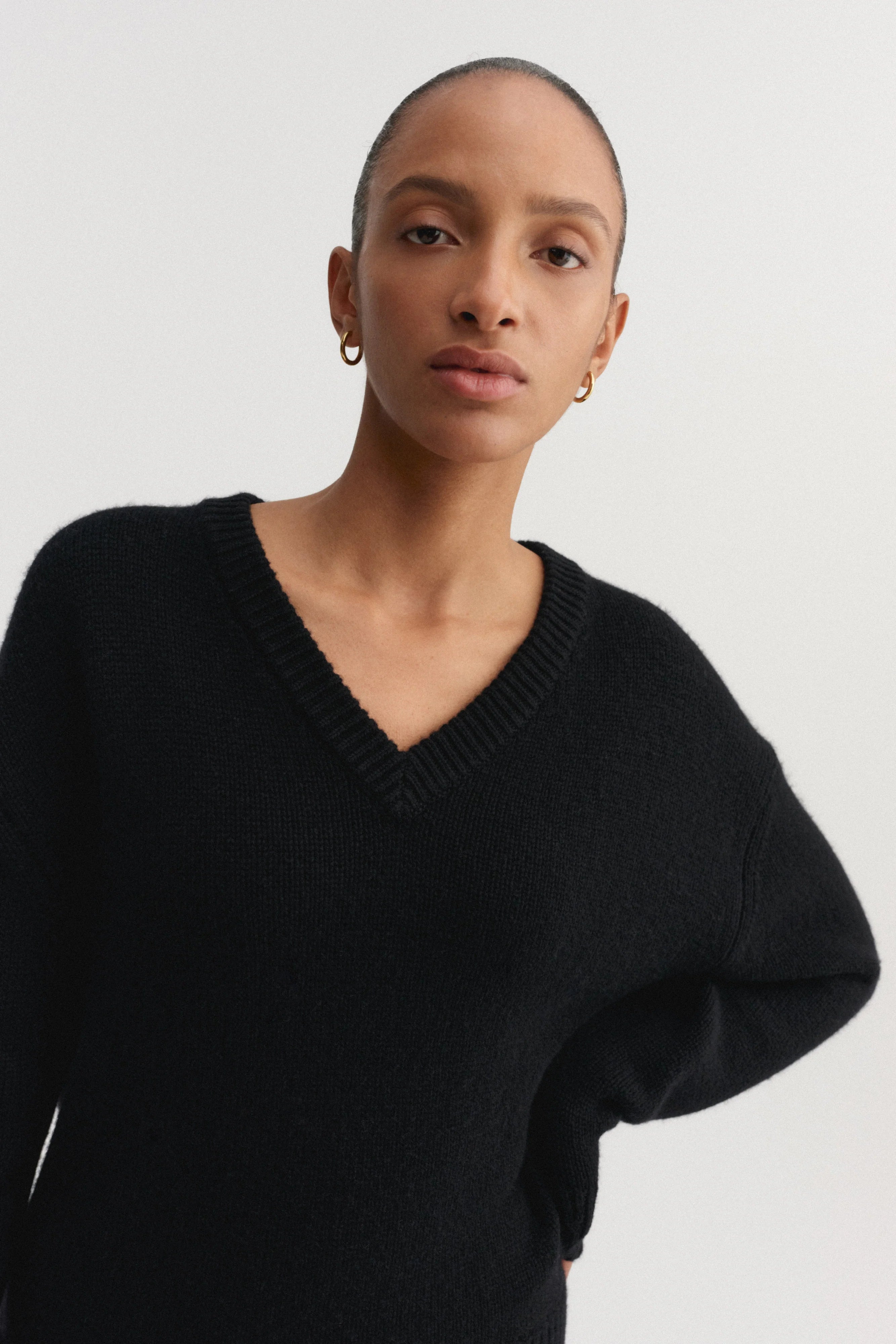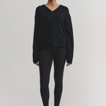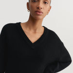 Almada Yara V Neck in Black. Yara V-Neck Sweater is knitted from the softest cashmere and merino wool blend, providing a smooth and itch-free feel against the skin. The sweater has a classic V-neckline and is designed for a relaxed loose fit. Featured with dropped shoulders and completed with a ribbed neckline, cuffs and hem.