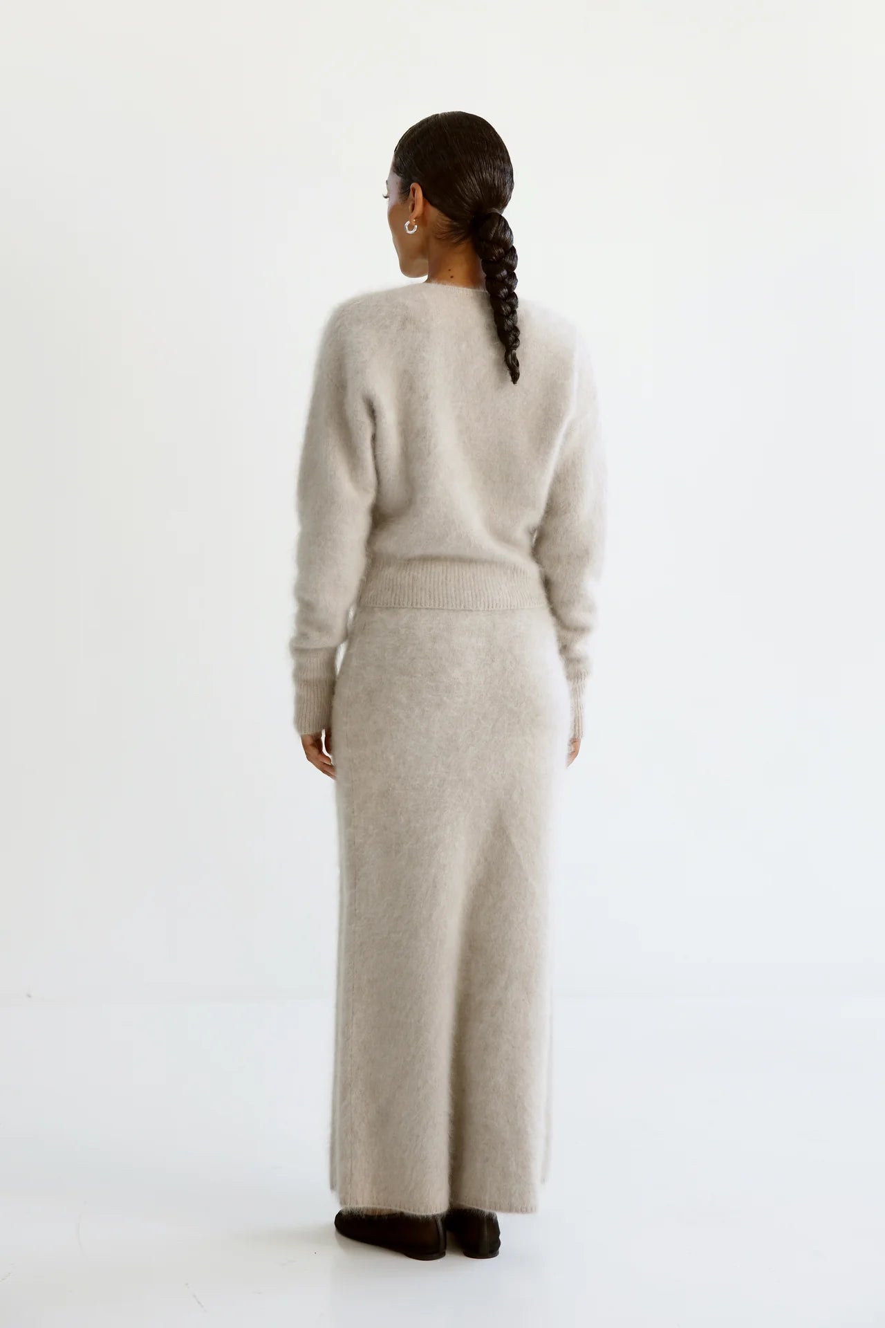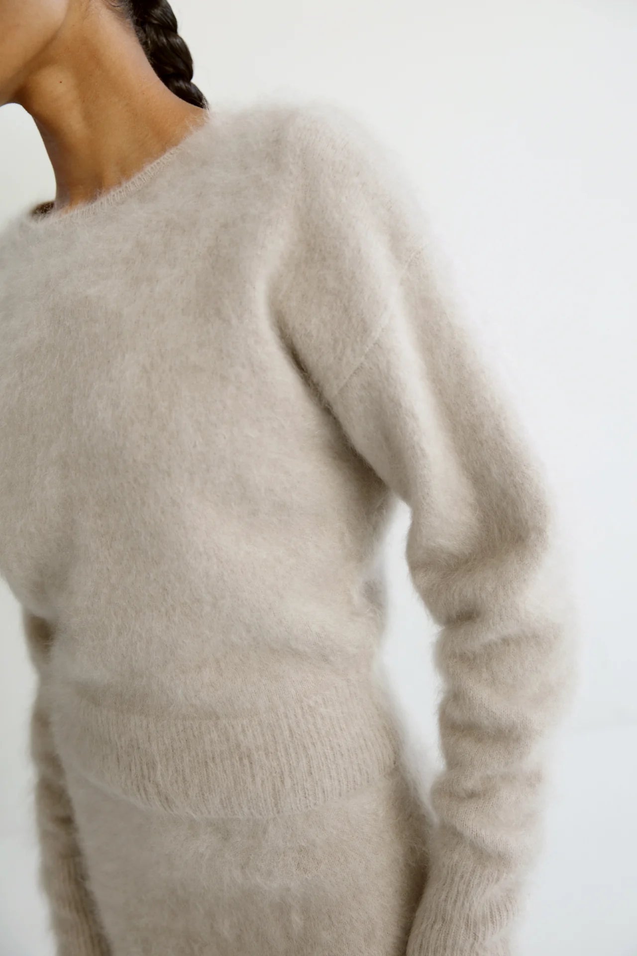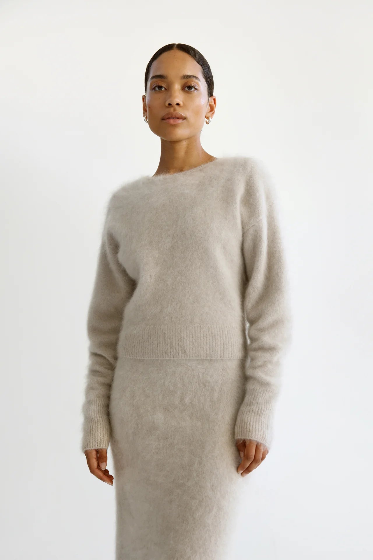 Zoe Crewneck Sweater is knitted from super soft brushed cashmere with a hairy finish. The sweater has a slightly loose fit with a silhouette that sits tighter on the waist and end of the sleeves for easy roll up. It is featured with a classic crew neckline and dropped shoulders. Rib-knitted detailing in collar, cuffs and hem.