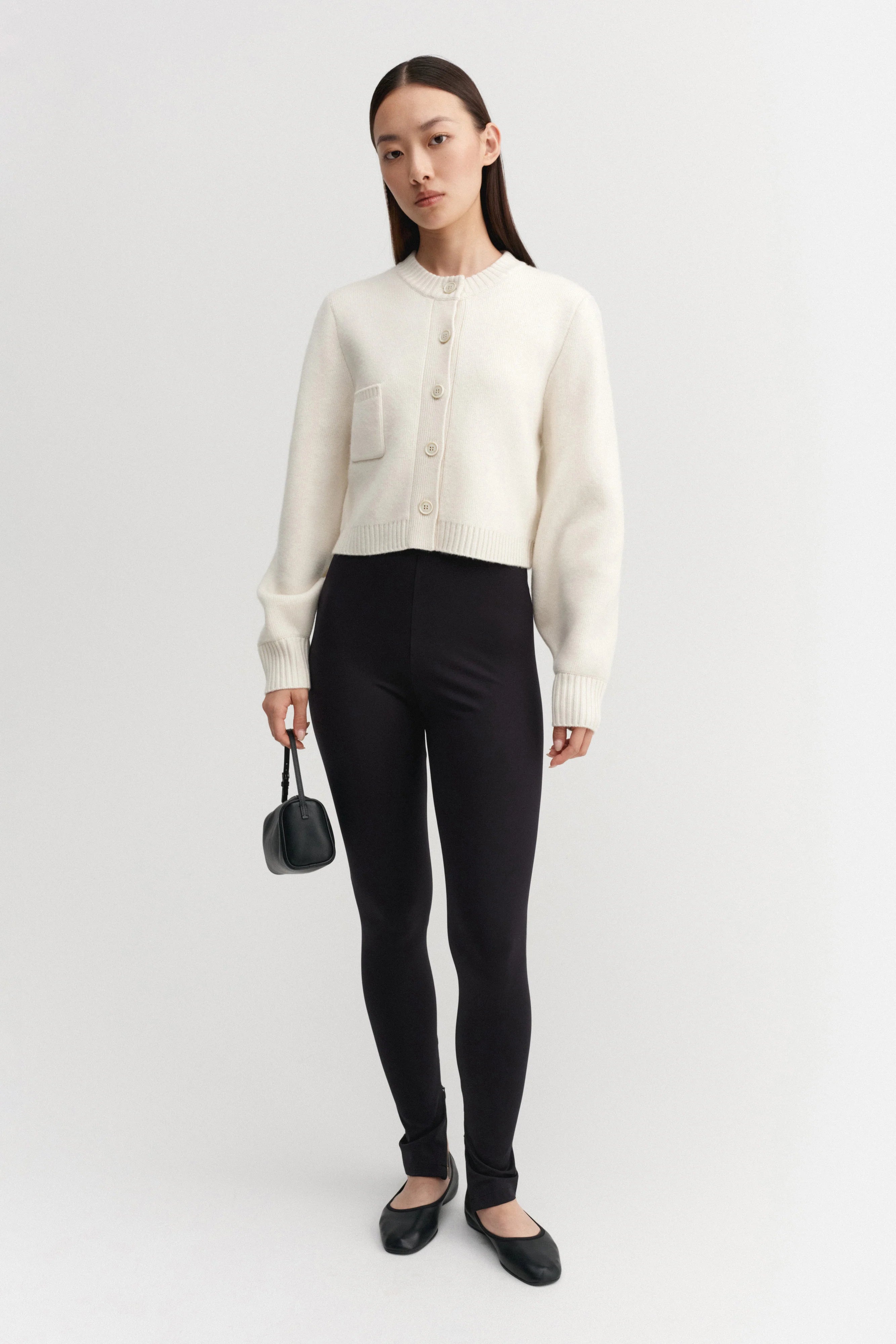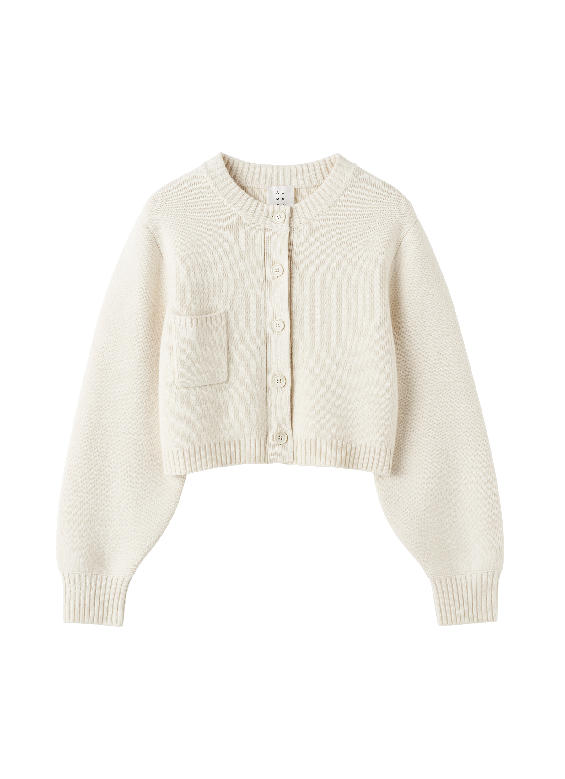 Almada Zozo Cardigan in Cream. Zozo Cardigan is densely knitted from the softest cashmere and merino wool blend. The cardigan is designed for a slightly boxy and loose fit with a cropped silhouette. The cardigan is featured with a classic crew neckline, dropped shoulders, tonal buttons and a little patch pocket. Rib-knitted detailing in cuffs, hem and the pockets.