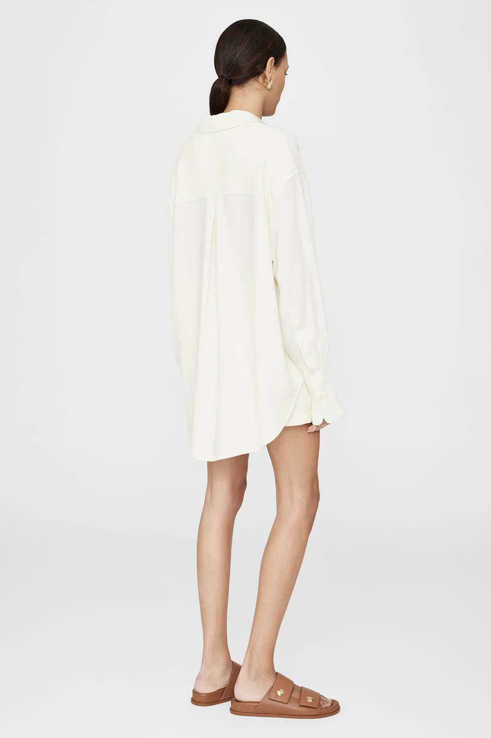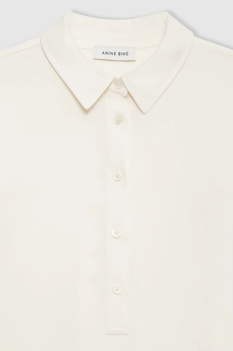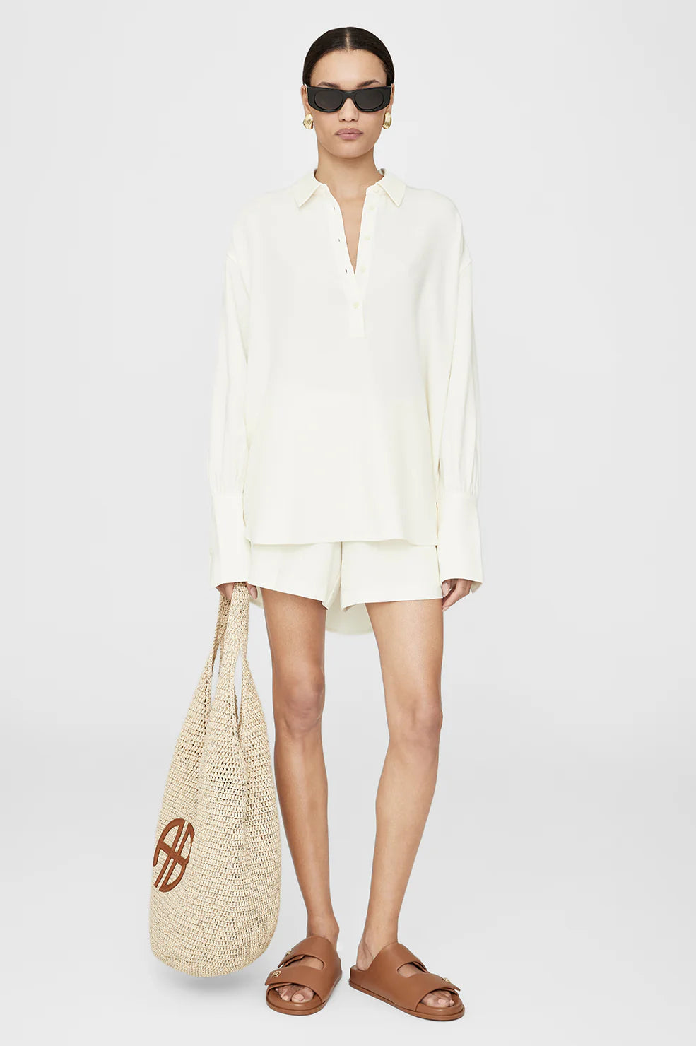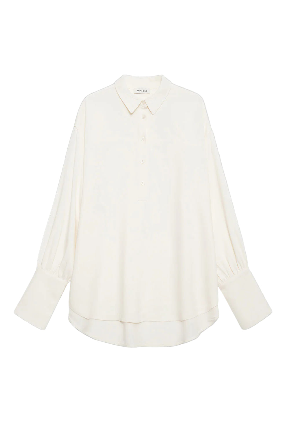 A tailored blouse made from a midweight viscose-crepe fabrication in ivory. The Lake Pullover Shirt features subtle dropped shoulder seams, a half placket, and long sleeves with wide cuffs.