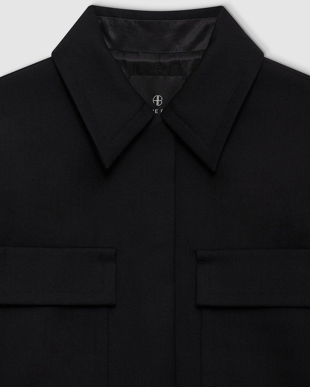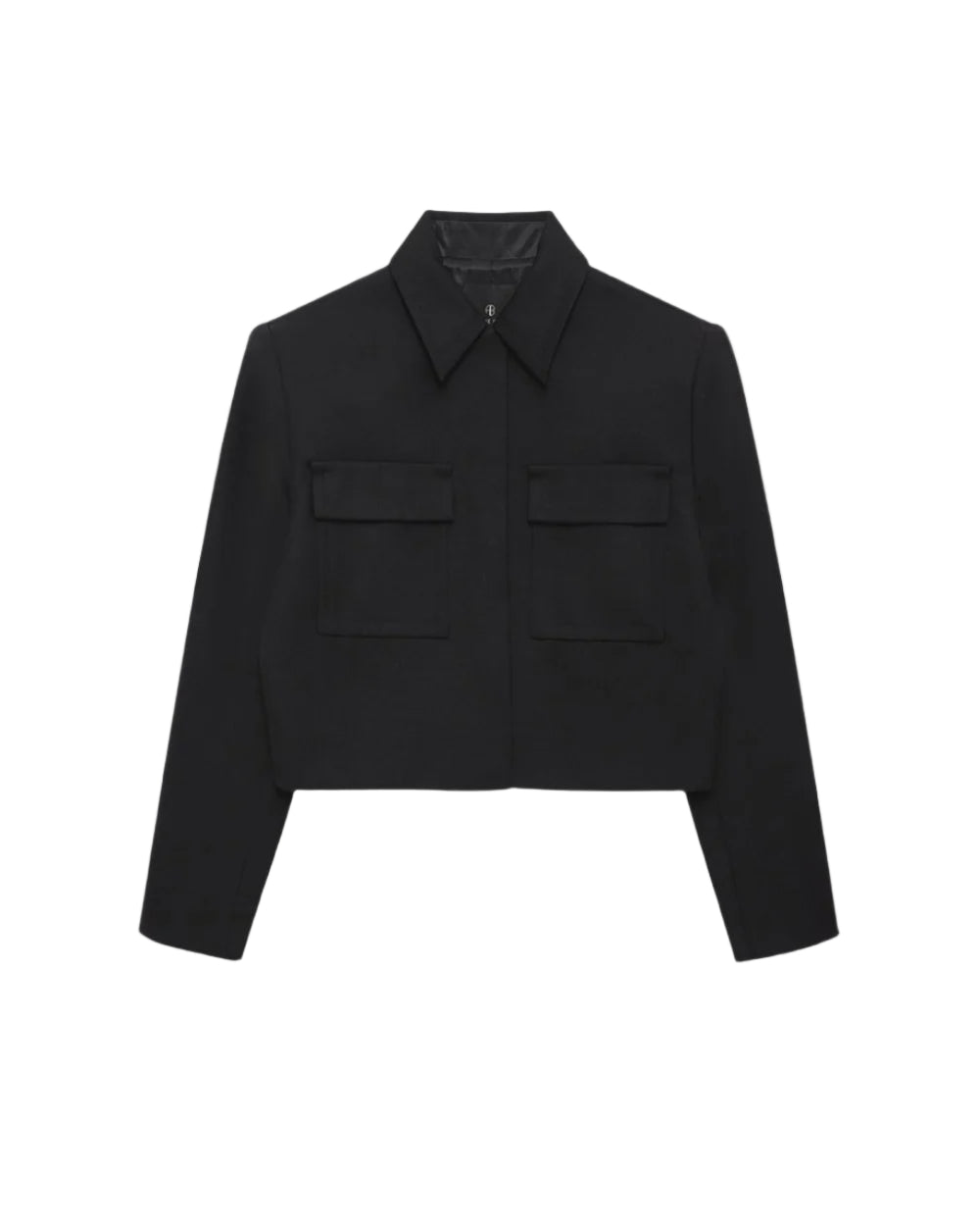 Anine Bing Dayton Jacket in Black. Boxy, tailored cropped lined jacket, crafted from a midweight wool polyester blend suiting. Featuring a standard collar, padded shoulders, two front square pockets with flap and hidden button placket closure at front.