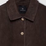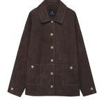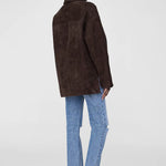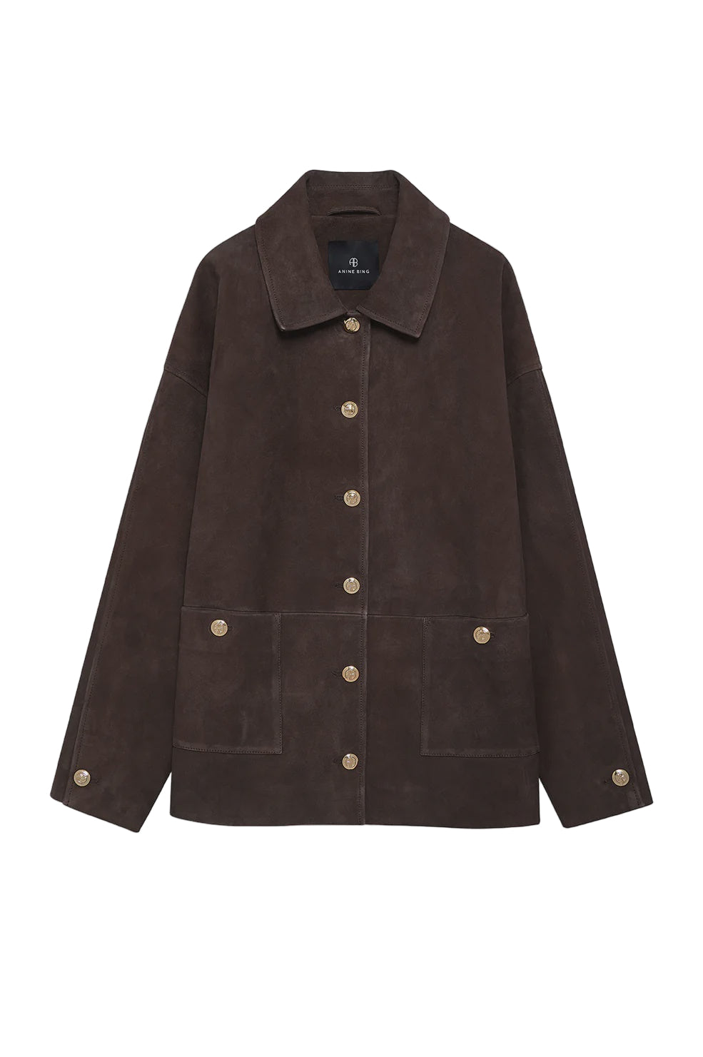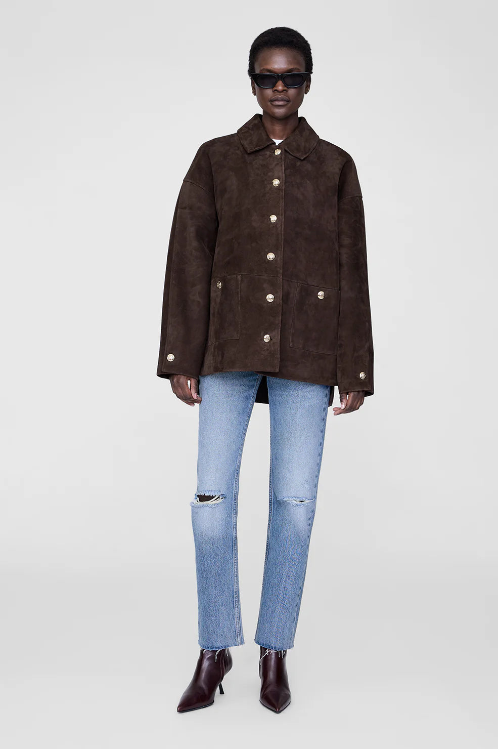 Anine Bing Luca Suede Jacket in Deep Brown. The suede Luca Jacket is a luxurious, everyday style that features two patch pockets at the hips, dropped armholes, and side slits for effortless layering. Gold buttons with ANINE BING engraving adorn the center-front placket and each cuff, adding an elevated look.