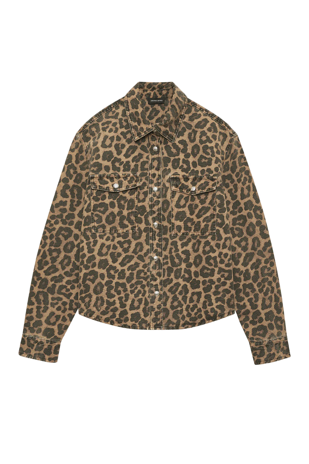 Anine Bing Paxton Shirt in Black and Brown Leopard. The Paxton Shirt is constructed from a midweight, rigid cotton denim blend without stretch in a vintage-inspired leopard. This modern workwear staple features wide shoulders, two patch pockets at the chest and front placket complete with branded snap buttons.