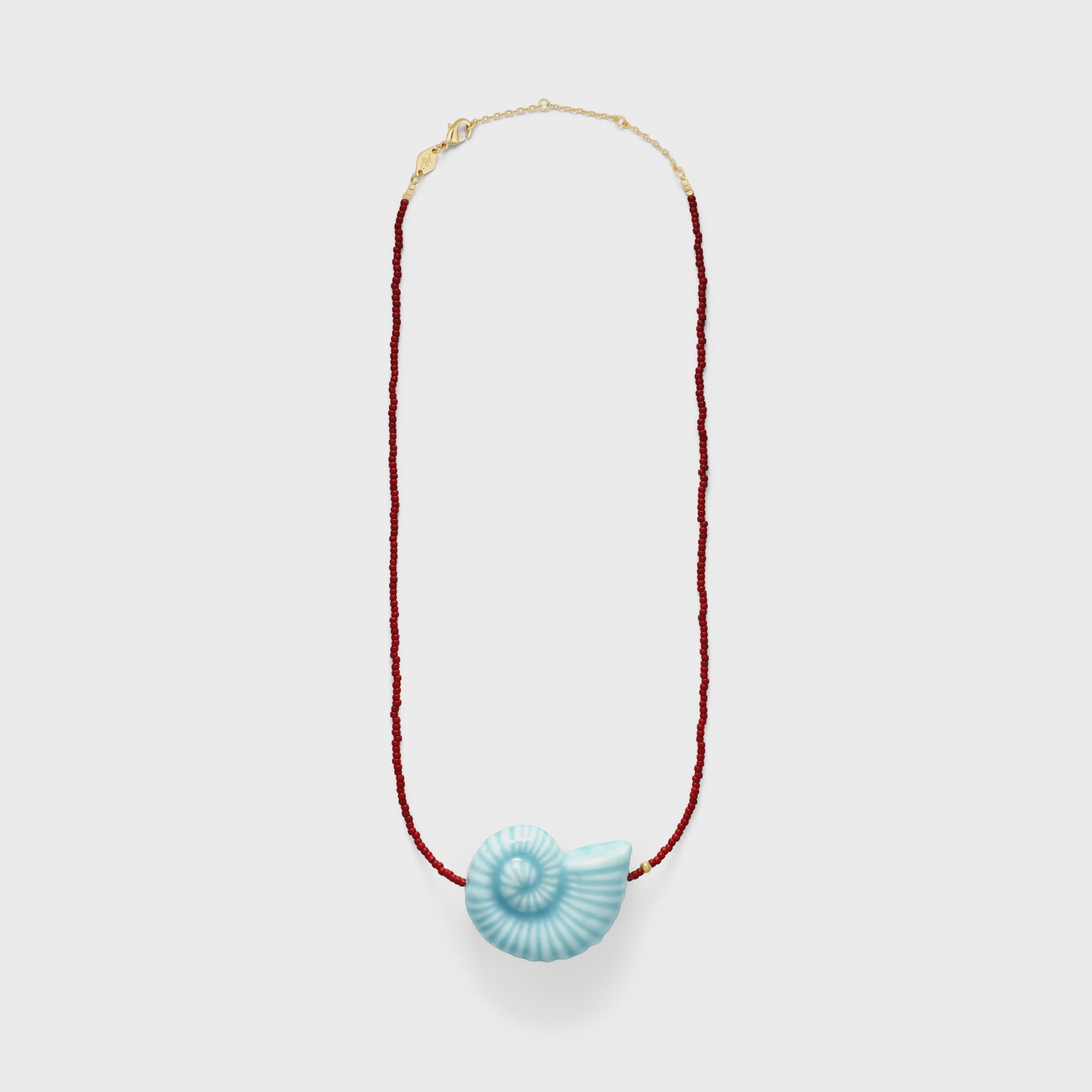 Anni Lu Nautilus Necklace in Seafoam Berry. The Nautilus Necklace is inspired by the transformative nature of the nautilus shell, symbolising growth, home and evolution. Featuring a deep berry colored chain, this necklace captures the essence of the shell's expanding inner space, making it a meaningful and elegant statement piece.