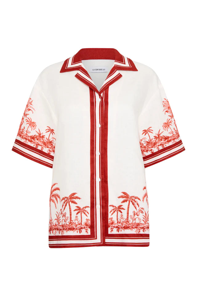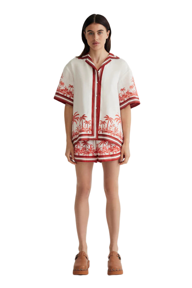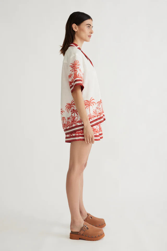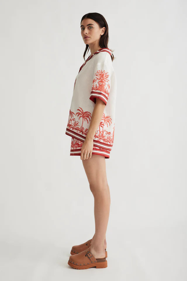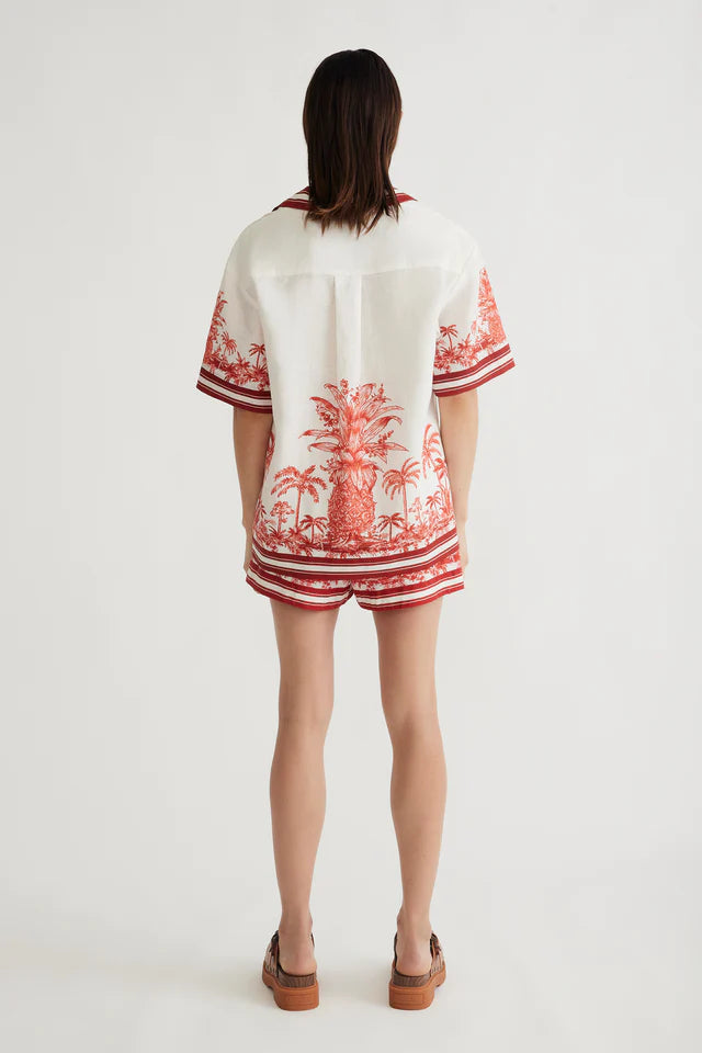 The Blythe Drop Shoulder Shirt is a striking embodiment of the picturesque Blythe print – an enchanting blend of lush palms and playful pineapples. The dropped shoulder design, combined with a button-up front, gives effortless chic. Pair with the Blythe Drawstring shorts.