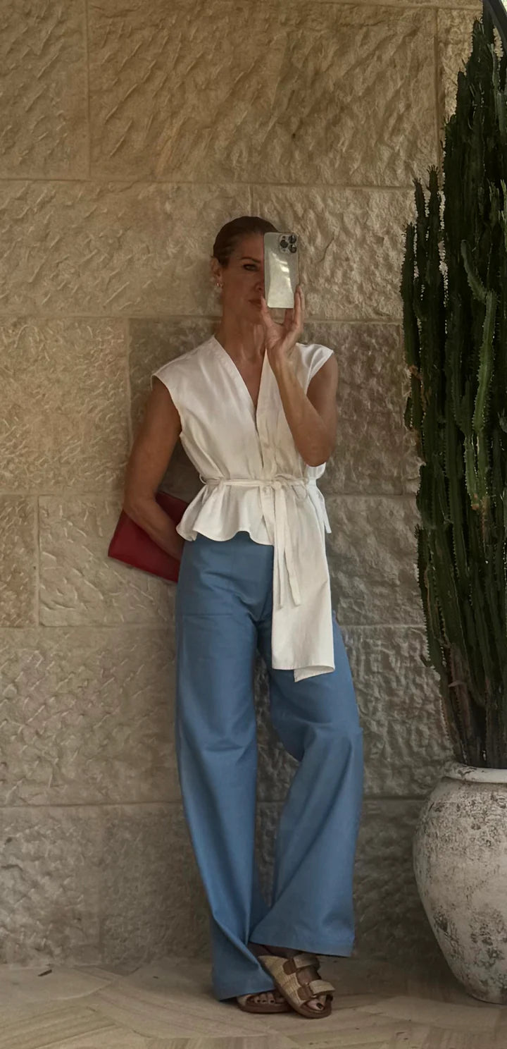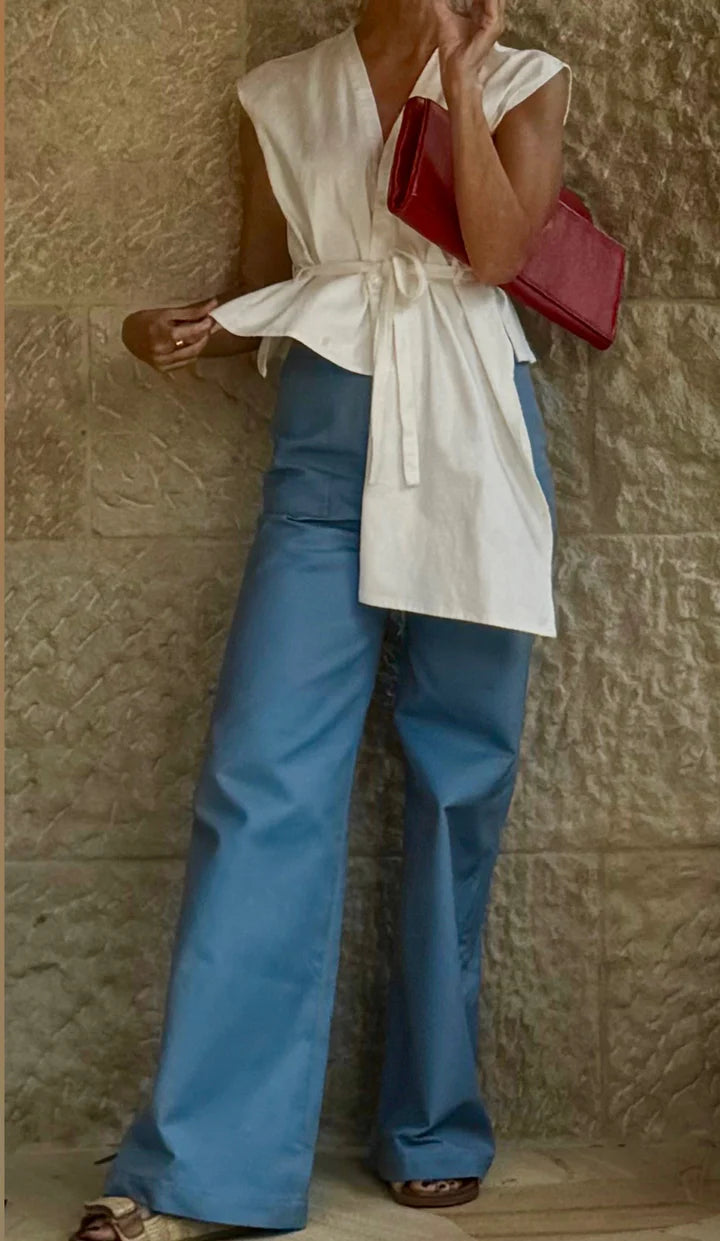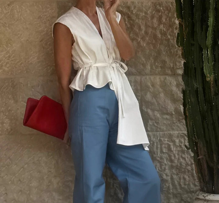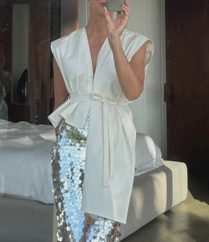 The Seraphine is a sleeveless asymmetrical blouse featuring a button up front with waist tie and breast pocket.
