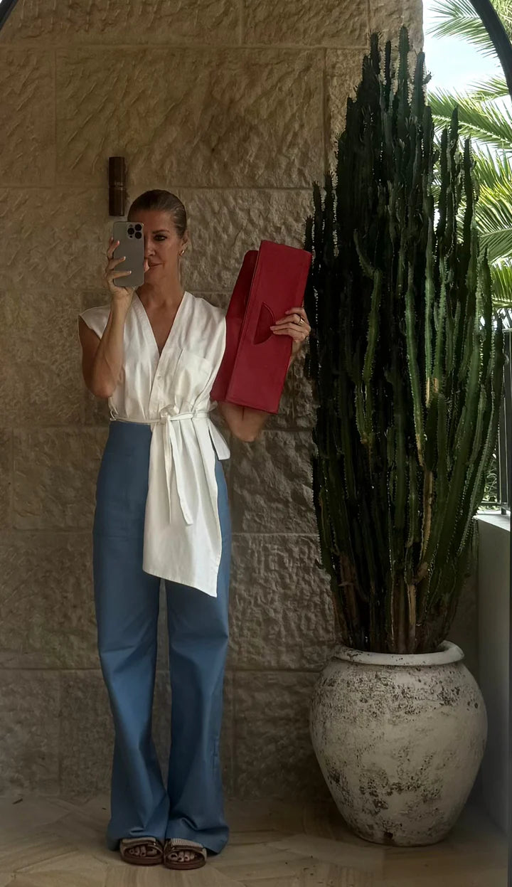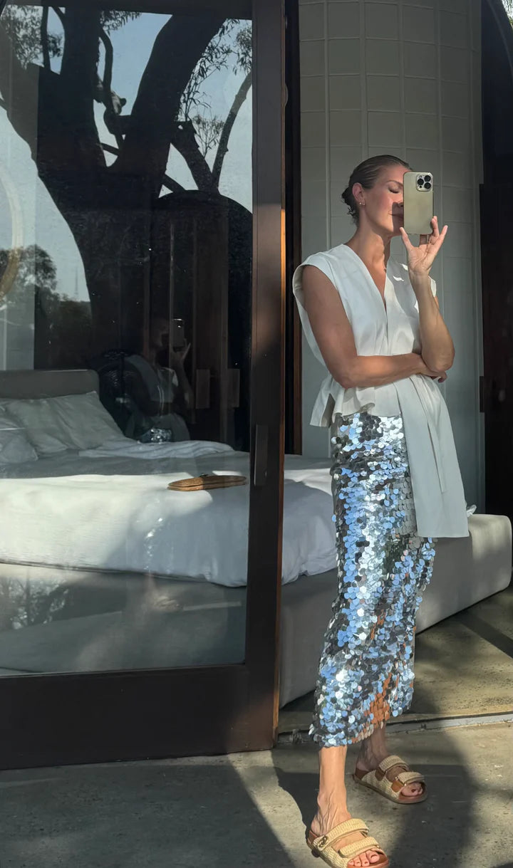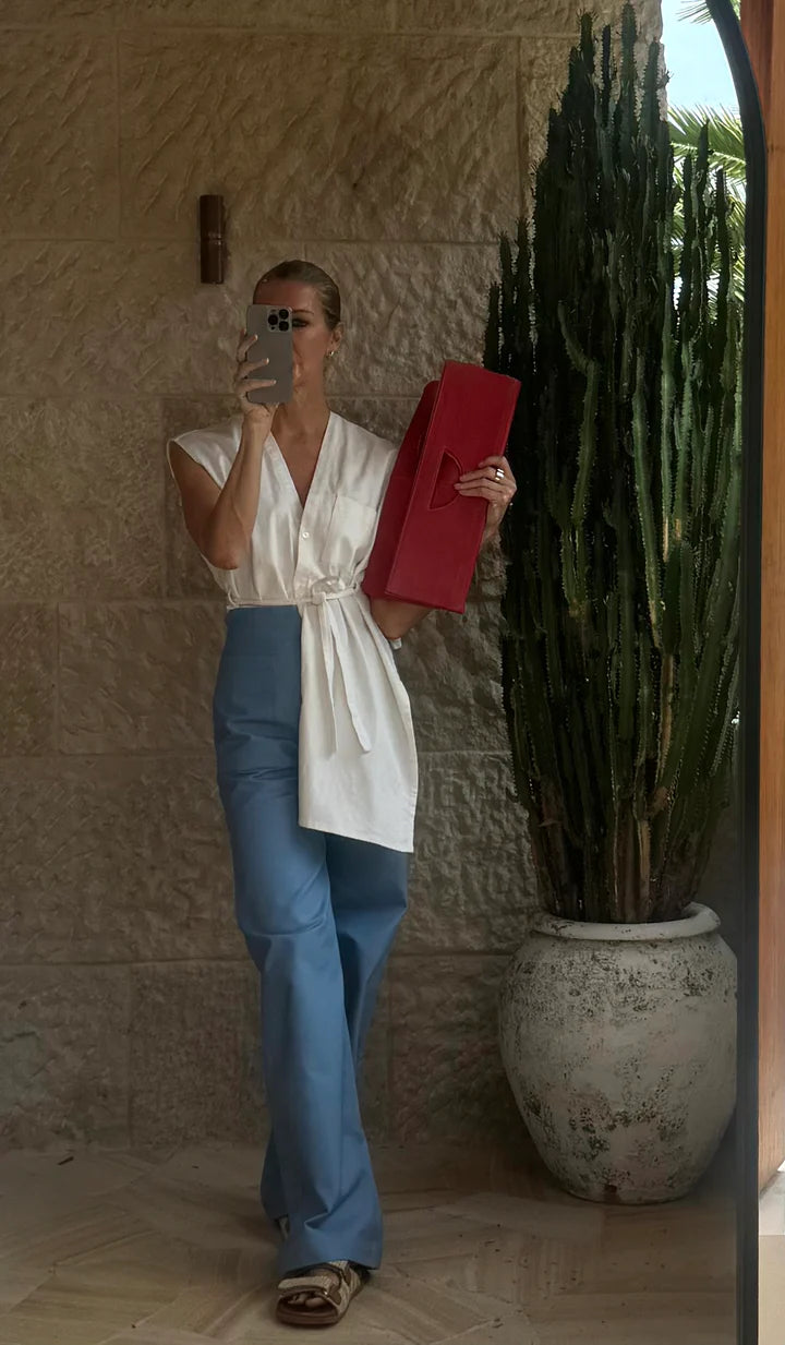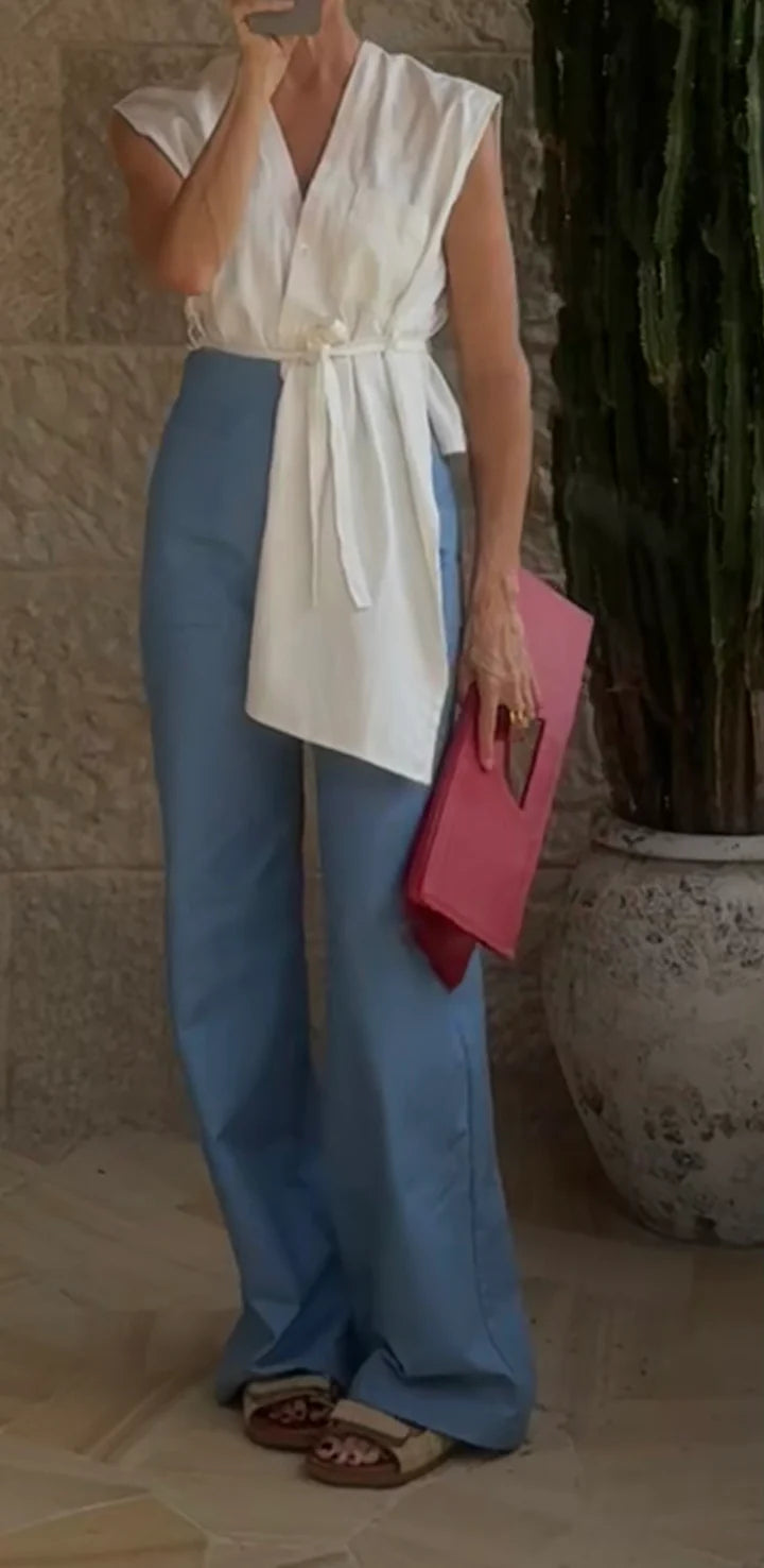 The Seraphine is a sleeveless asymmetrical blouse featuring a button up front with waist tie and breast pocket.