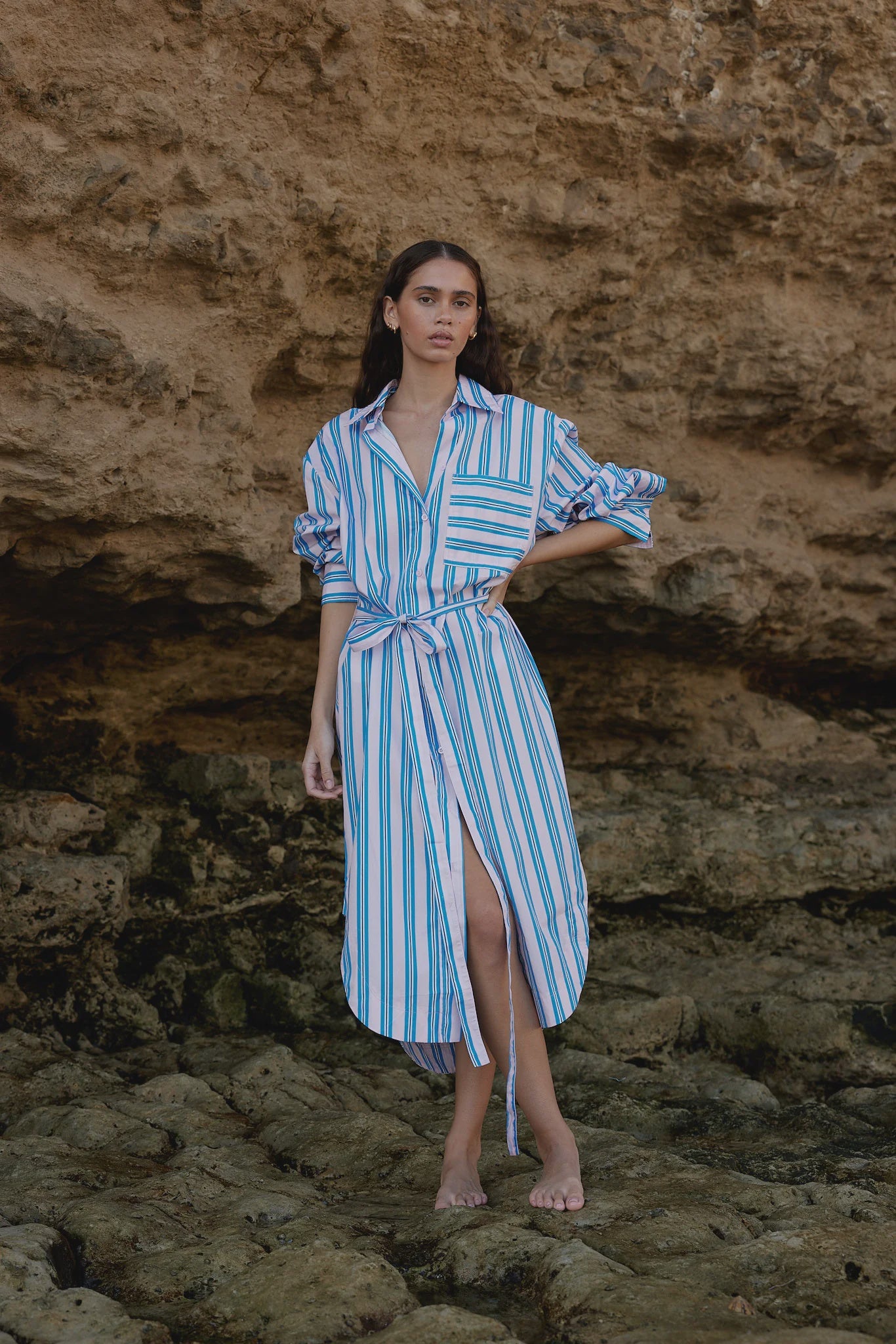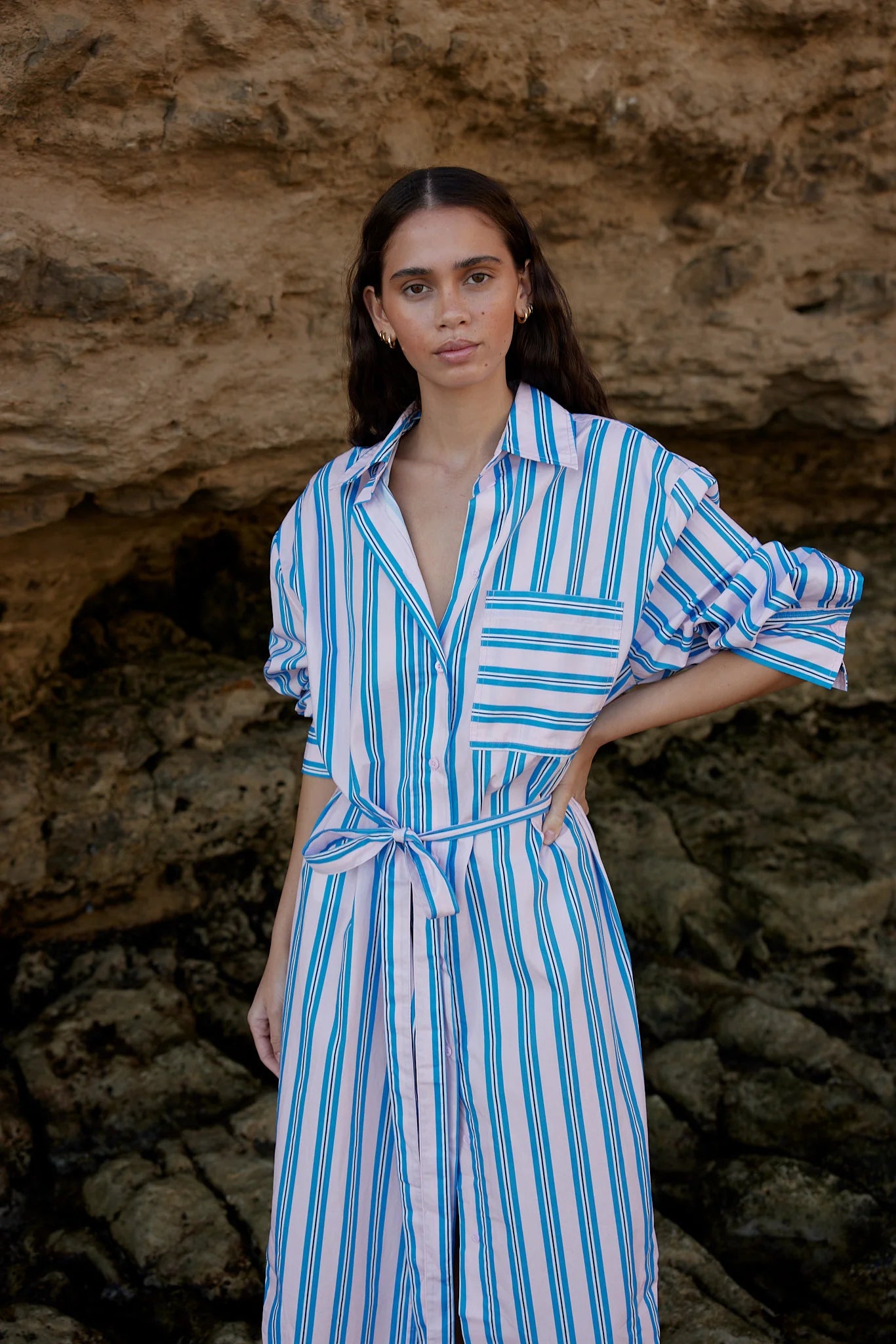 Aston Studio Billy Shirt Dress in Ocean Depths and Seashell Stripe. The Billy Shirt Dress is the epitome of effortless style, featuring an oversized button-up design that falls gracefully to a midi length. Complete with a matching belt to define your silhouette, this dress showcases our new Ocean Depth/Seashell stripe—a joyful yet subtle blend of colors that exudes elegance. Perfect for any occasion, the Billy Shirt Dress combines comfort and sophistication seamlessly.