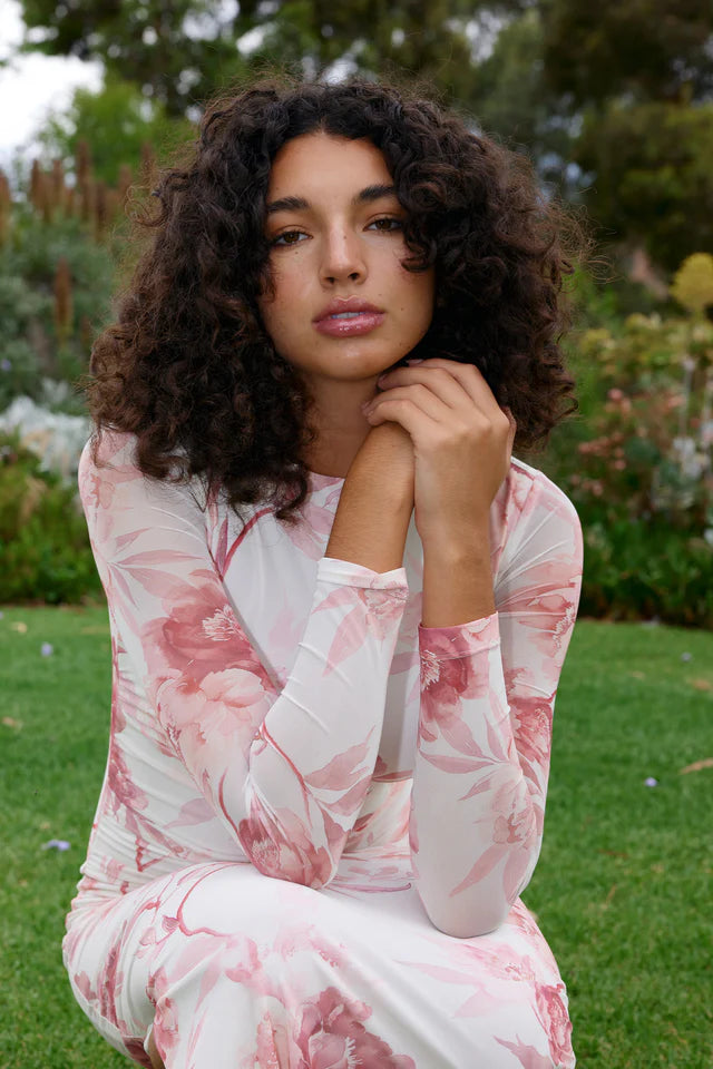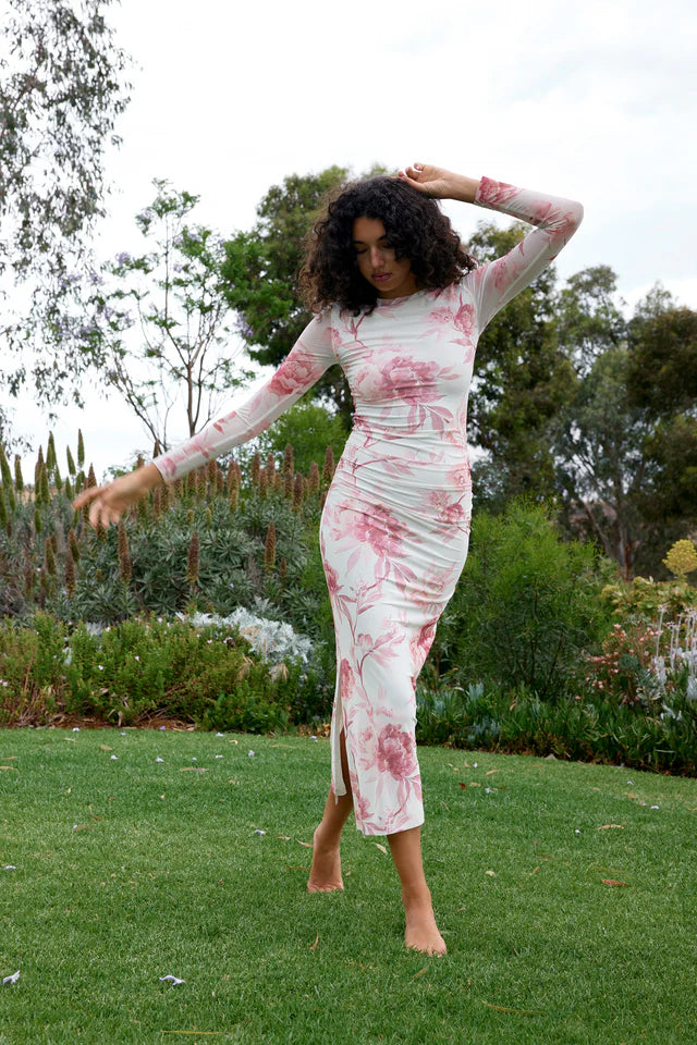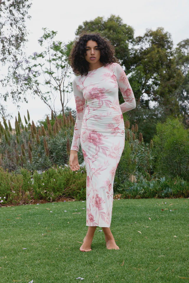 Step into effortless elegance with the stunning Ezli Mesh Dress, featuring a soft pink floral print on a sheer, figure-hugging silhouette. With delicate ruching that enhances your curves and long sleeves for a touch of sophistication, this dress is the perfect blend of romance and modern allure. Ideal for special occasions or an elevated everyday look.