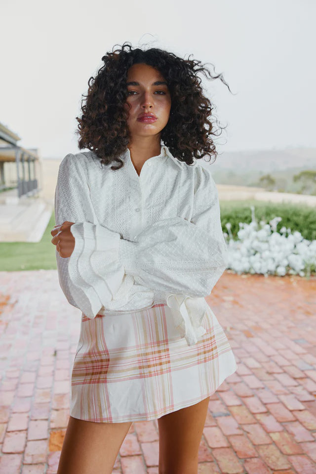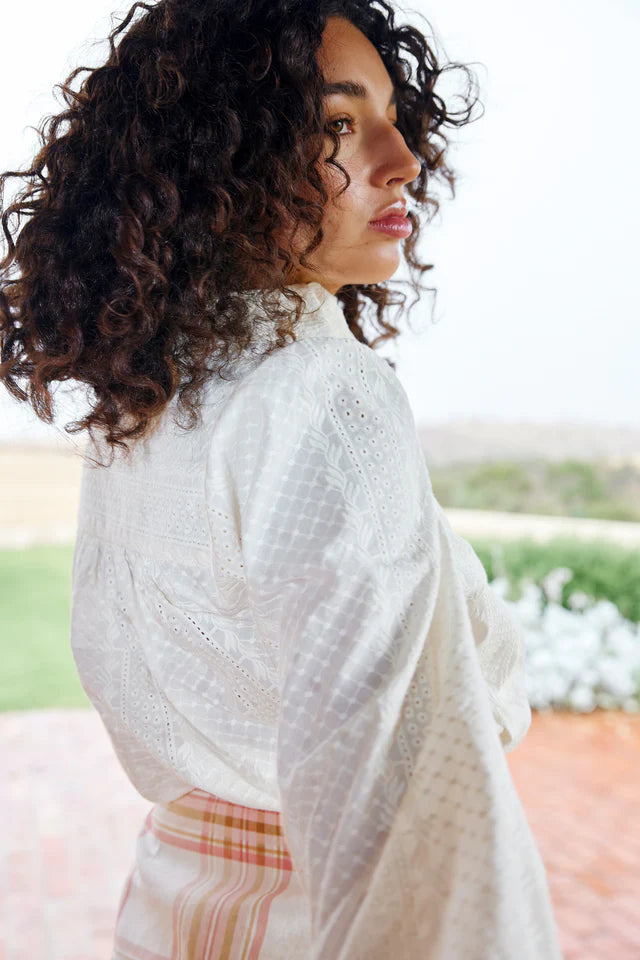 Romantic and refined, this white blouse features delicate lace and button details for a timeless appeal. Designed with voluminous sleeves and soft ruffle cuffs, it offers an effortlessly elegant silhouette. The button-down front and intricate embroidery add a touch of vintage charm, making it the perfect pairing with tailored trousers or a playful mini skirt.
